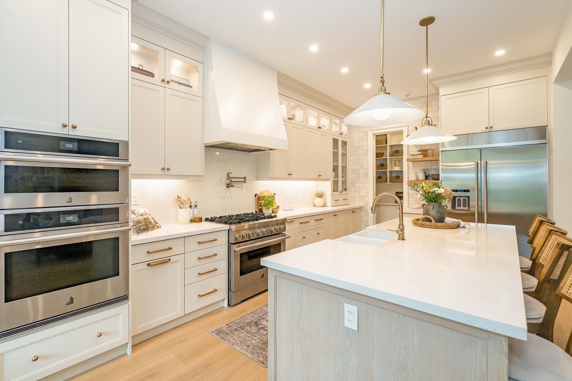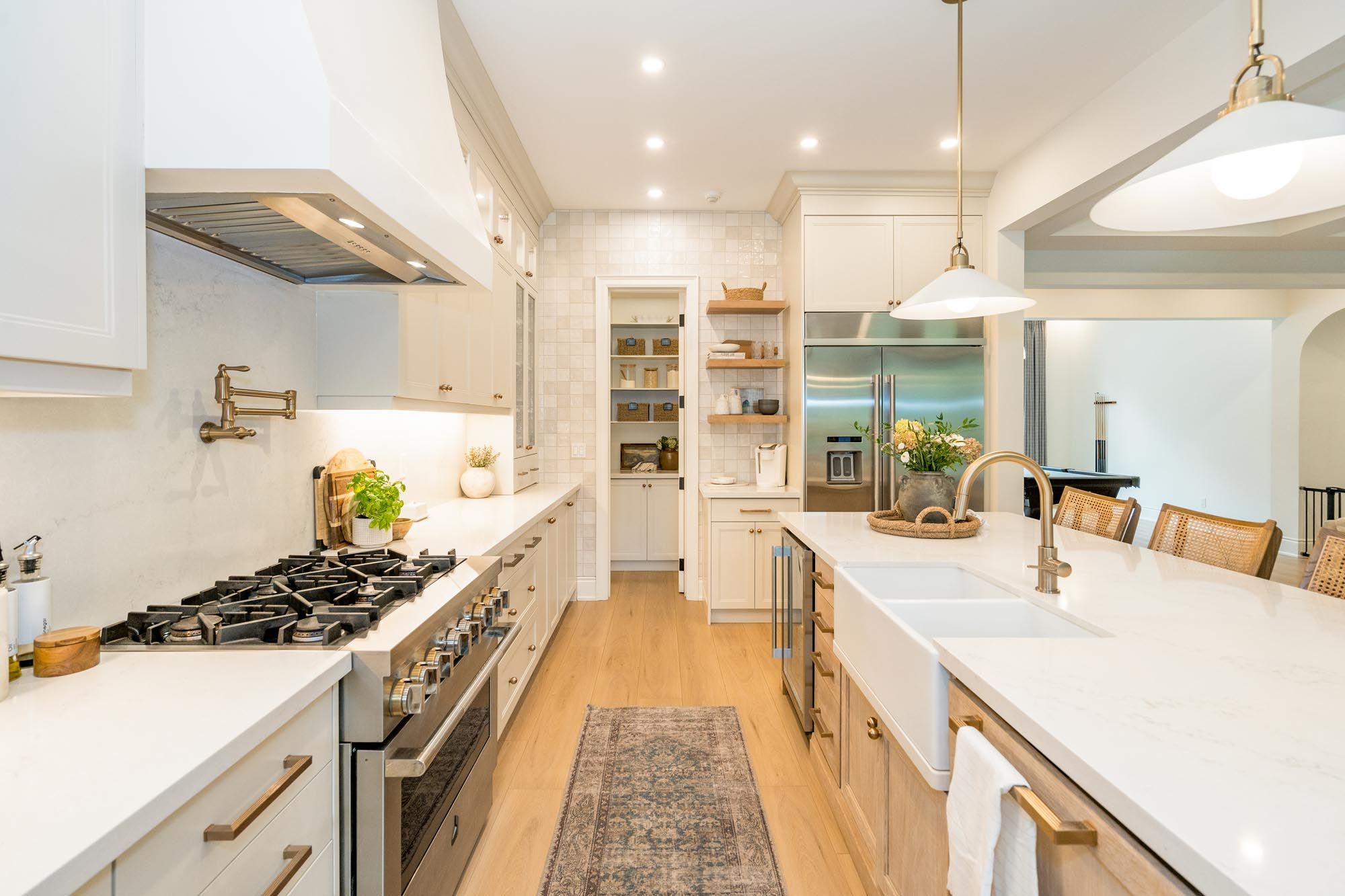 • Gourmet kitchen with quartz countertops, custom cabinetry, and a walk-in pantry.