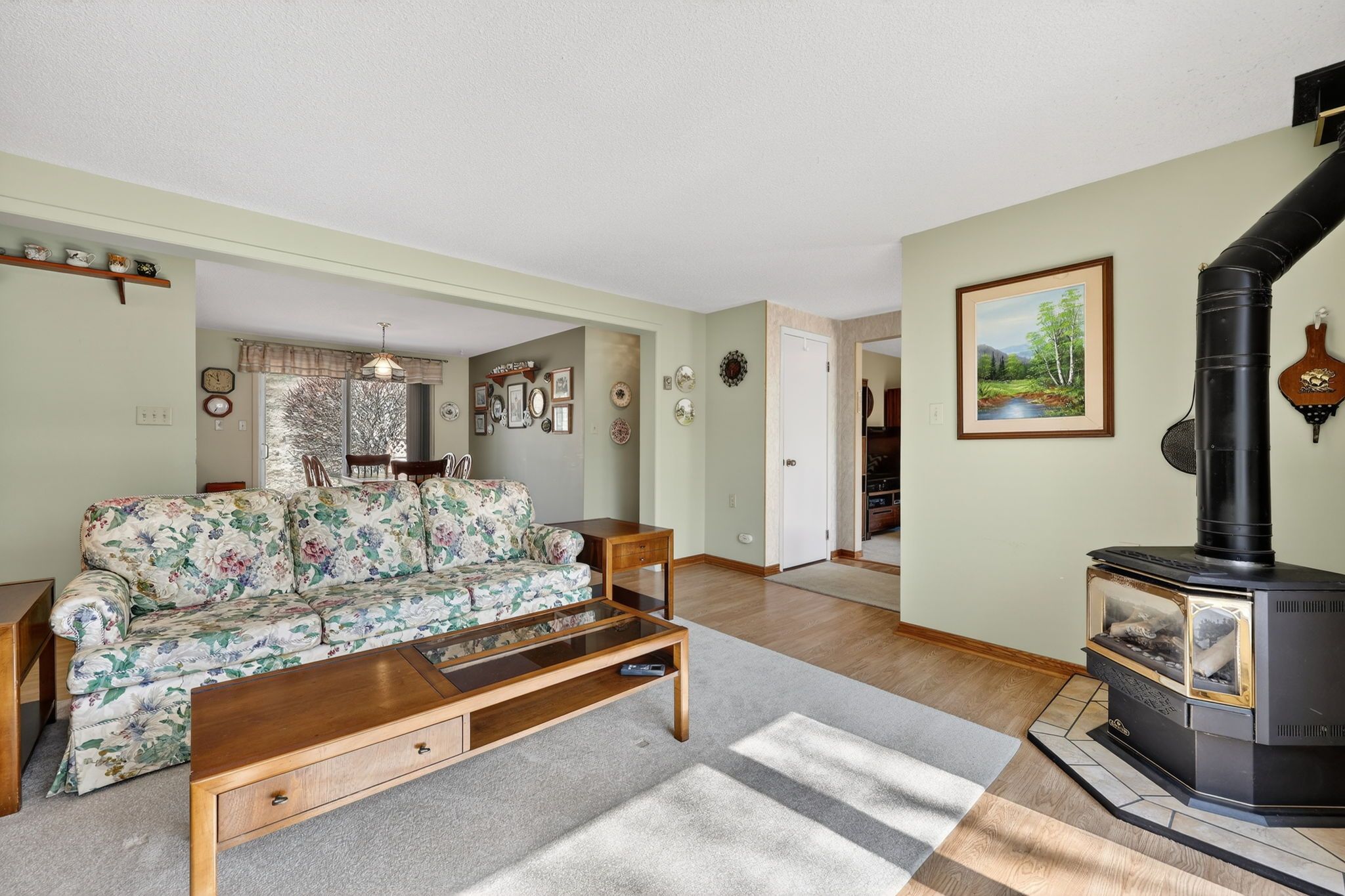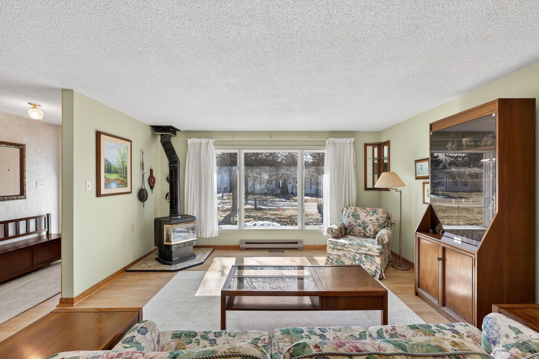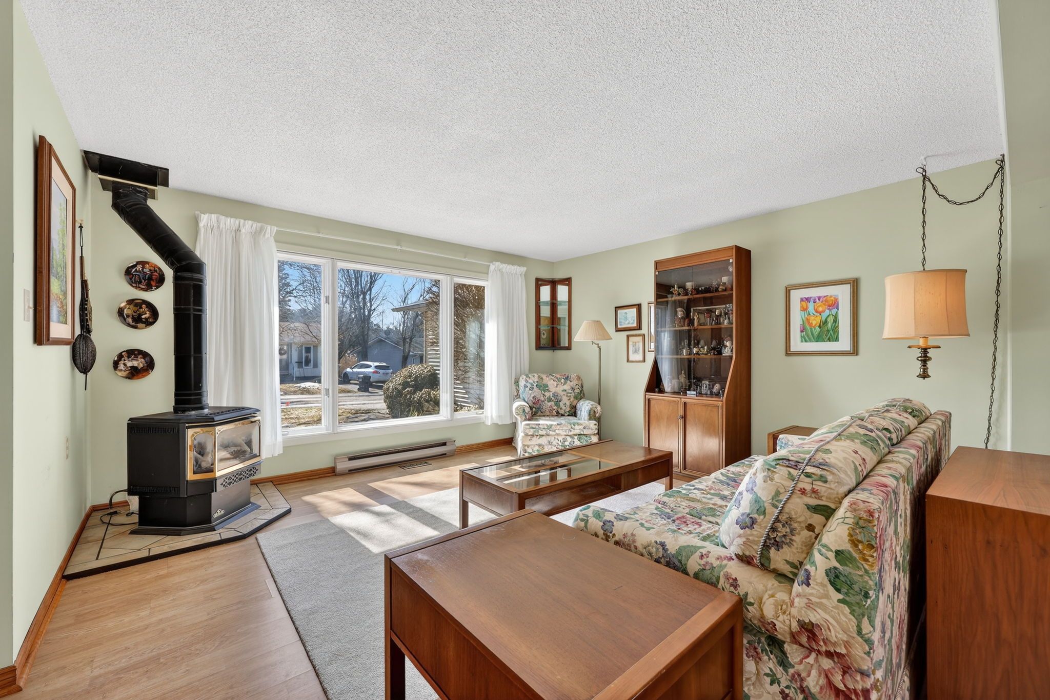 • Cozy gas fireplace in a sunny living space.