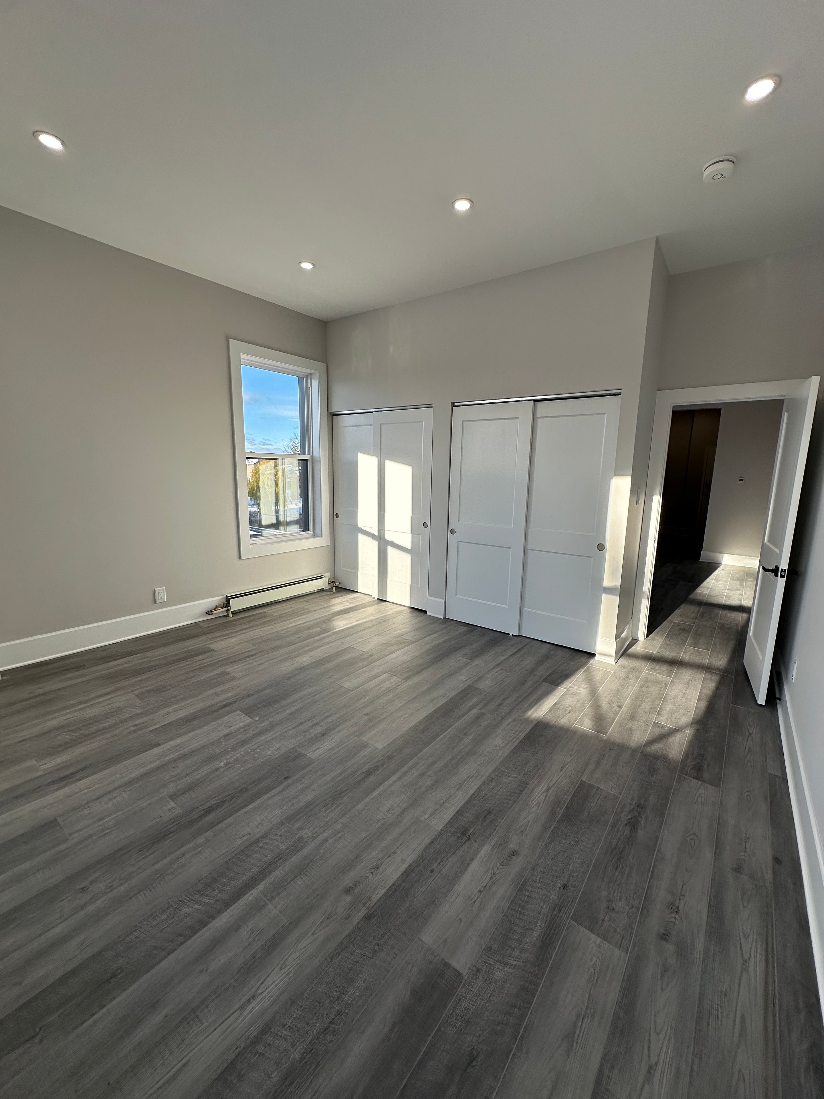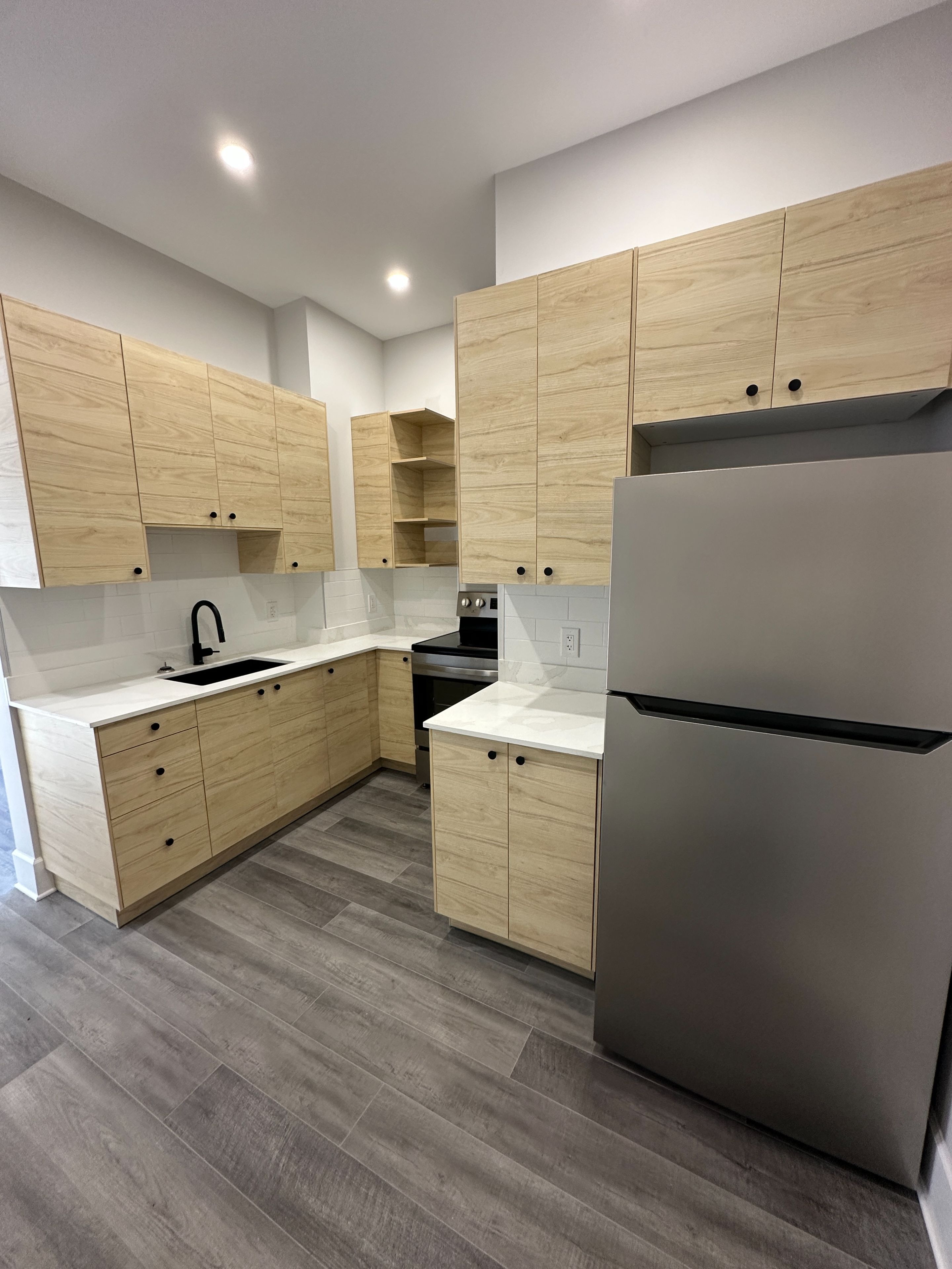 This beautifully renovated one-bedroom unit offers modern living in the heart of kemptville, ontario, with an easy commute to ottawa. The bright, open-concept layout features wide-plank flooring throughout, high ceilings, and recessed lighting that gives the space a clean, contemporary feel. The stylish kitchen showcases warm wood-grain cabinetry, stainless steel appliances, and a sleek black faucet-perfect for everyday cooking and entertaining. The spacious living area offers incredible natural light and flexible layout options. The large bedroom features double closets and oversized windows, creating a bright and comfortable retreat. The updated bathroom includes a full walk-in glass shower with subway tile surround, modern vanity, and neutral finishes. This fully renovated building includes a new sprinkler system for enhanced safety, updated common areas, and shared coin-operated laundry on-site. Heat and water are included, street parking is available, and appliances are provided. No smoking. Available immediately. Rental application and references required.