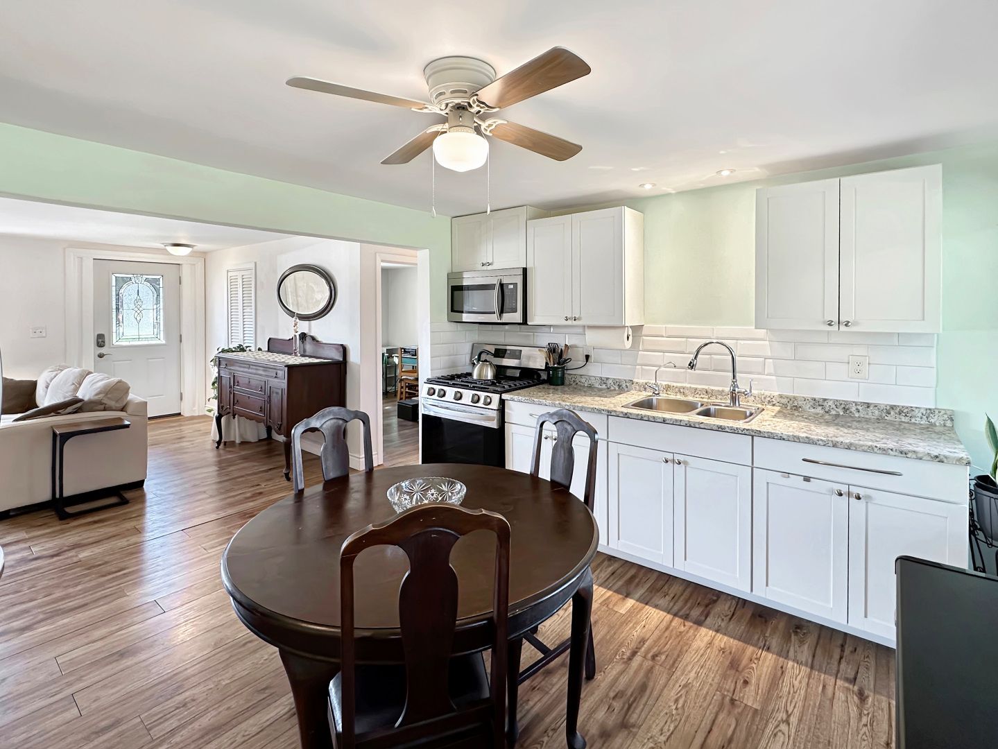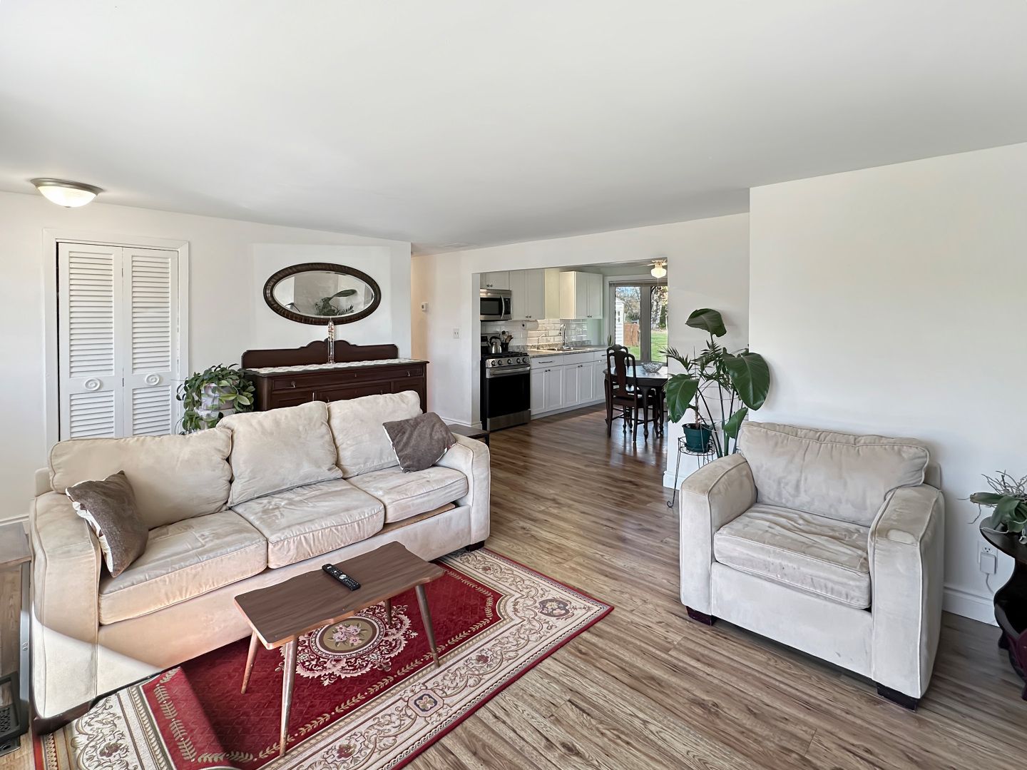 • Generous eat-in kitchen and sun-filled living room with large windows.