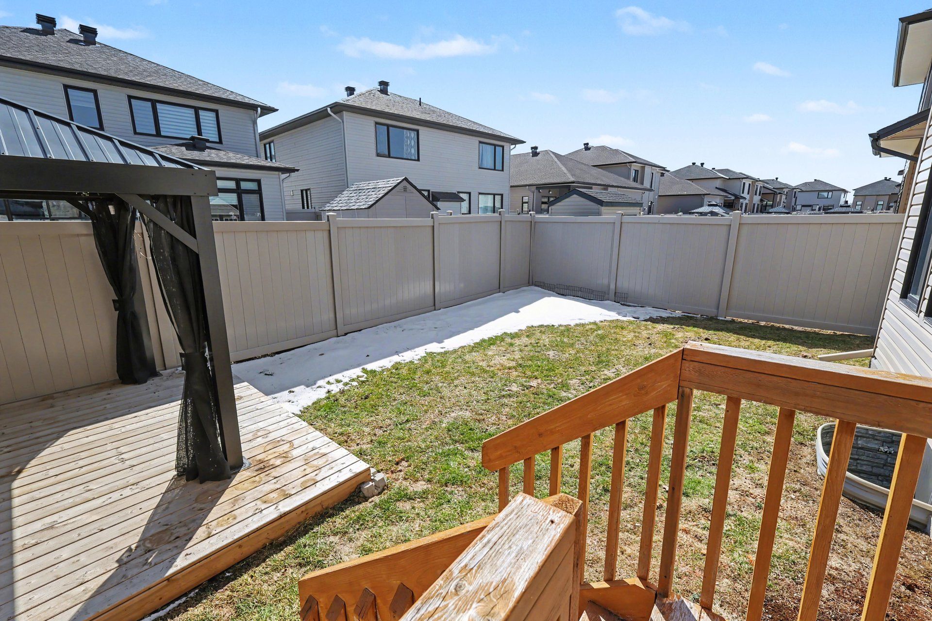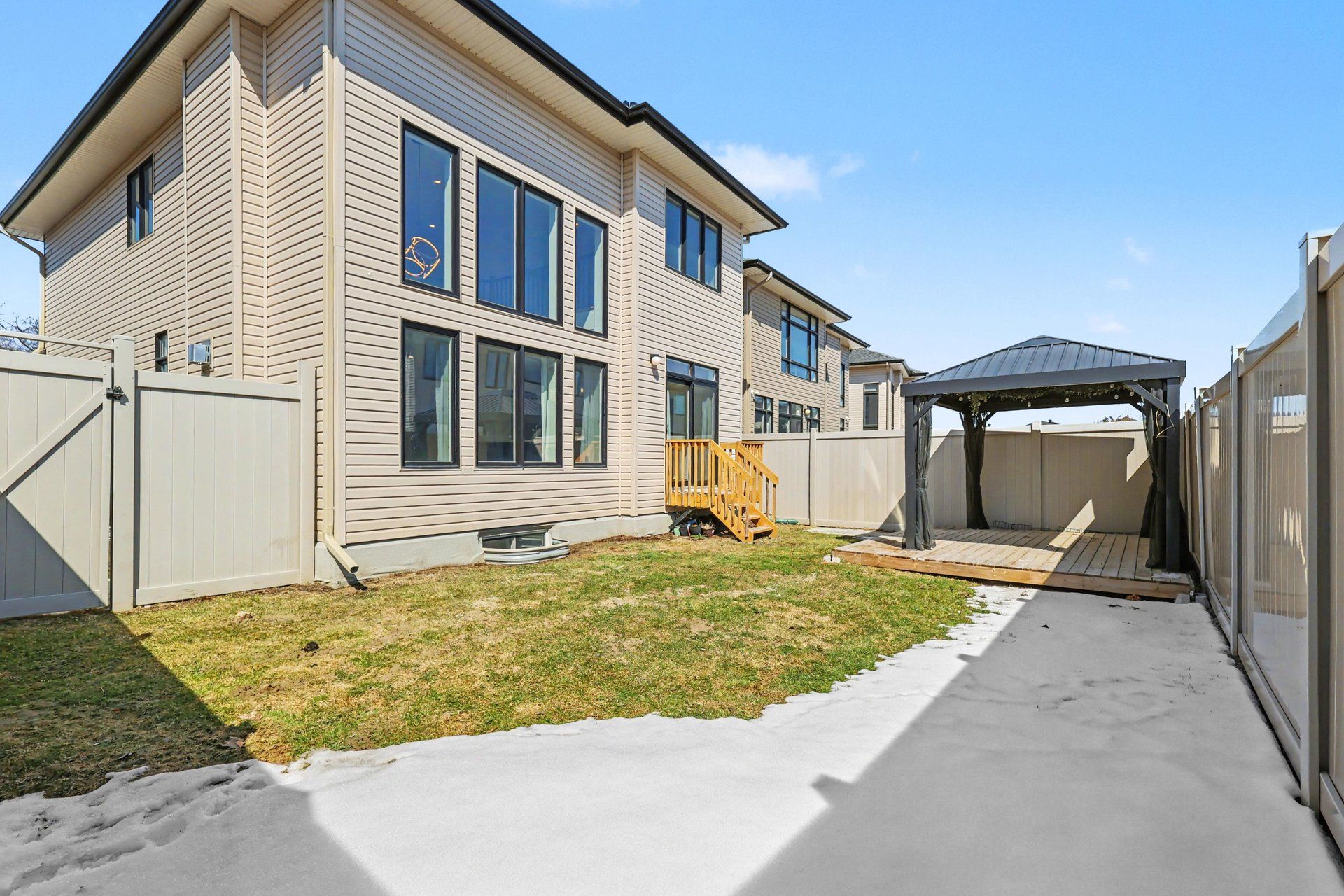 • Fully fenced backyard with a private deck and gazebo for relaxation.