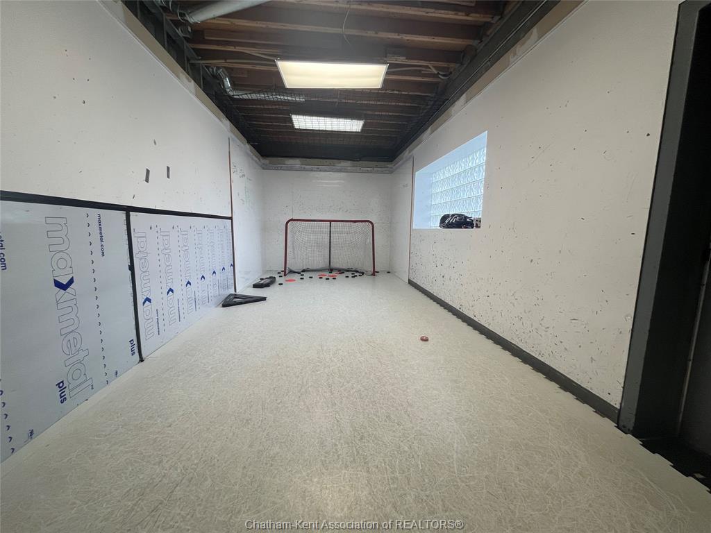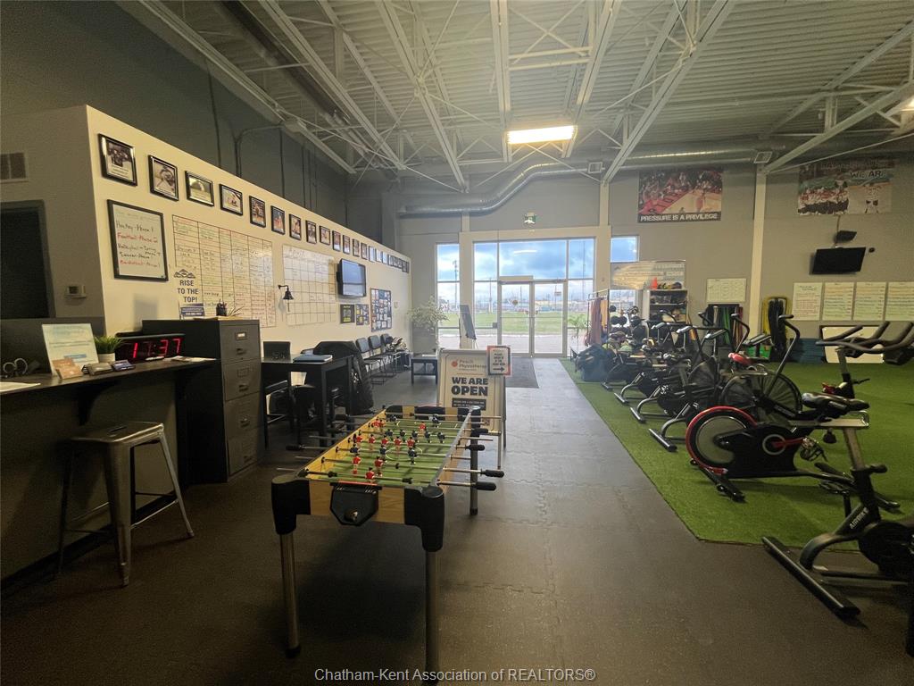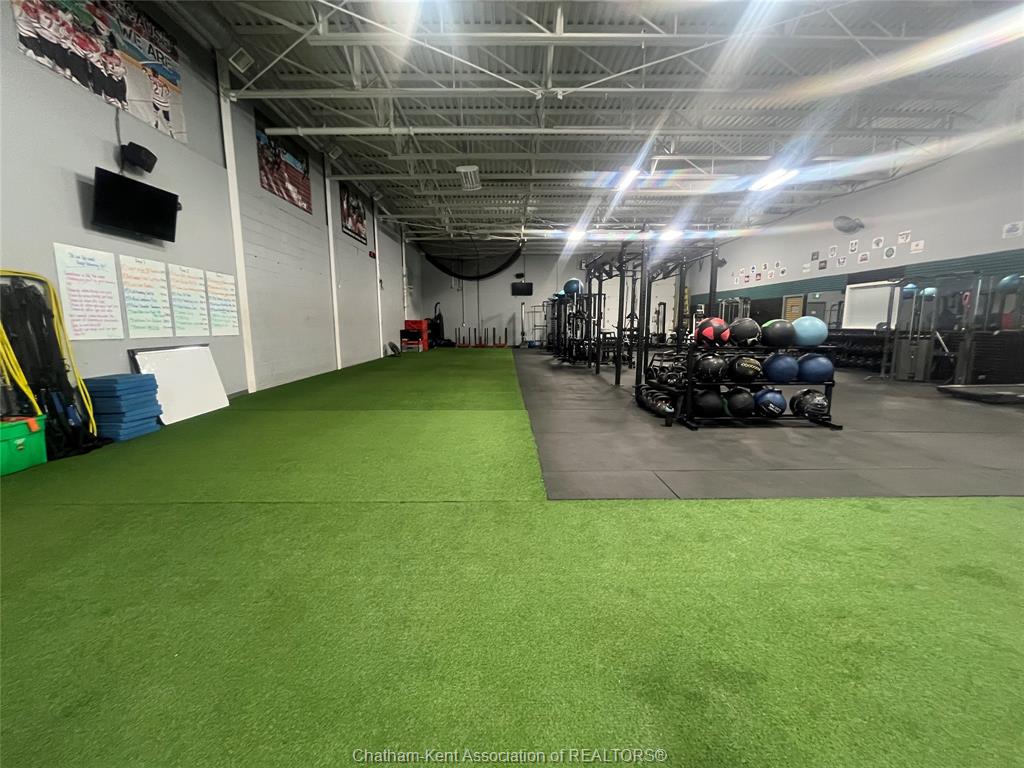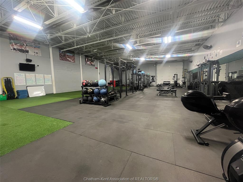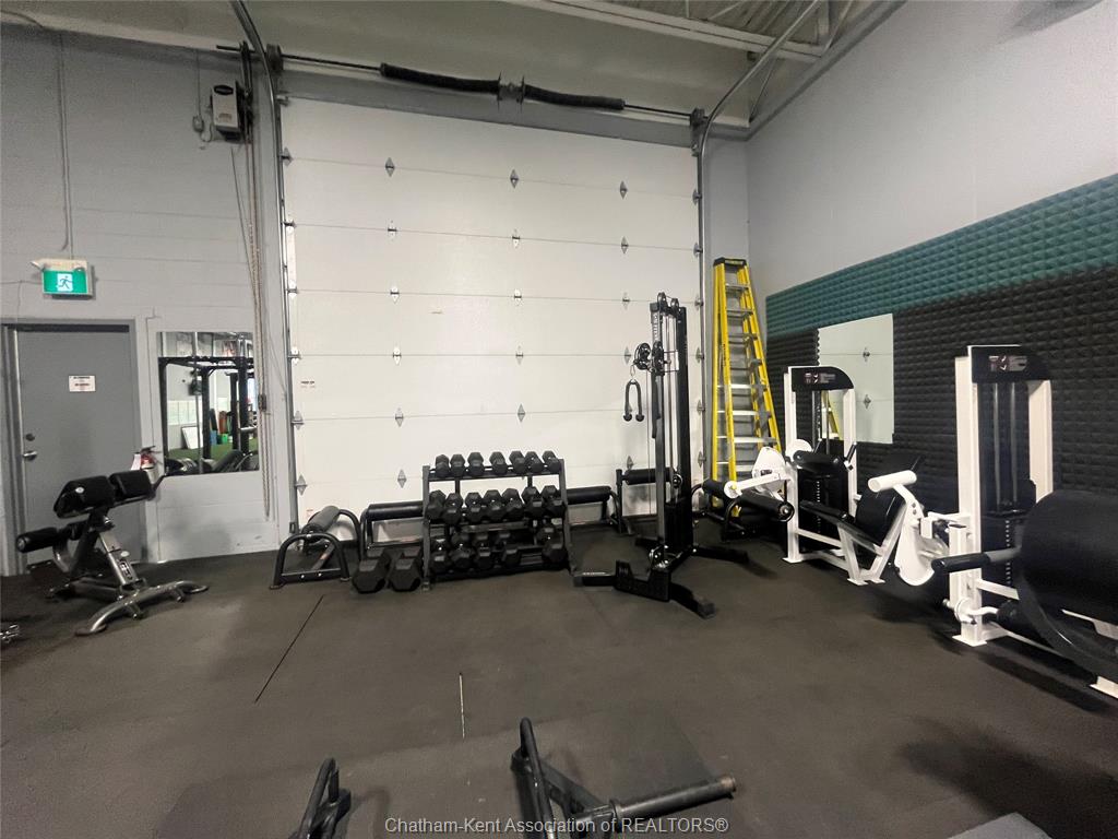 • Large open-concept area with high ceilings, currently set up as a gym.