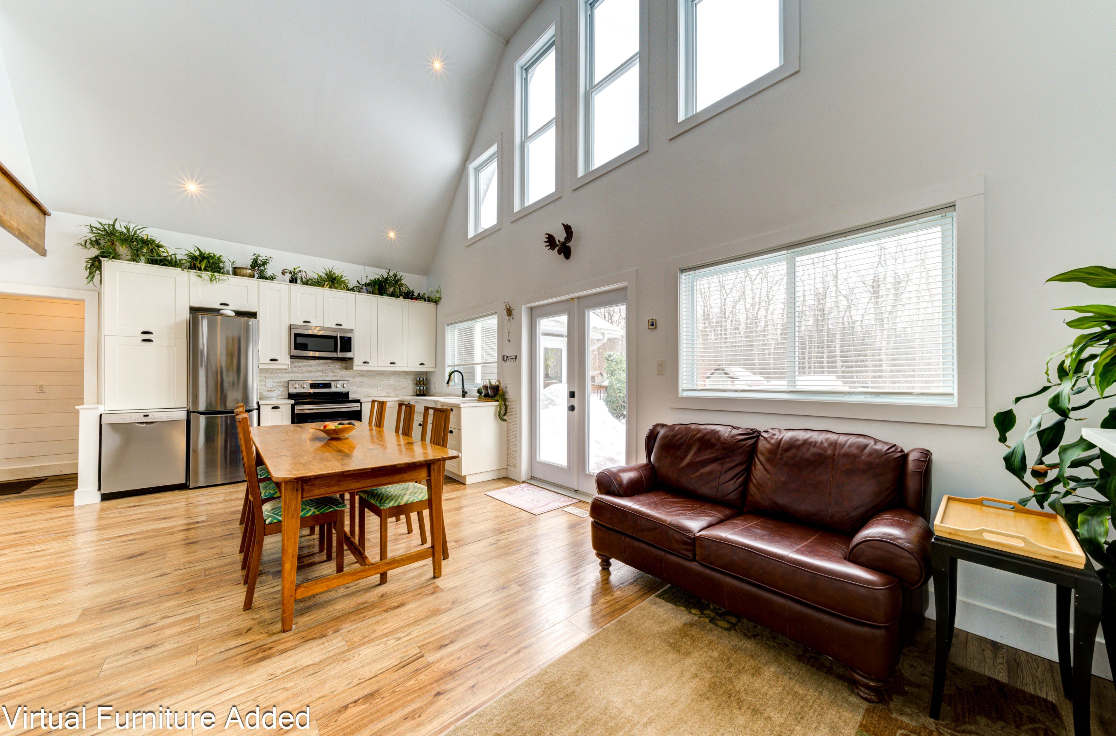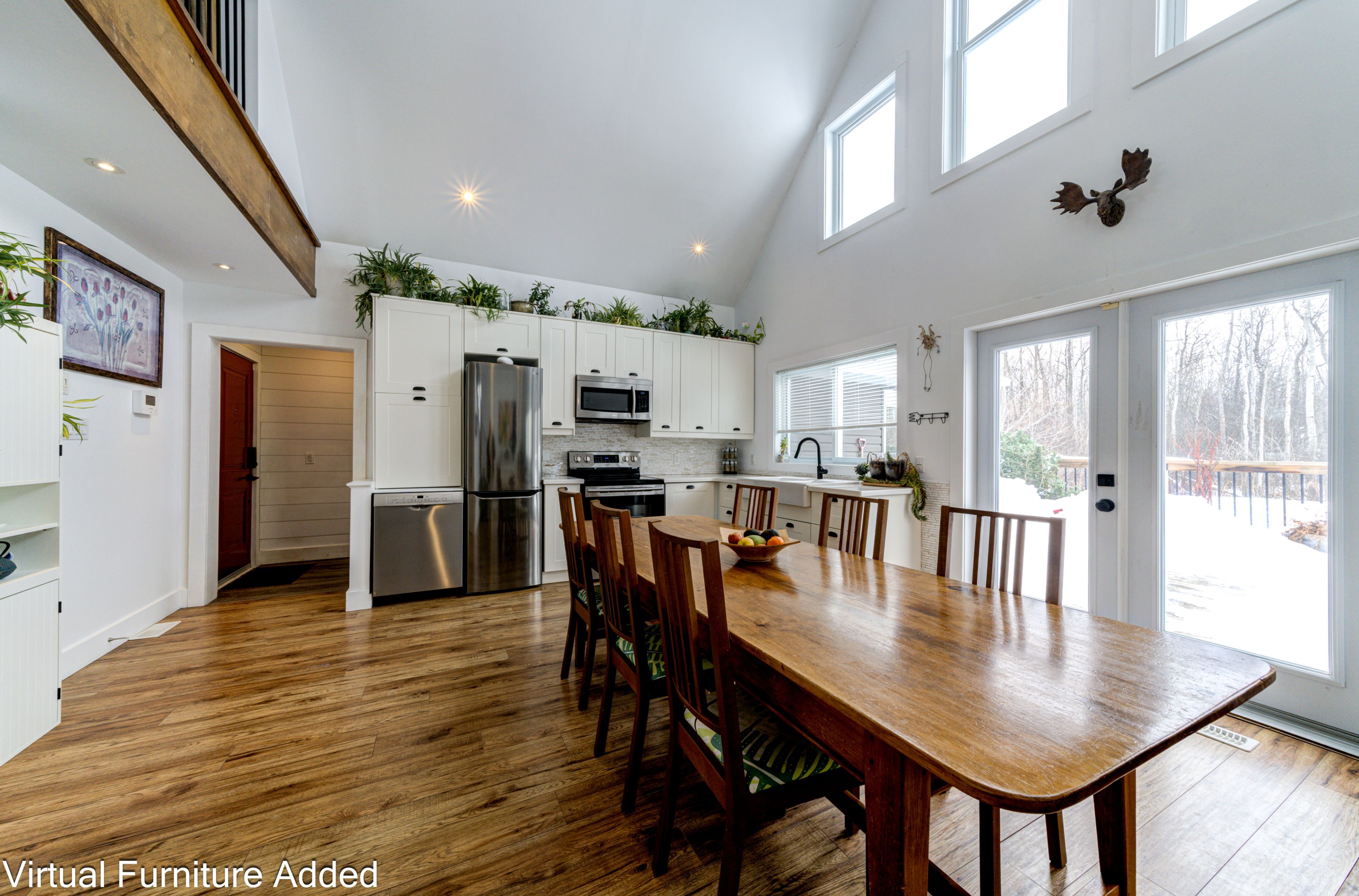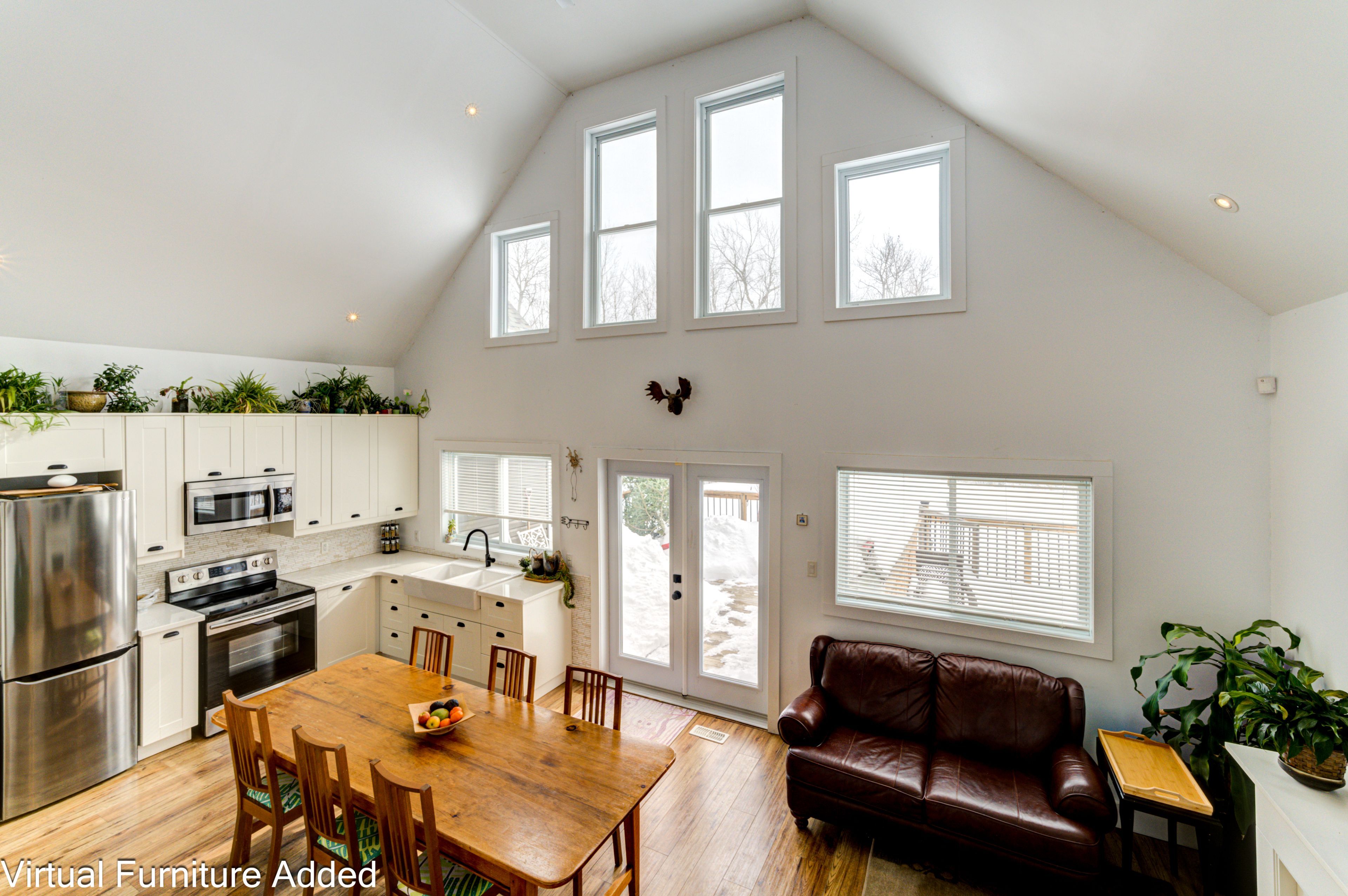 • Bright kitchen with cathedral ceilings and large windows for natural light.