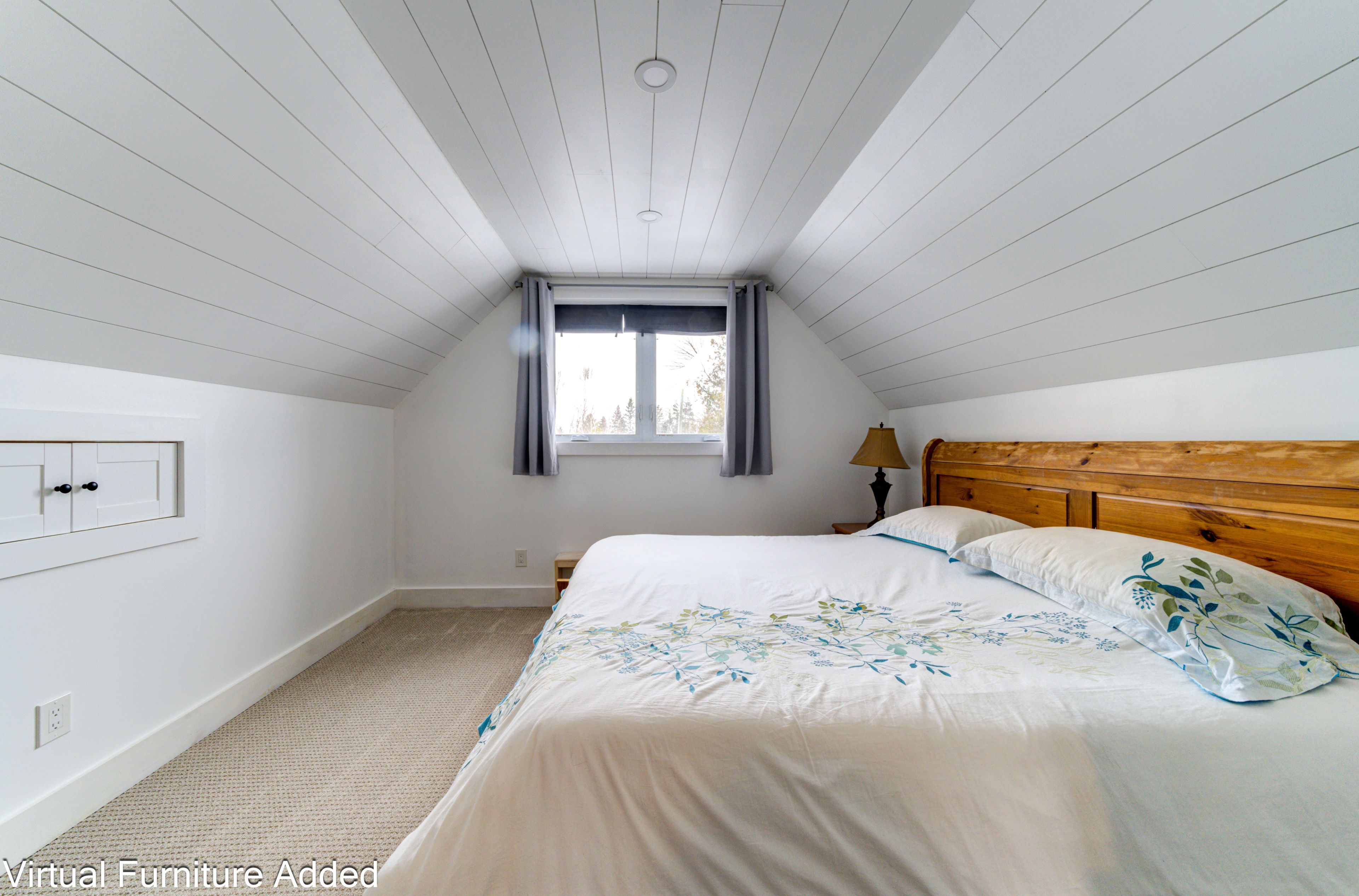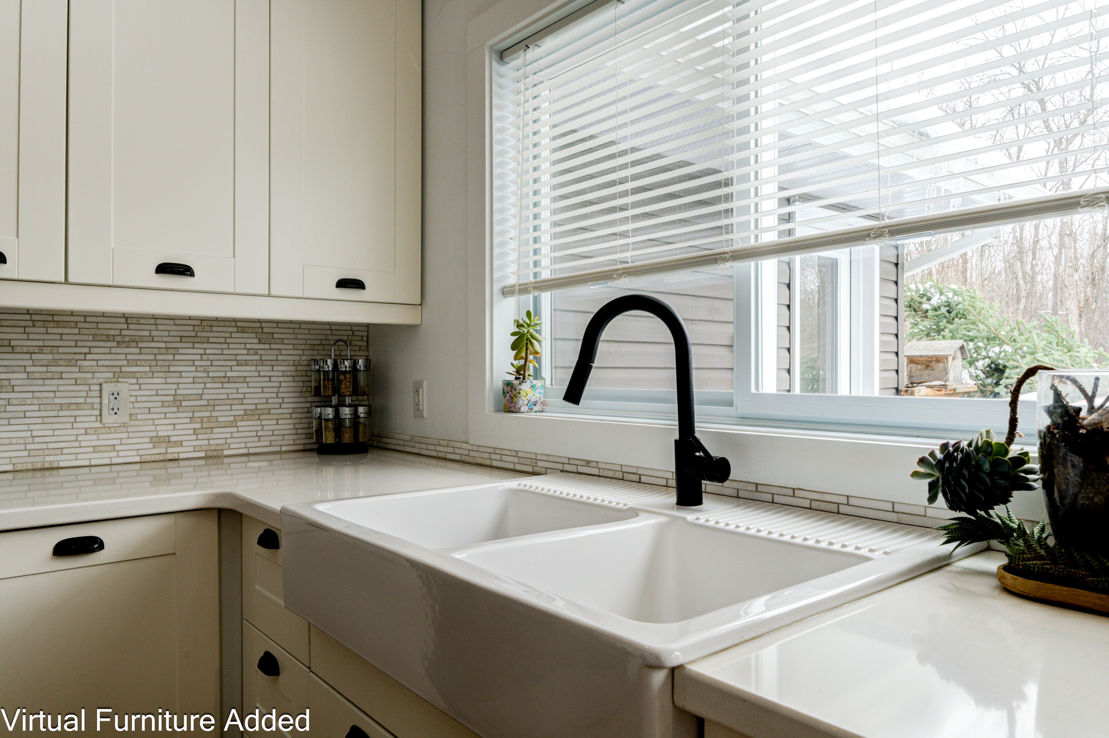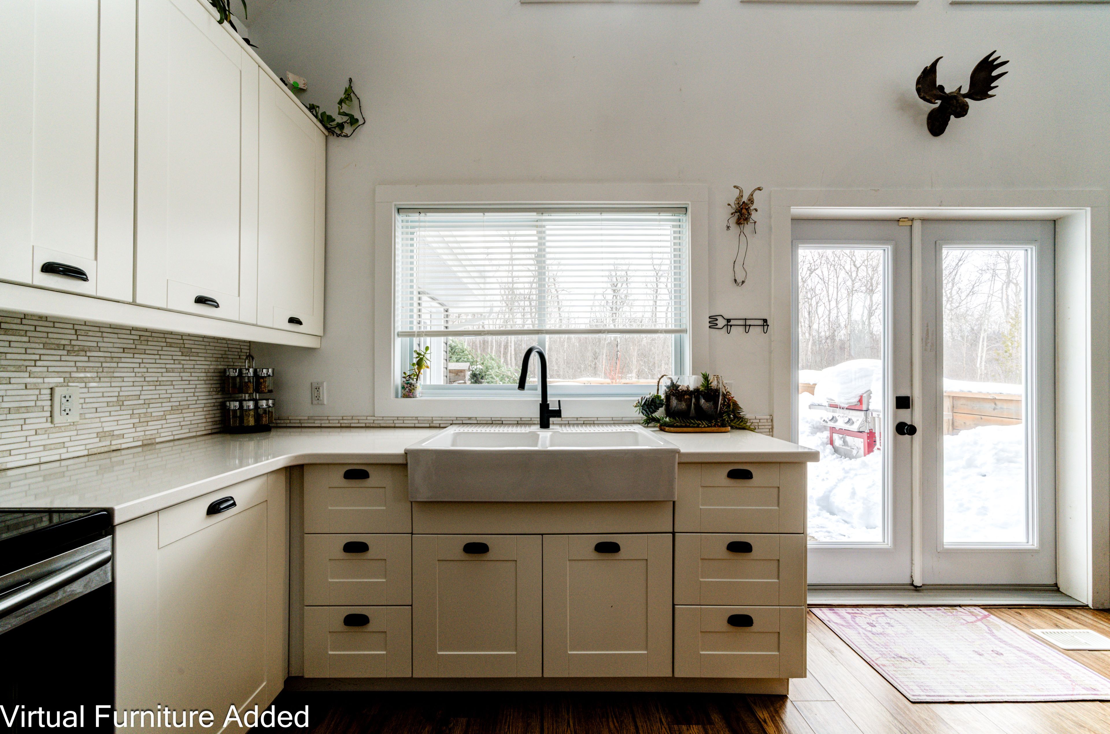 • Bright kitchen with cathedral ceilings and large windows for natural light.