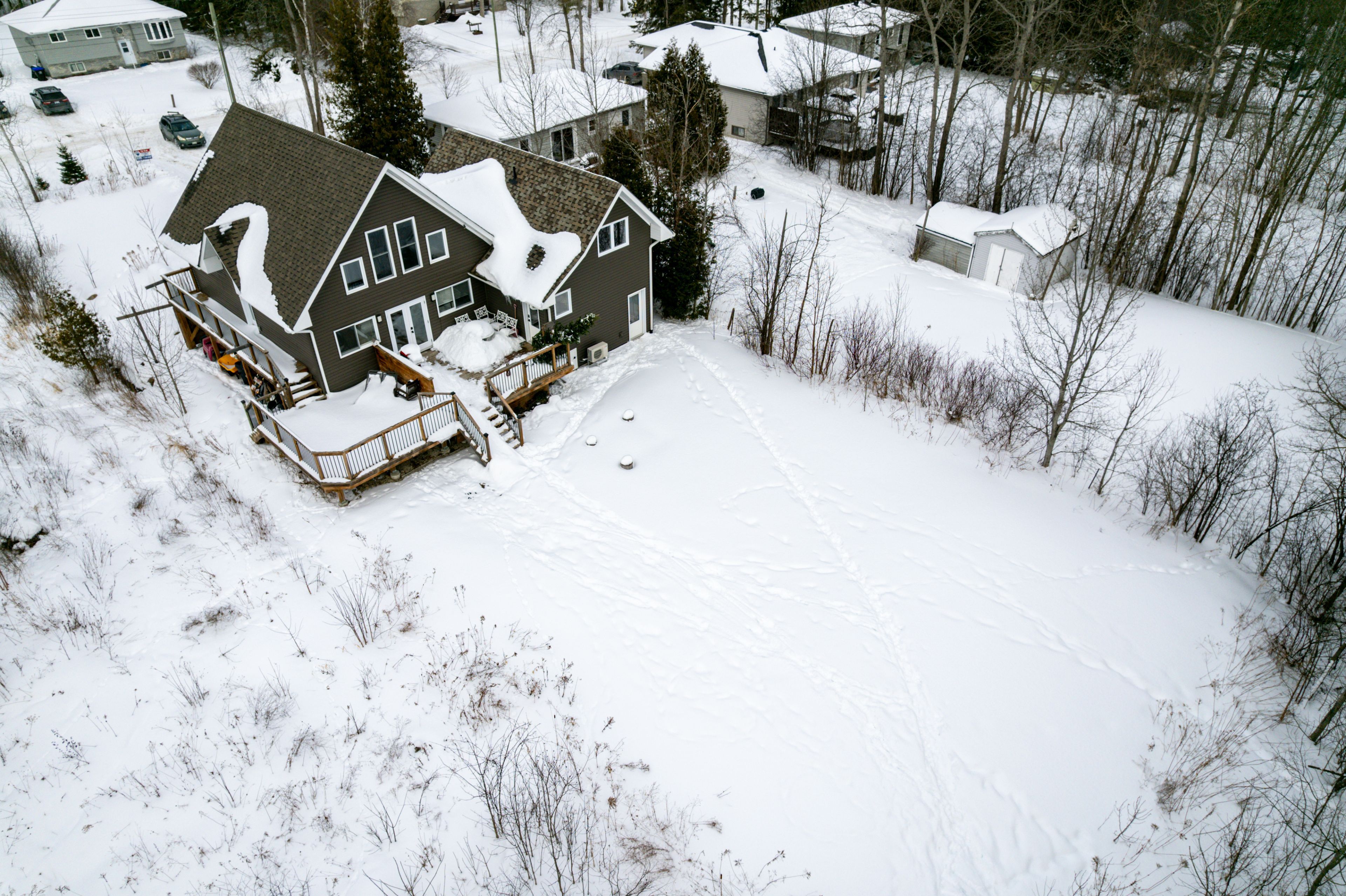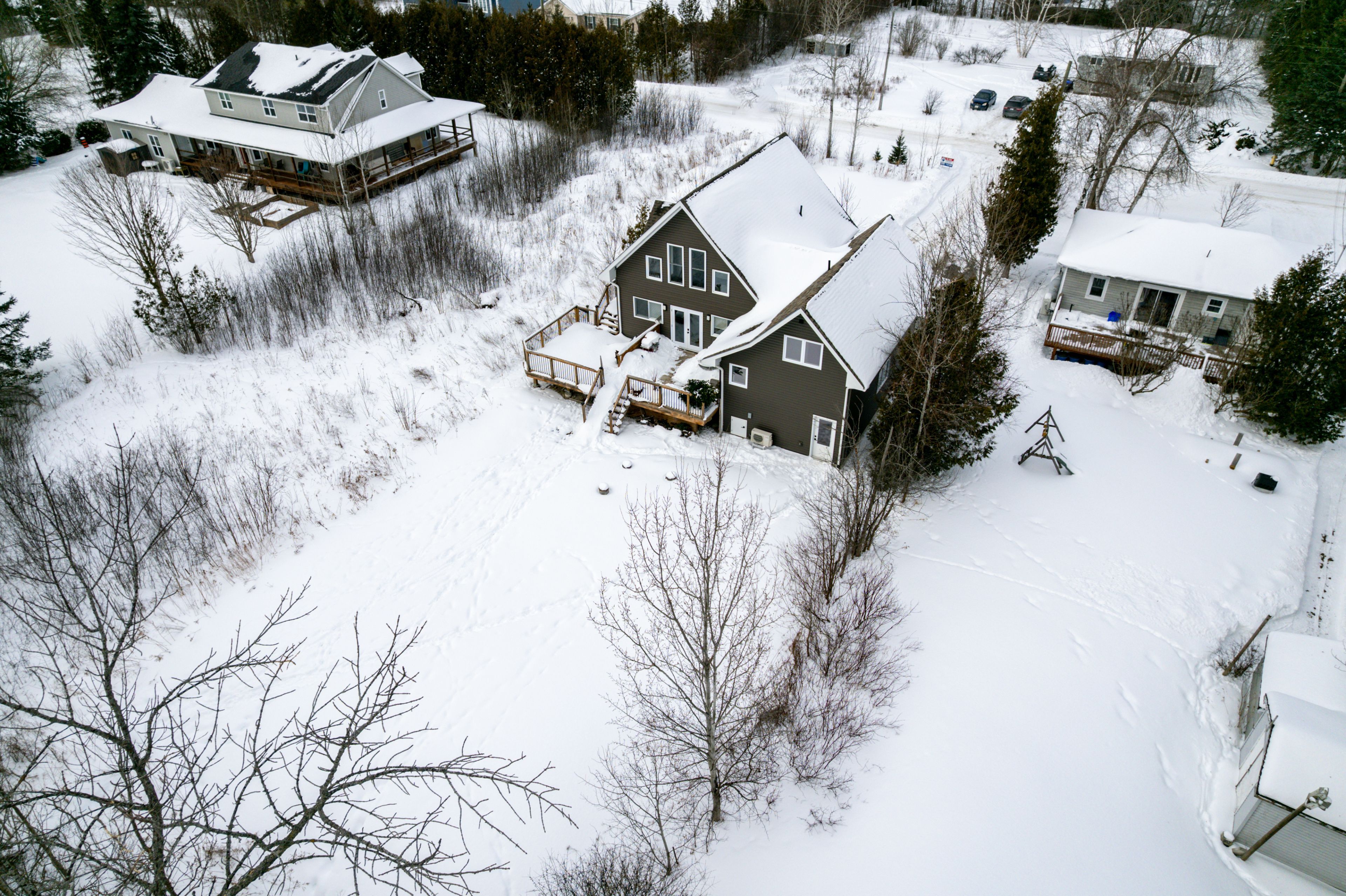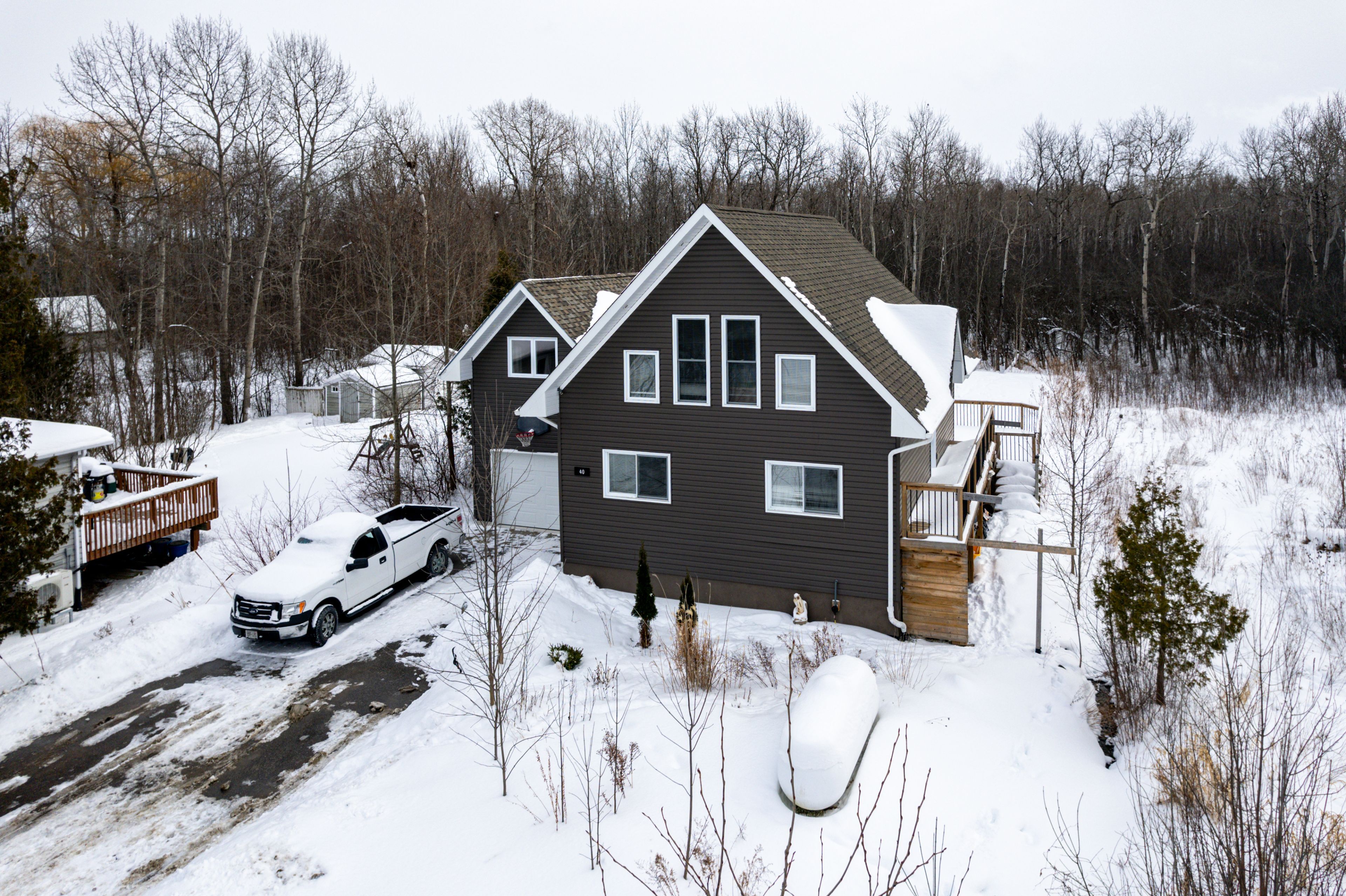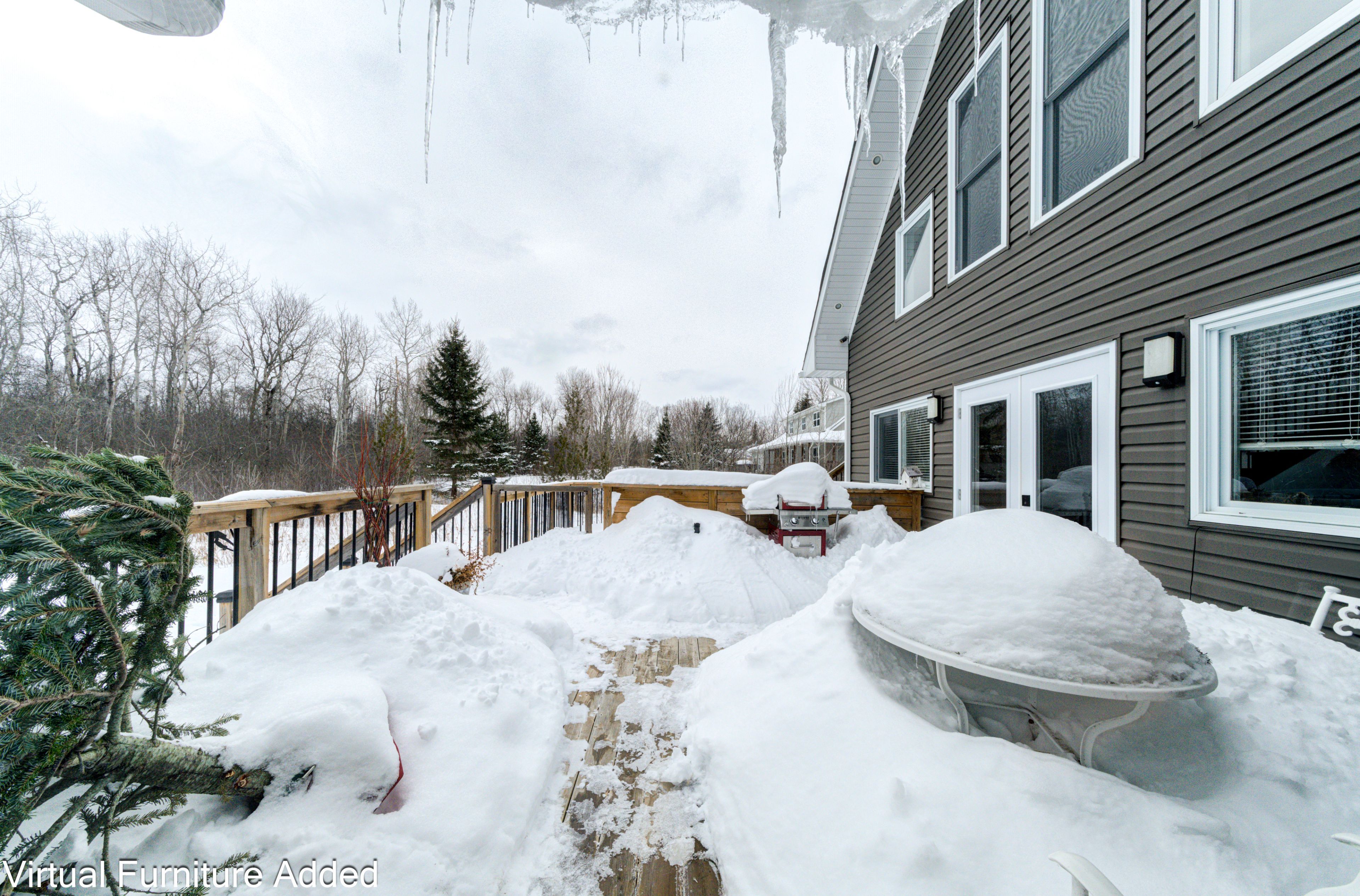• Private lot backing onto a wooded area with a large wrap-around deck.