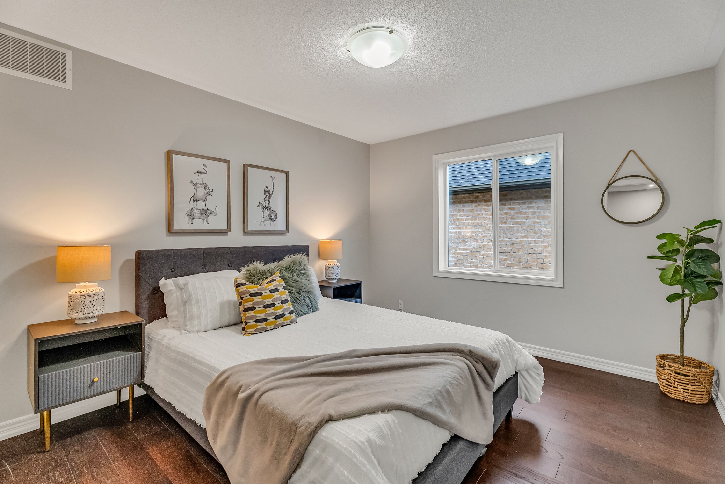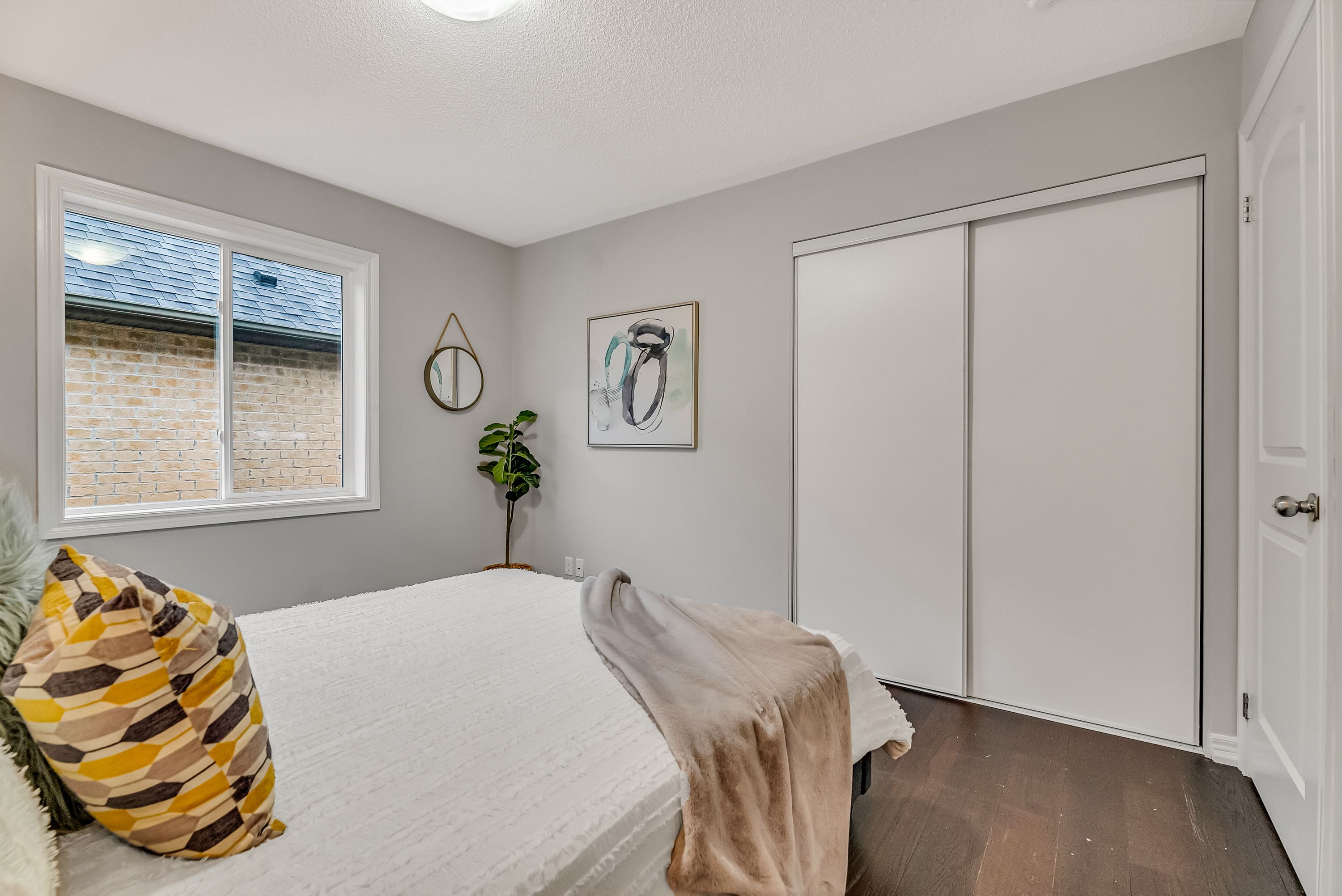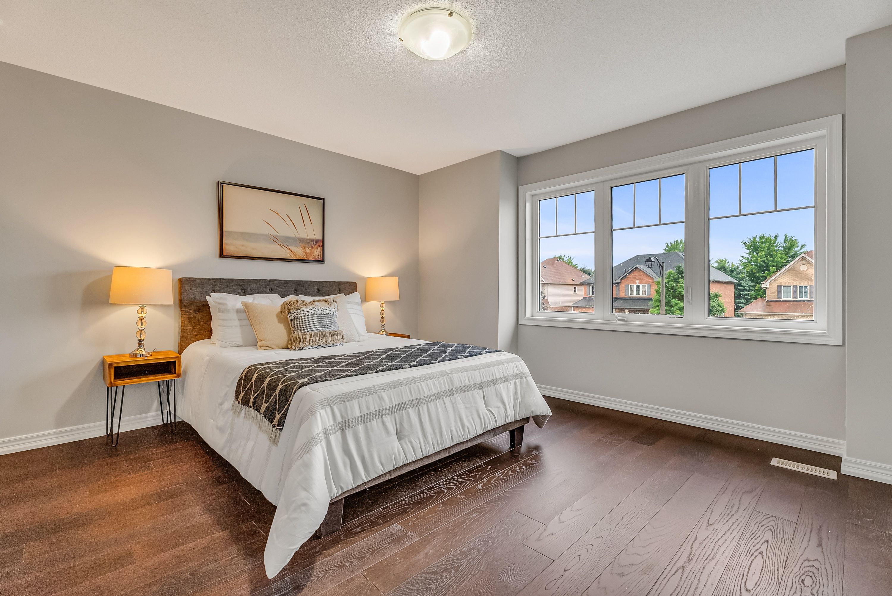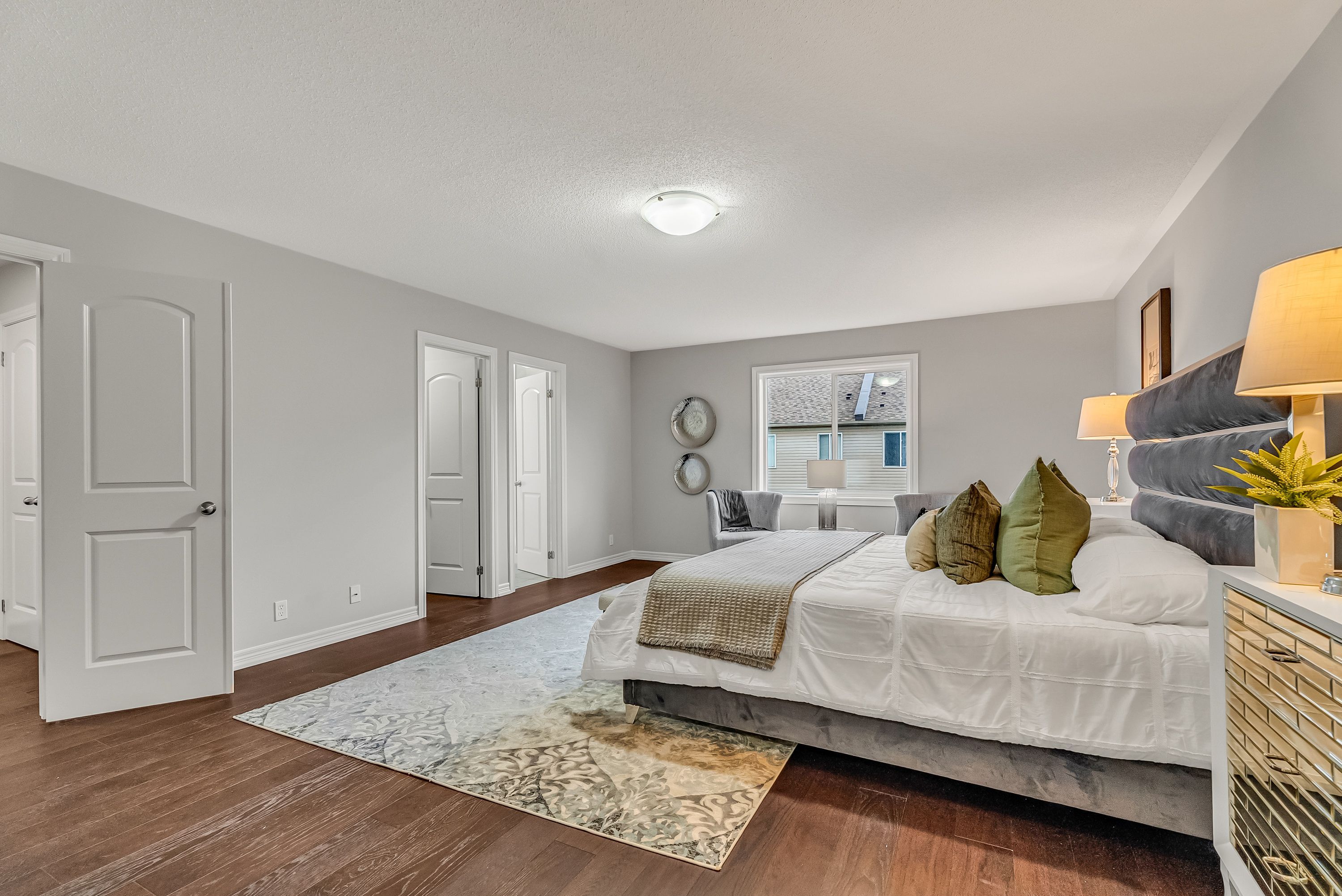 • Spacious bedroom with large windows for natural sunlight.