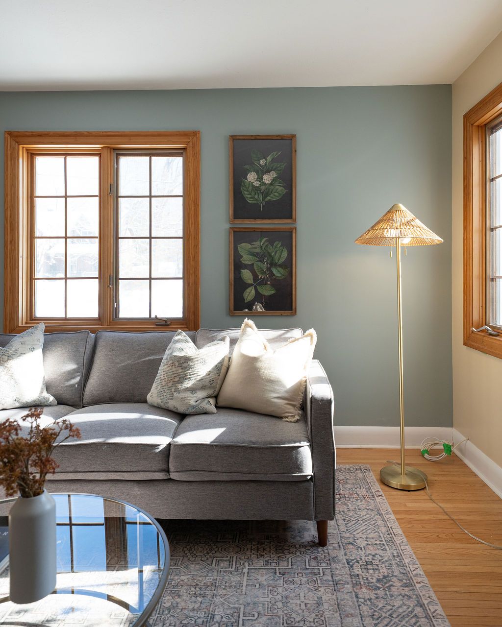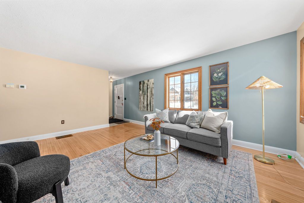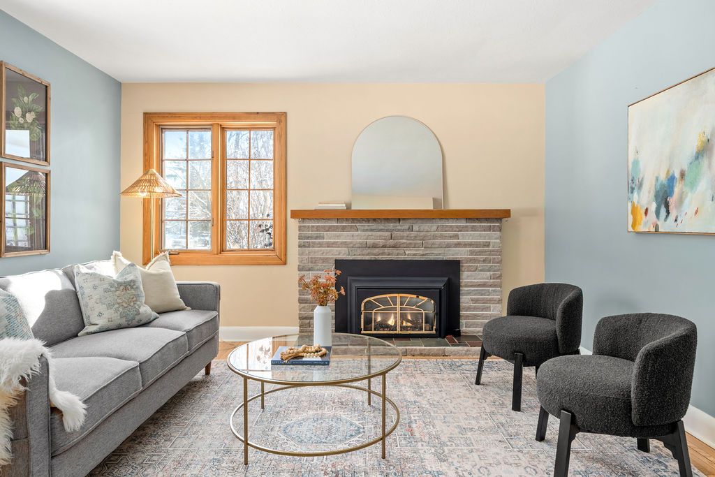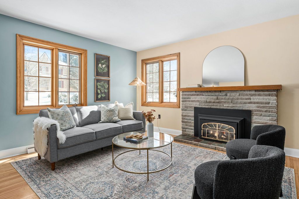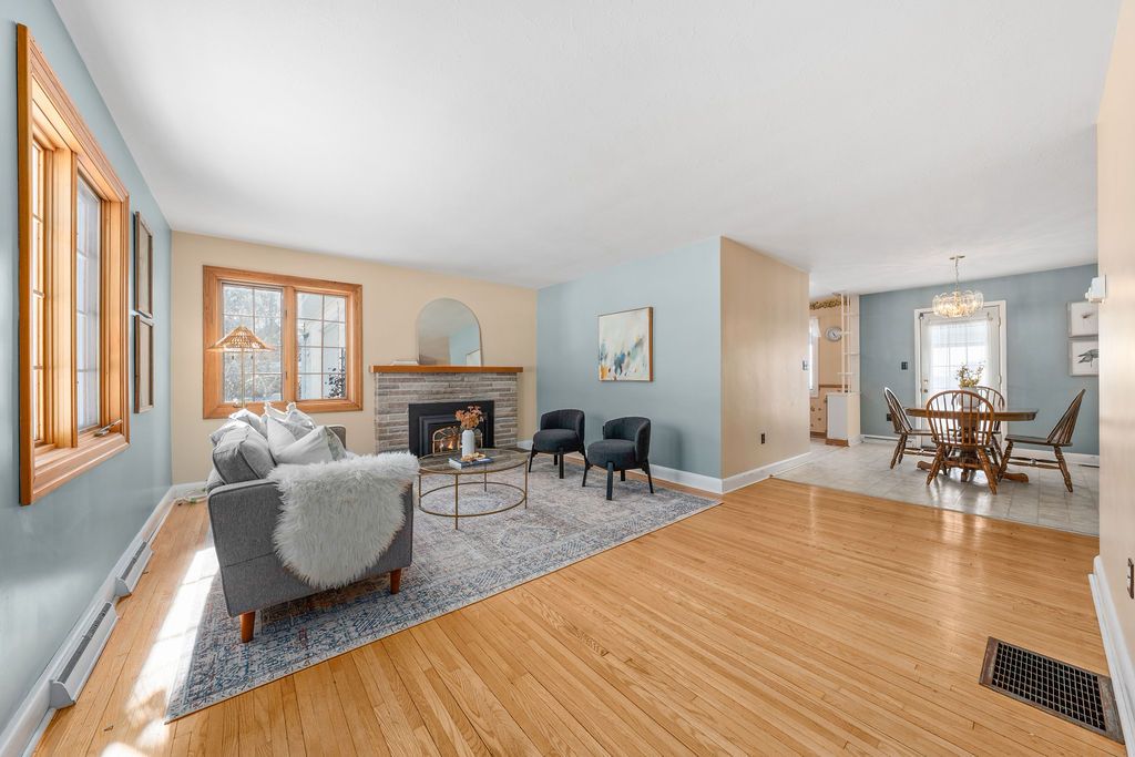 • Bright living room with hardwood floors and a cozy fireplace.