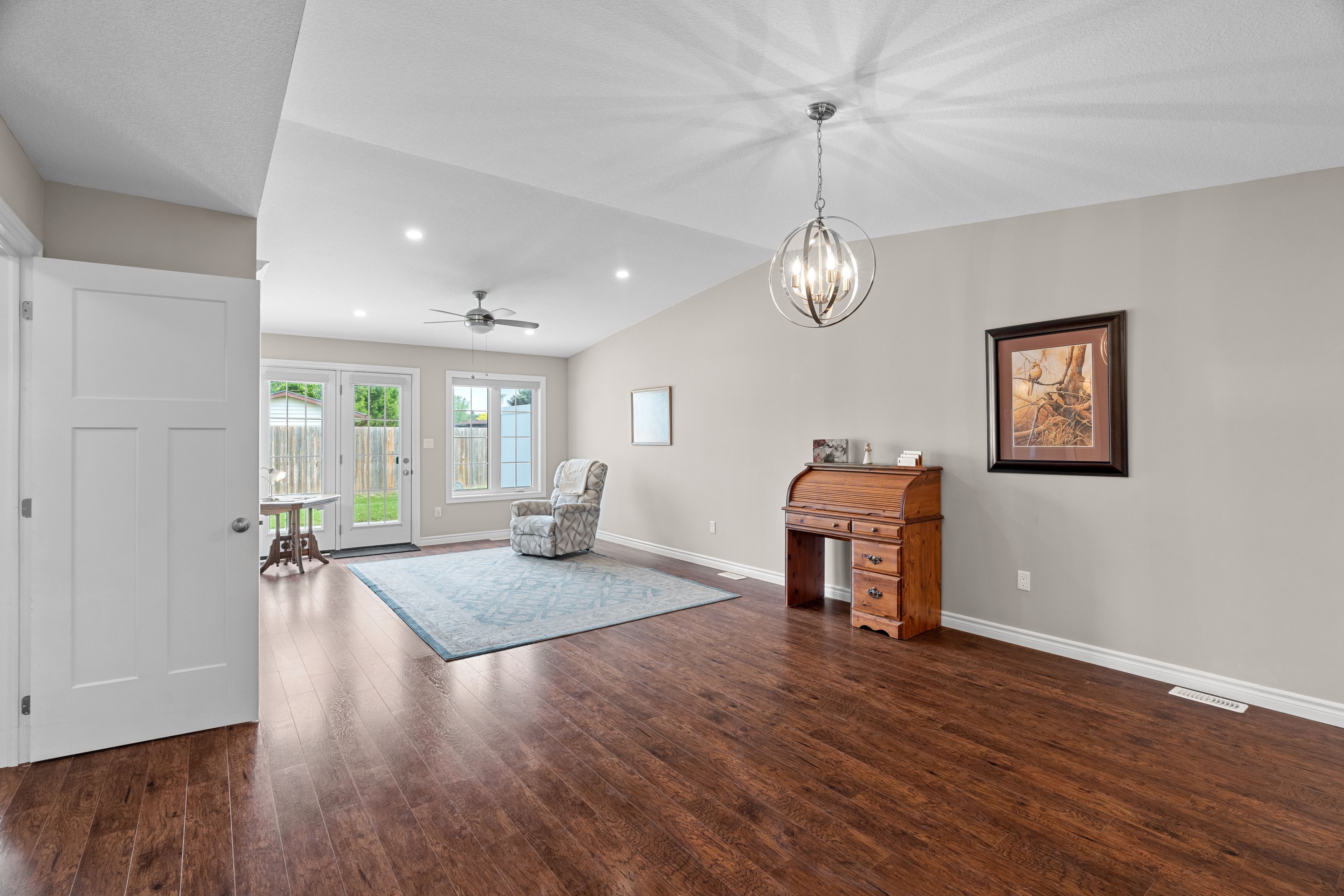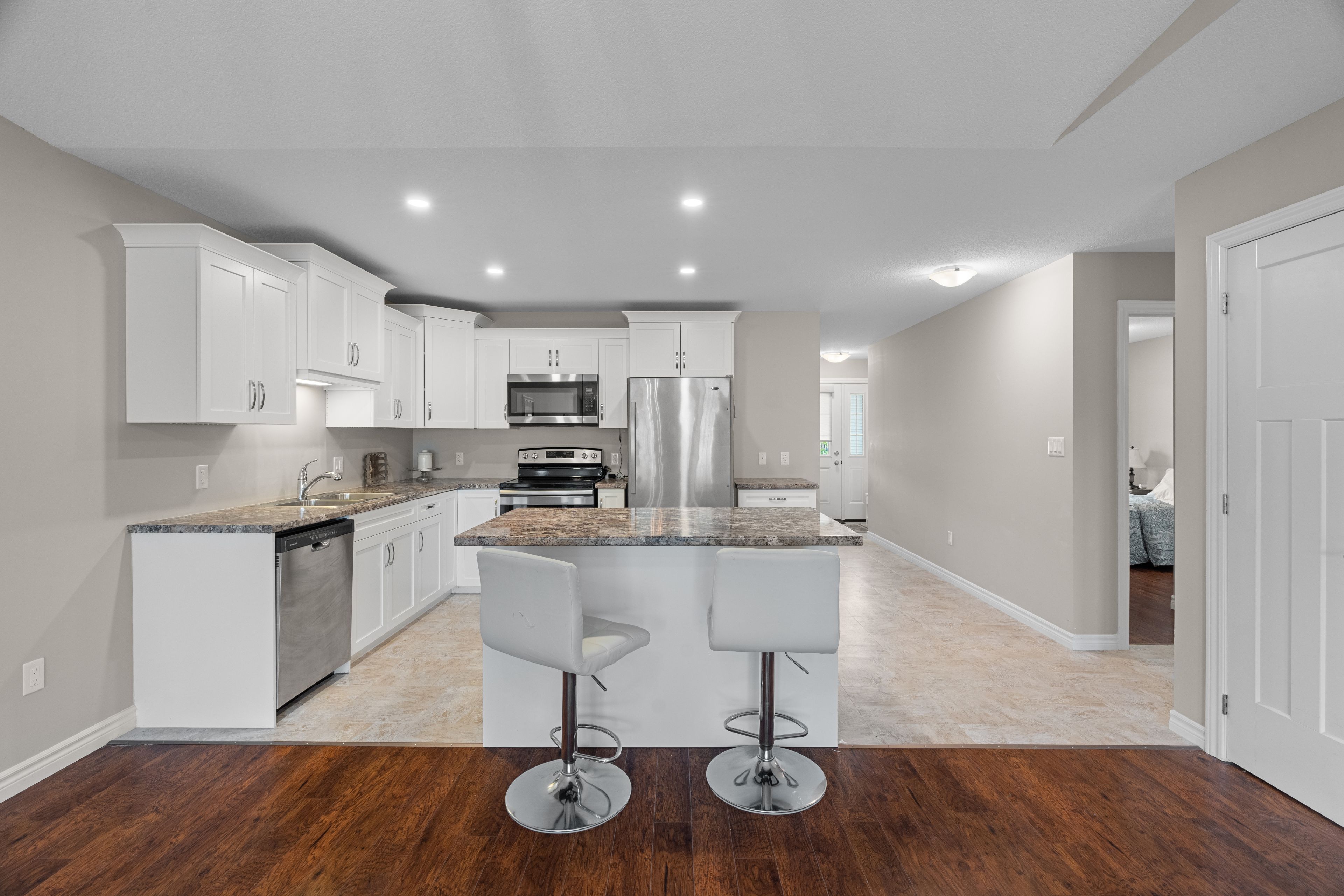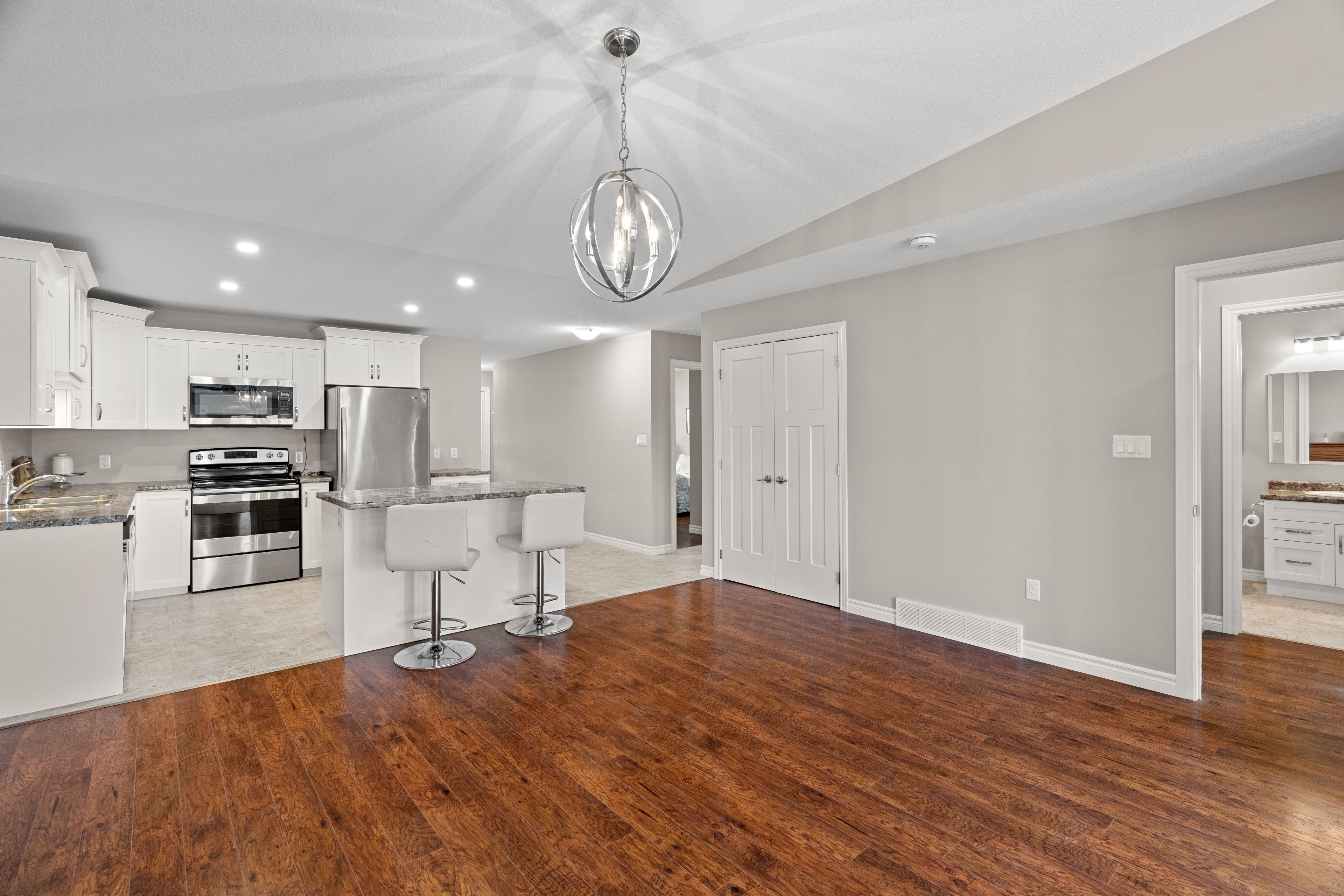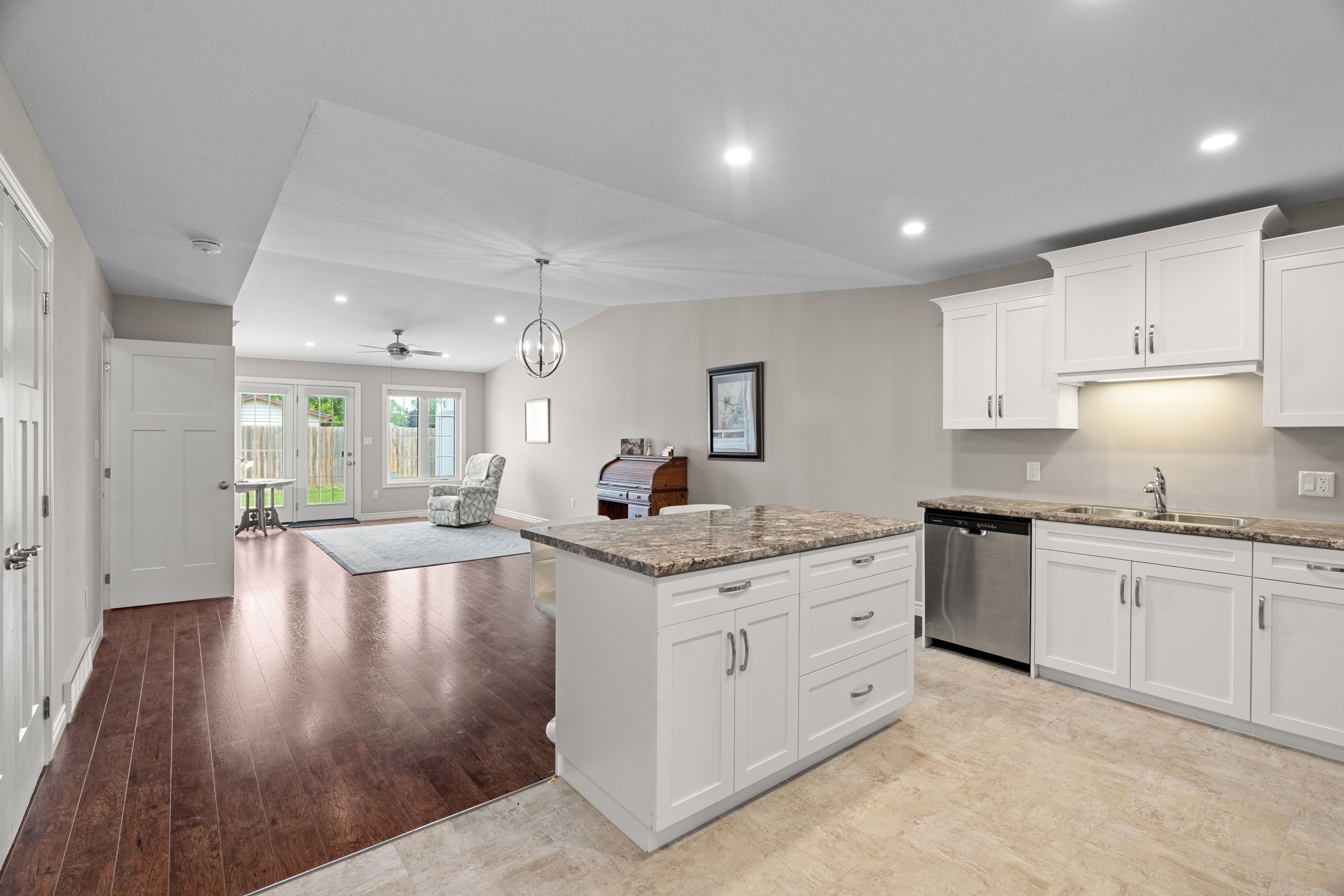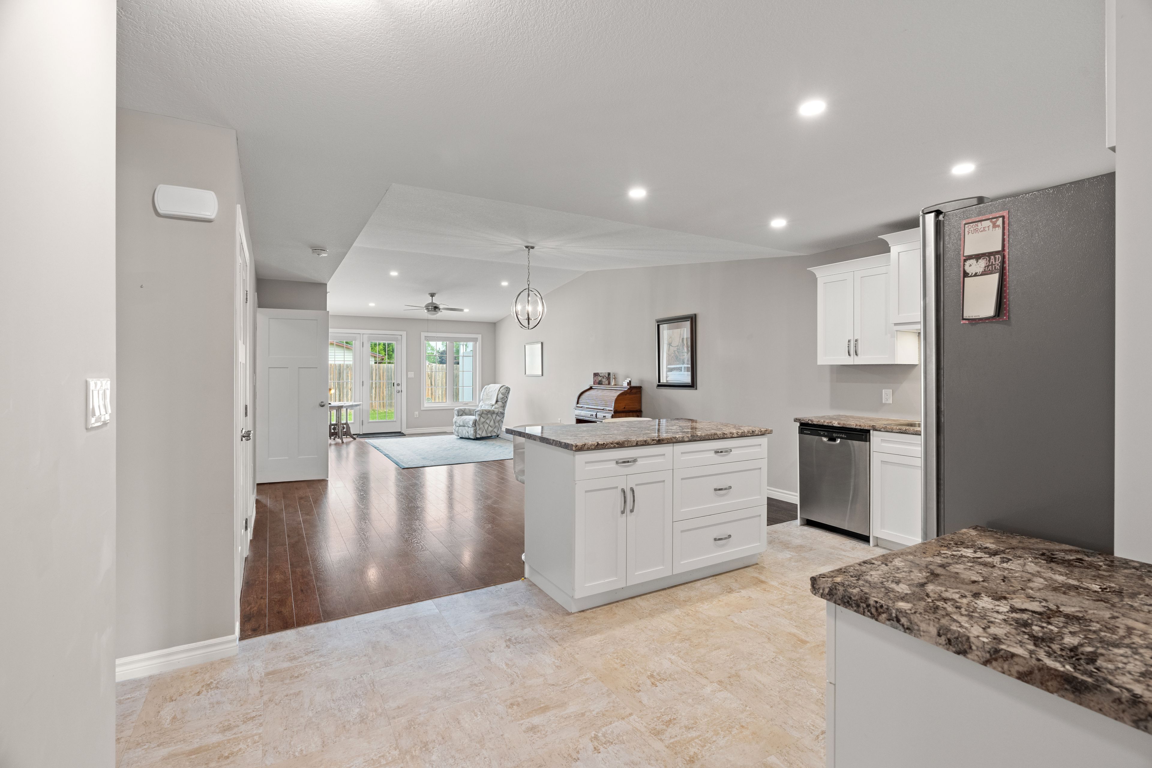 Discover easy, worry-free living in this well-maintained one-floor townhouse, ideal for downsizing or enjoying your retirement years. Thoughtfully designed for comfort and convenience, this home features an open-concept layout that blends the kitchen, dining, and living areas into one cohesive and welcoming space. The kitchen offers bright white cabinetry, ample counter space, and a large island with bar seating perfect for casual dining or entertaining guests. The spacious living room is highlighted by a soaring cathedral ceiling and large windows that fill the space with natural light. The primary suite includes a walk-in closet with built-in shelving and a private ensuite bath, offering everyday comfort and ease. A second bedroom provides flexibility for guests, a home office, or additional living space. Step outside to a private concrete patio, with direct access to scenic walking trails and the community's clubhouse. Located in riverview meadows, this home is part of a vibrant adult lifestyle community offering exceptional amenities. Residents enjoy access to a community gazebo, picturesque riverside trails, and a well-equipped clubhouse featuring a fitness room, billiards, shuffleboard, darts, media library, and a large gathering space. With nearby golf, shopping, and hospital services, this is relaxed living at its best. Land lease and property taxes are $995. 17 monthly.
