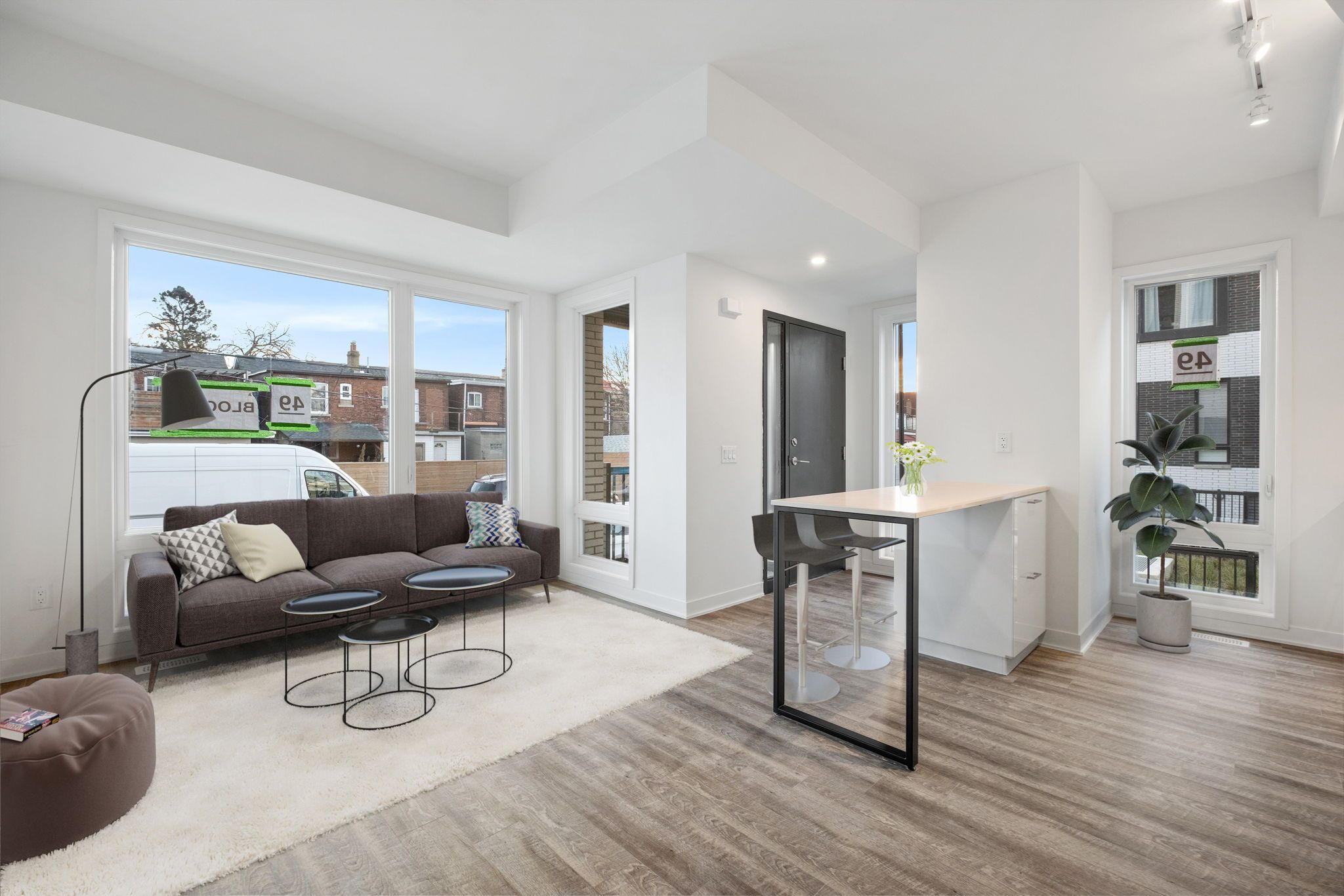 • Open-concept living and dining area with natural light and high ceilings.
