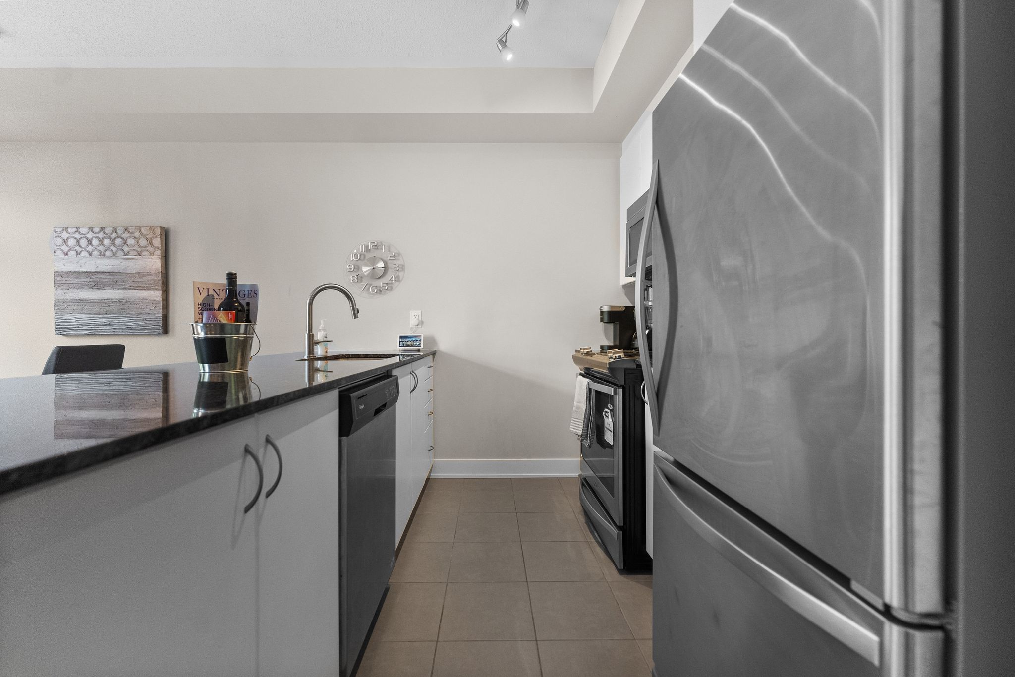 • Stylish kitchen with quartz countertops and stainless steel appliances.