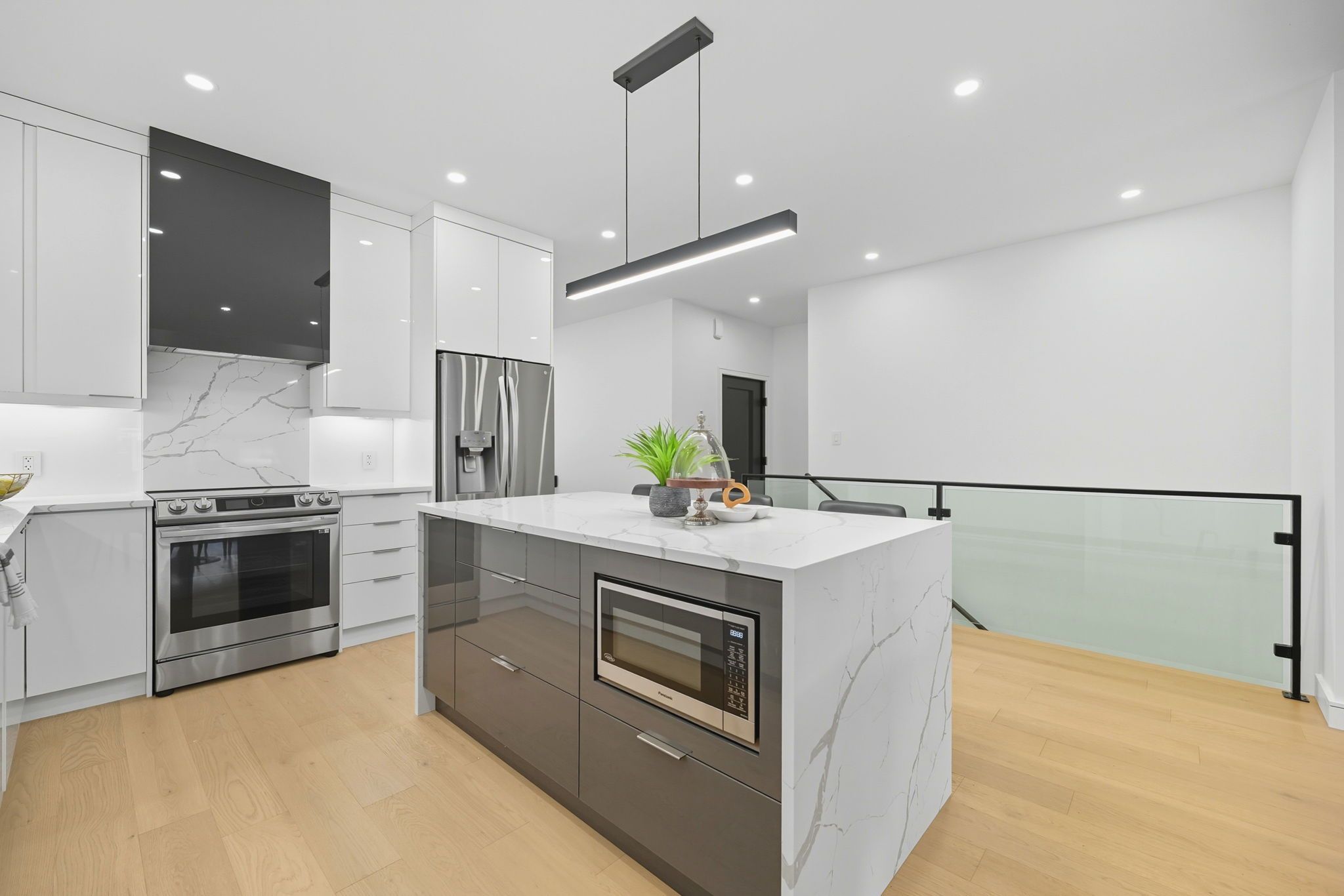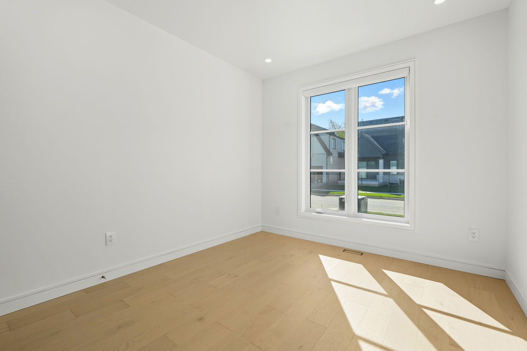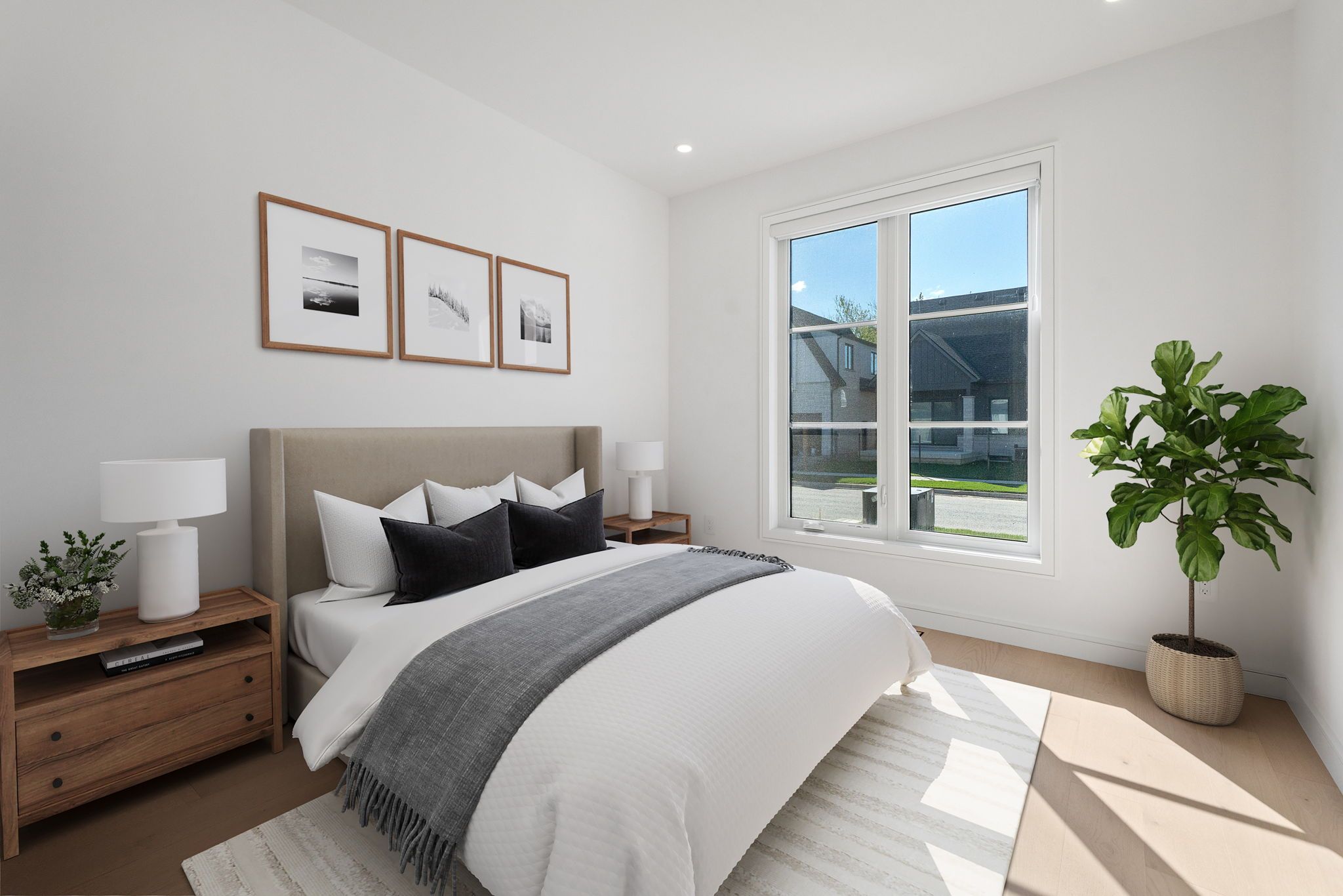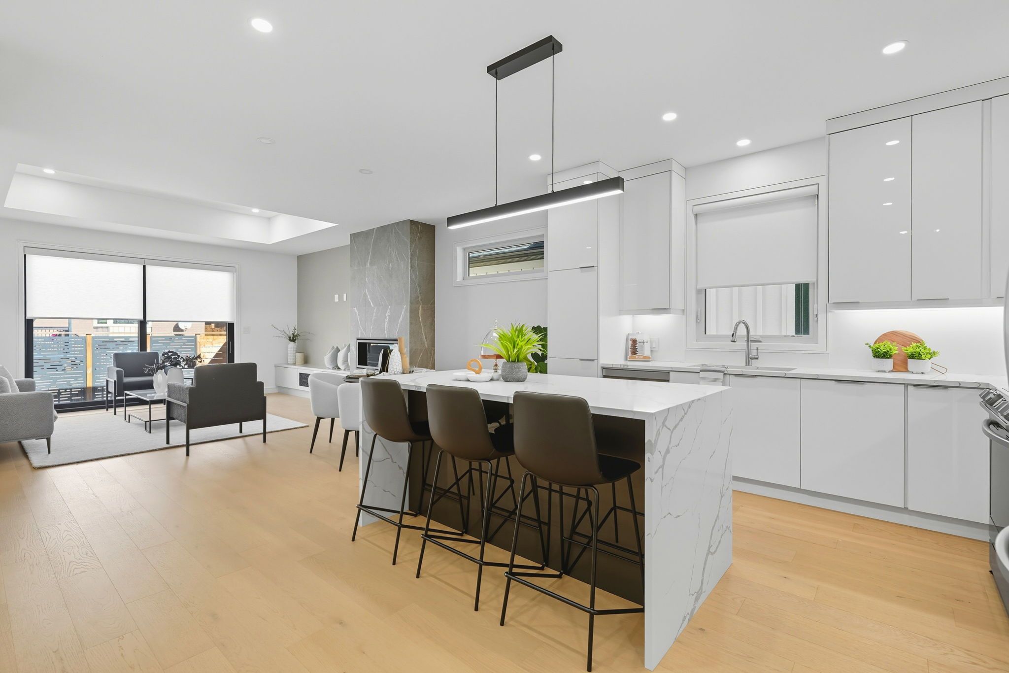Welcome to this stunning custom-built bungalow in thorold, designed with style, function, and comfort in mind. The open-concept layout highlights a chefs kitchen with custom cabinetry, painted glass backsplash, a striking quartz double waterfall island, and brand-new stainless steel appliances. An additional espresso bar with wine fridge off the dining area adds the perfect touch for entertaining. The bright living room features a sleek linear gas fireplace and oversized double patio doors (9x8) that flood the space with natural light and lead to a 16x12 wooden deck complete with privacy screening. The main floor offers two bedrooms, including a primary suite with a walk-in closet and a spa-like ensuite boasting a custom double vanity and large glass walk-in shower. A main 4-pc bathroom, mud/laundry room, and italian tile with engineered hardwood flooring complete this level. The fully finished lower level expands your living space with two additional bedrooms with egress windows, a 3-pc bathroom, and a large recreation area, all finished with durable vinyl flooring. Additional features include battery-powered window coverings on the main floor, an attached single-car garage, and a double-wide driveway. Set in a prime location close to shopping, amenities, and with easy highway access, this home is within walking distance to scenic trails and lake gibson conservation park. A true blend of modern design and everyday convenience, move in and enjoy!