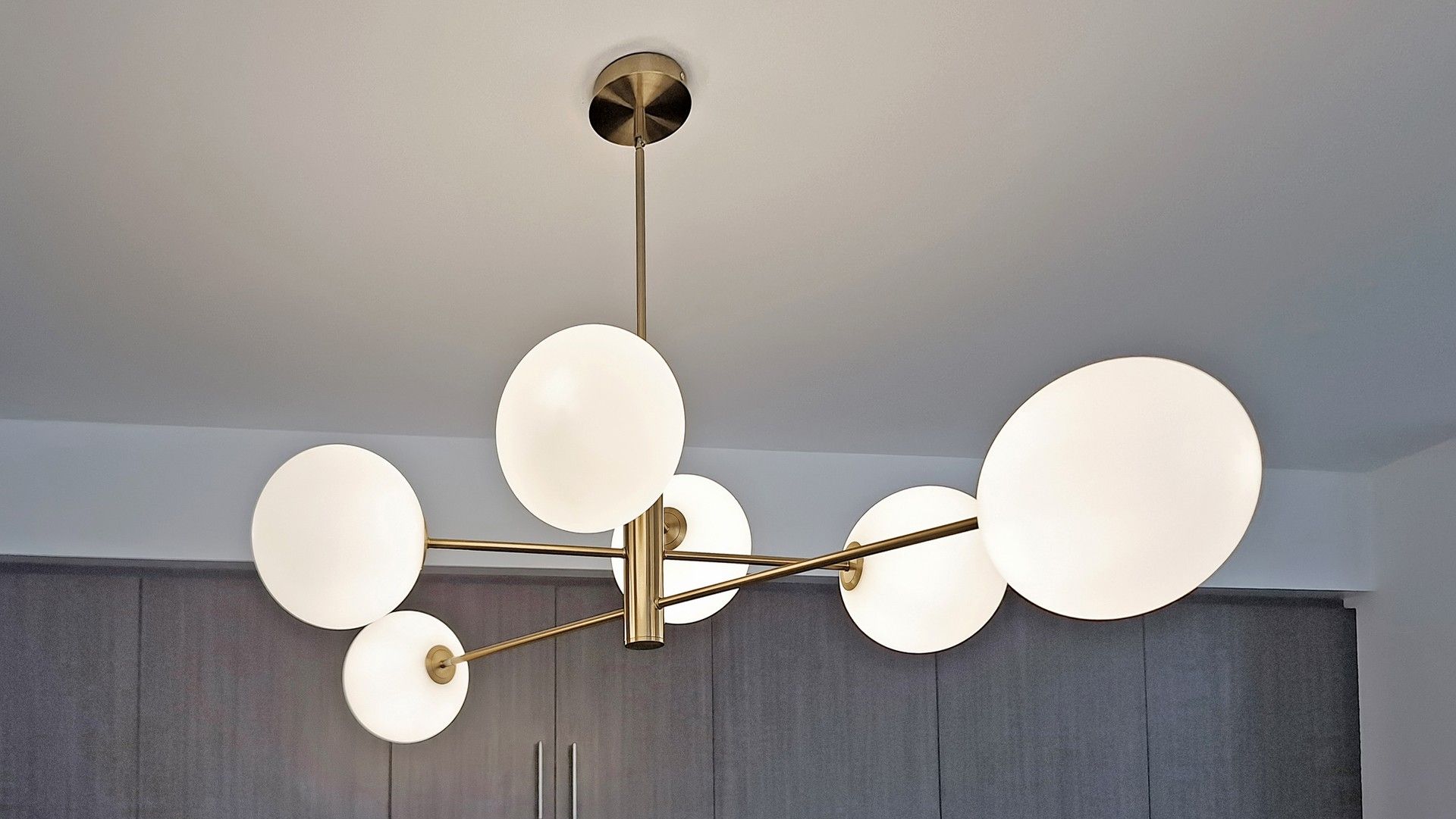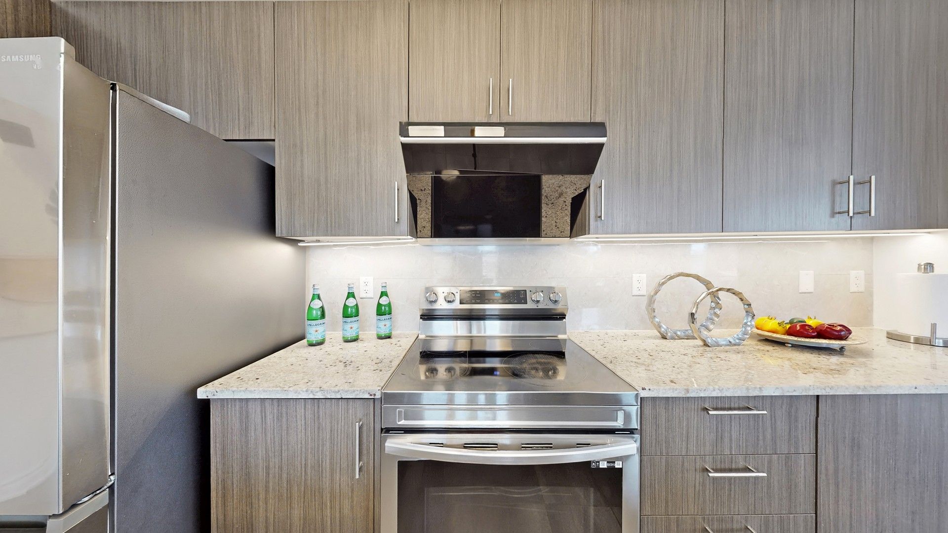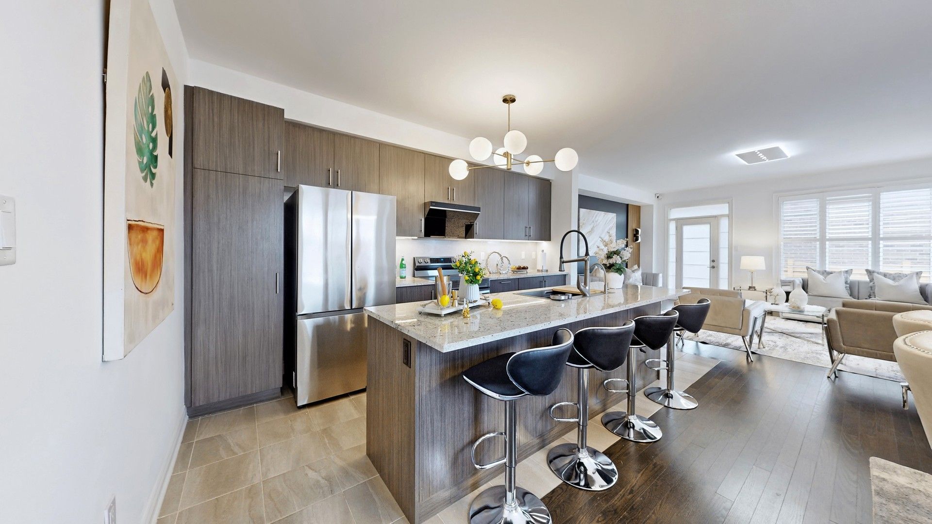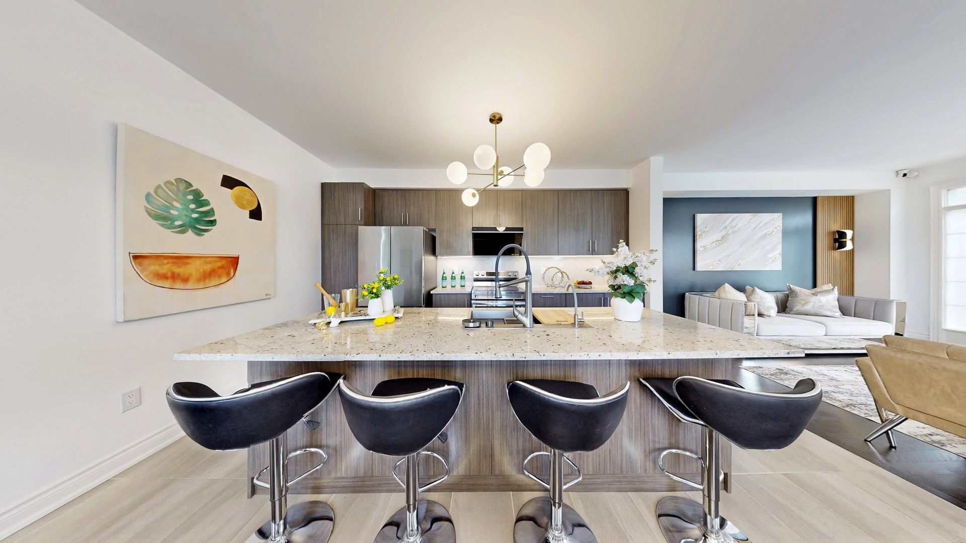 • Modern kitchen with oversized island, quartz countertops, and breakfast bar.