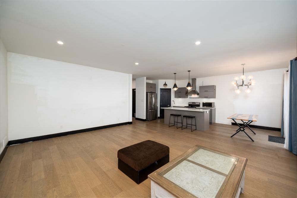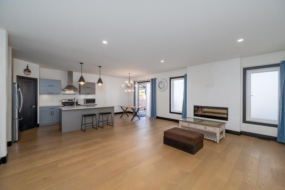 • Bright living room with 9ft ceilings and electric fireplace for cozy evenings.