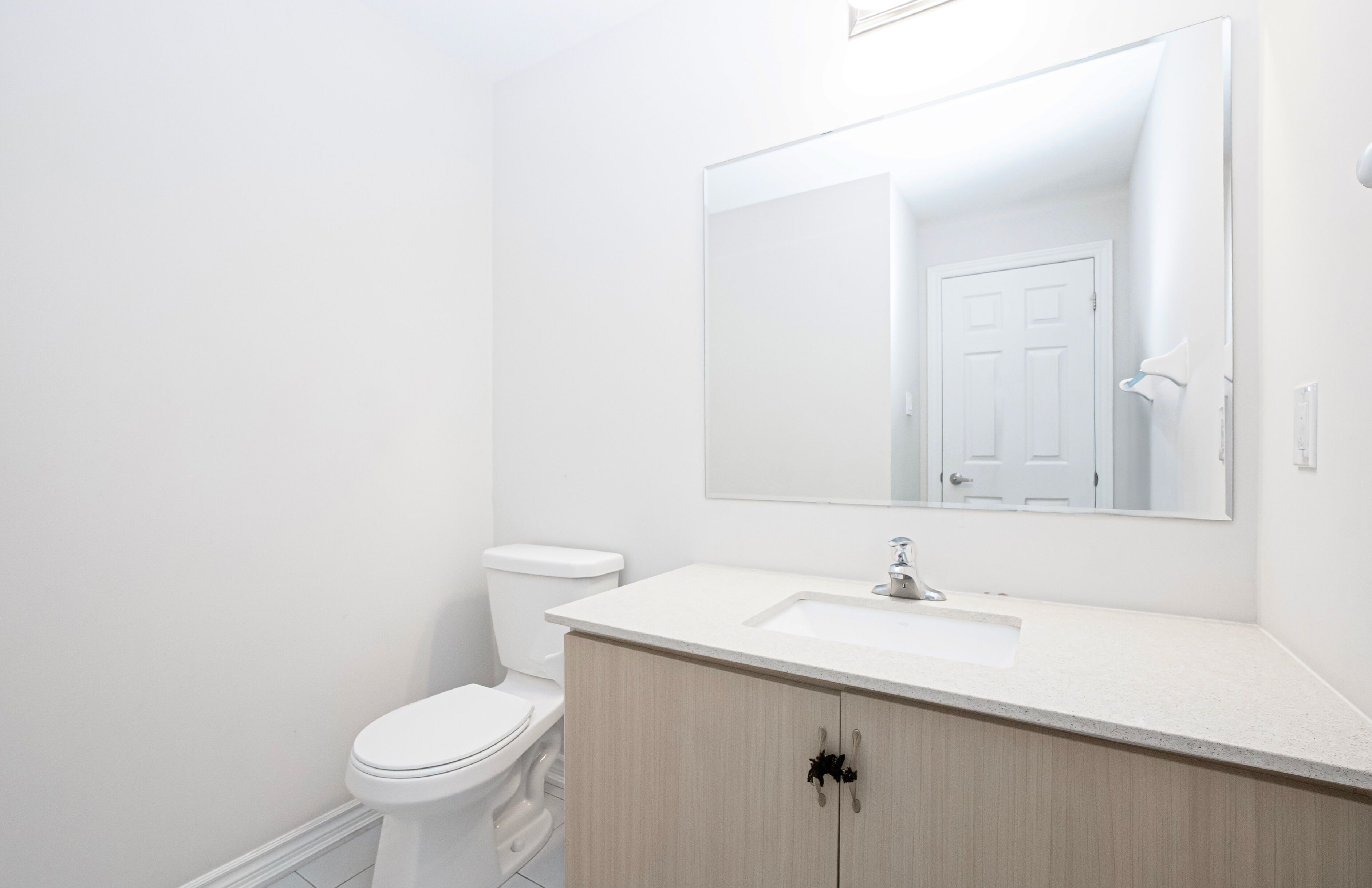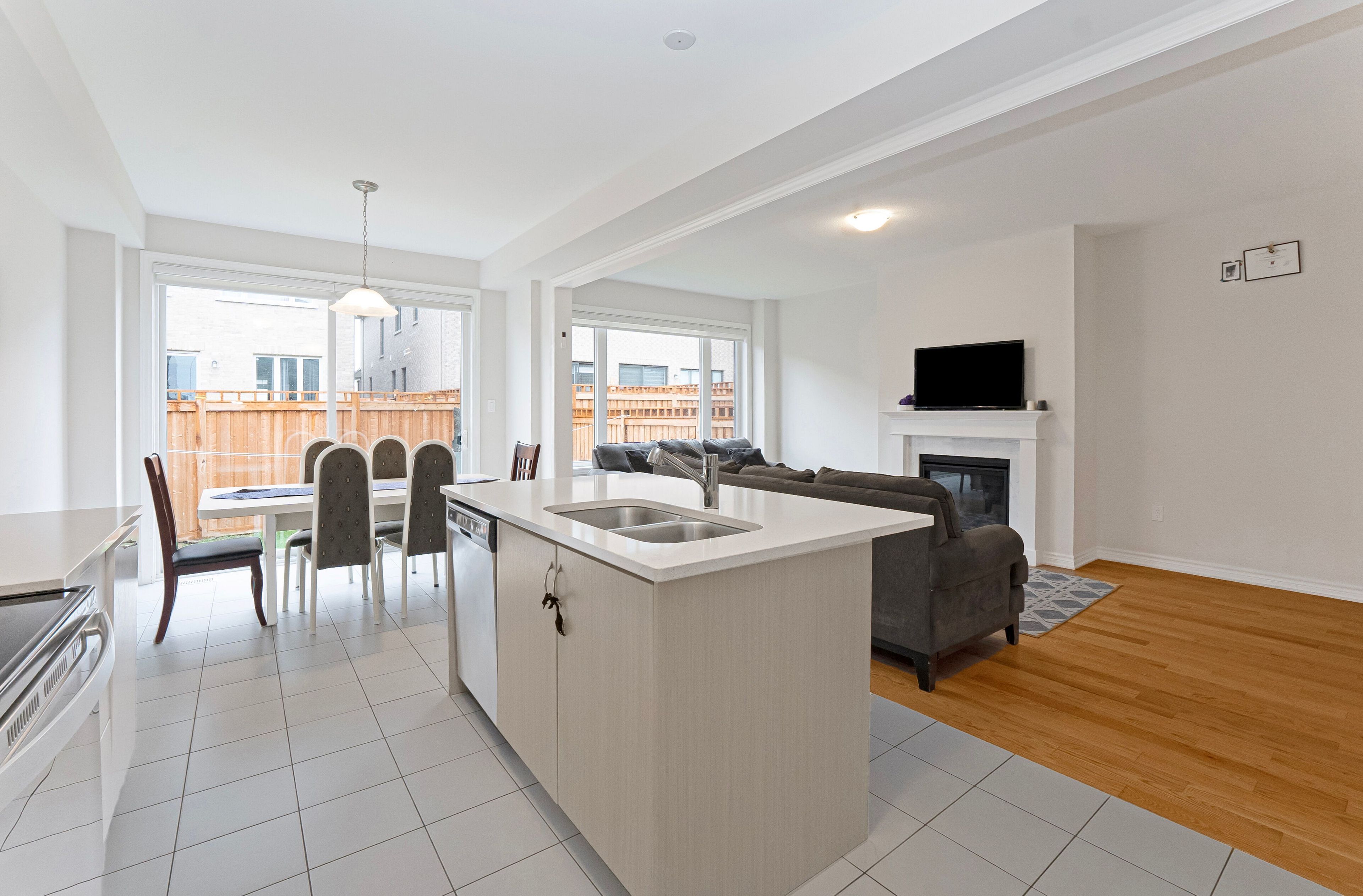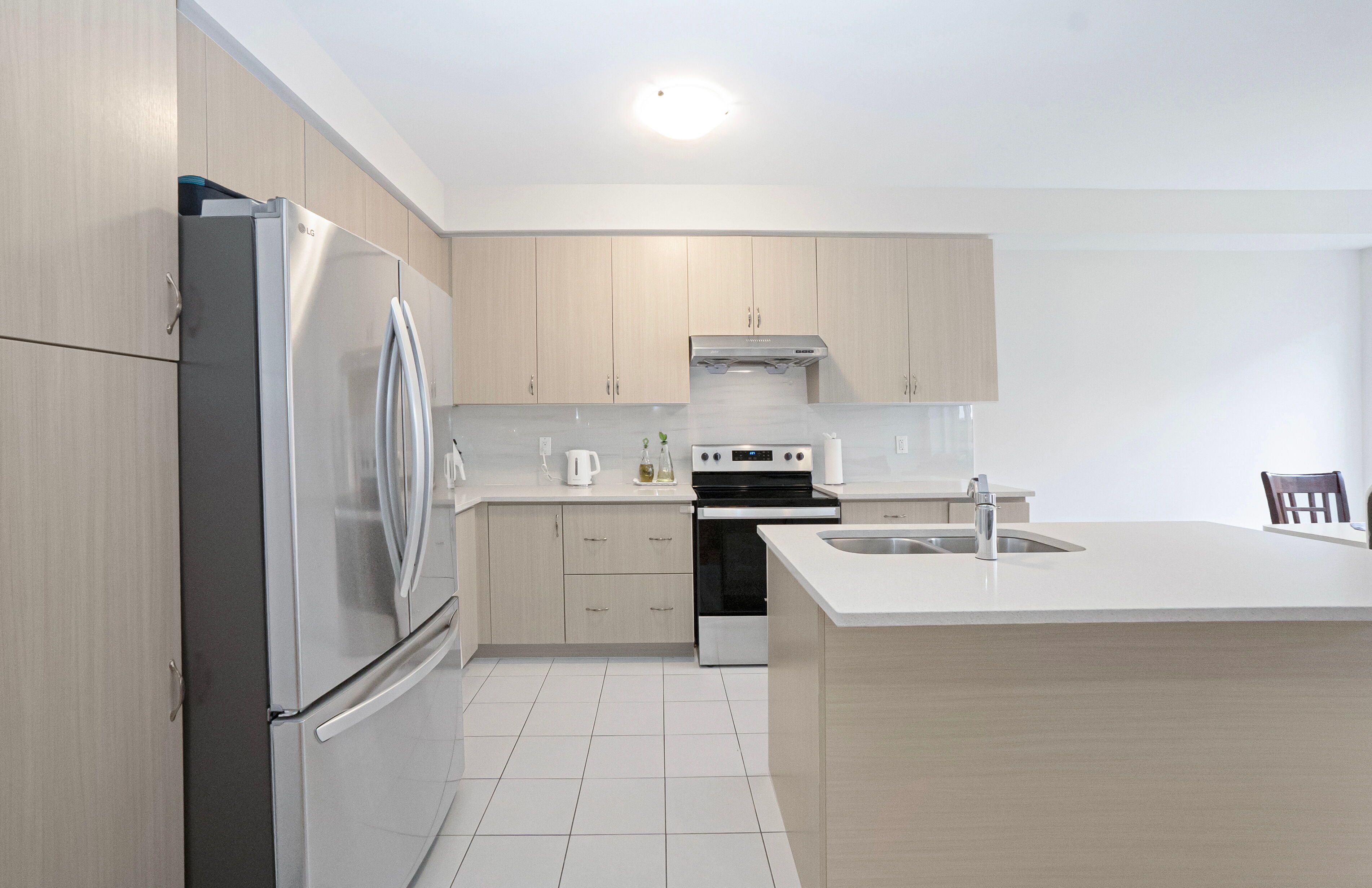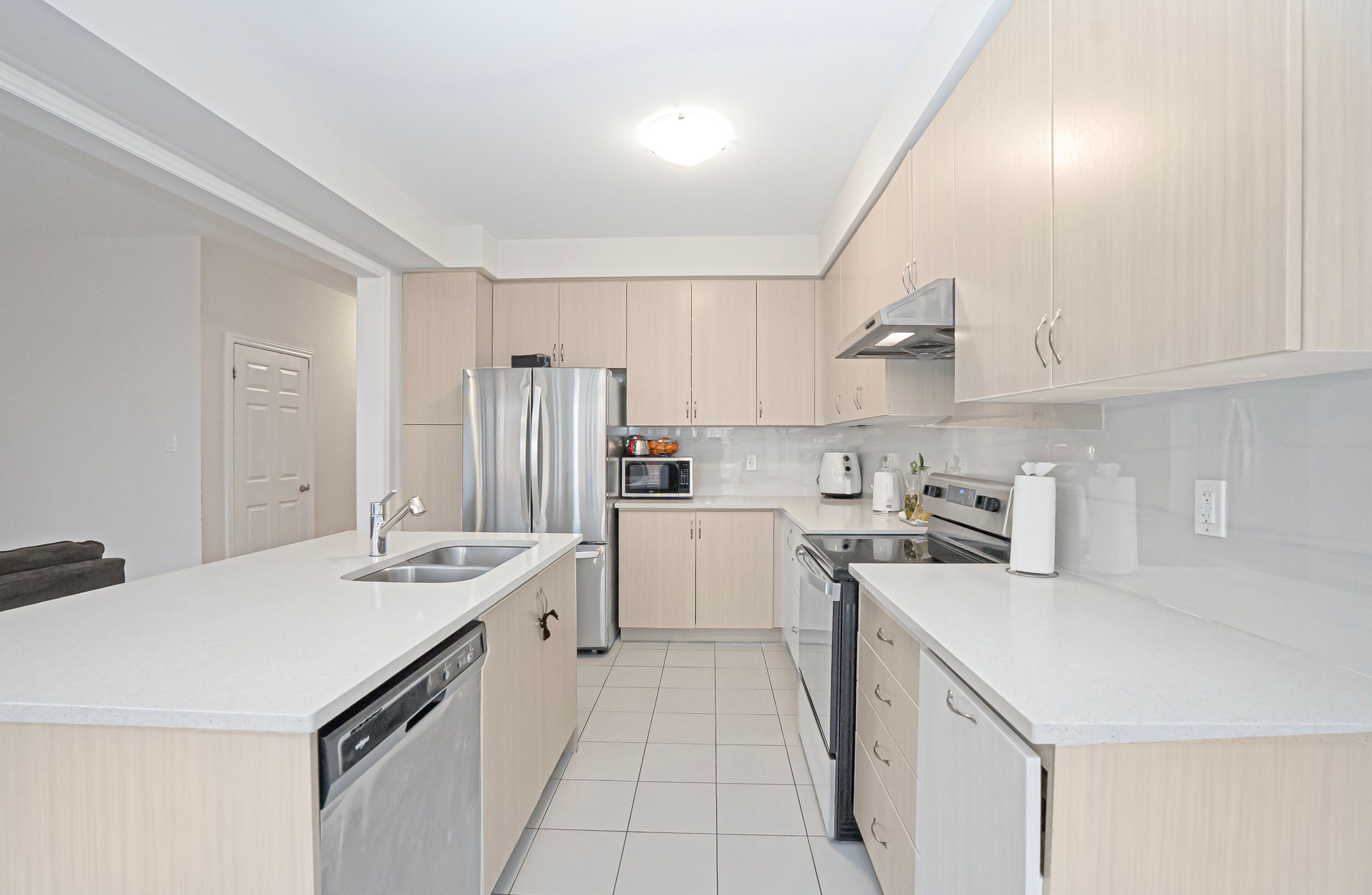• Modern kitchen featuring quartz countertops and oversized island.