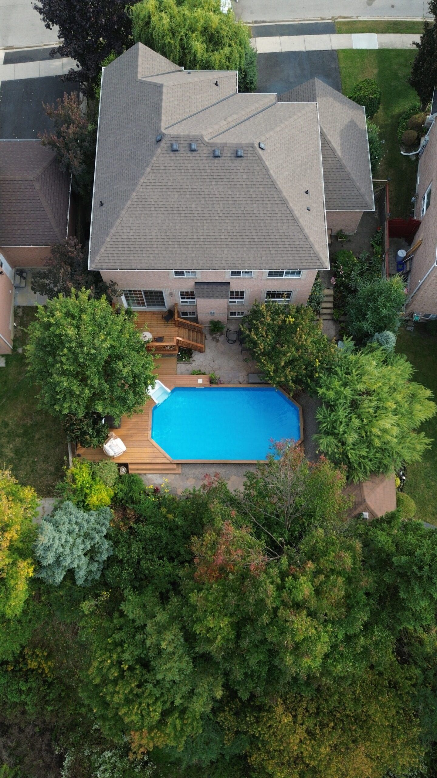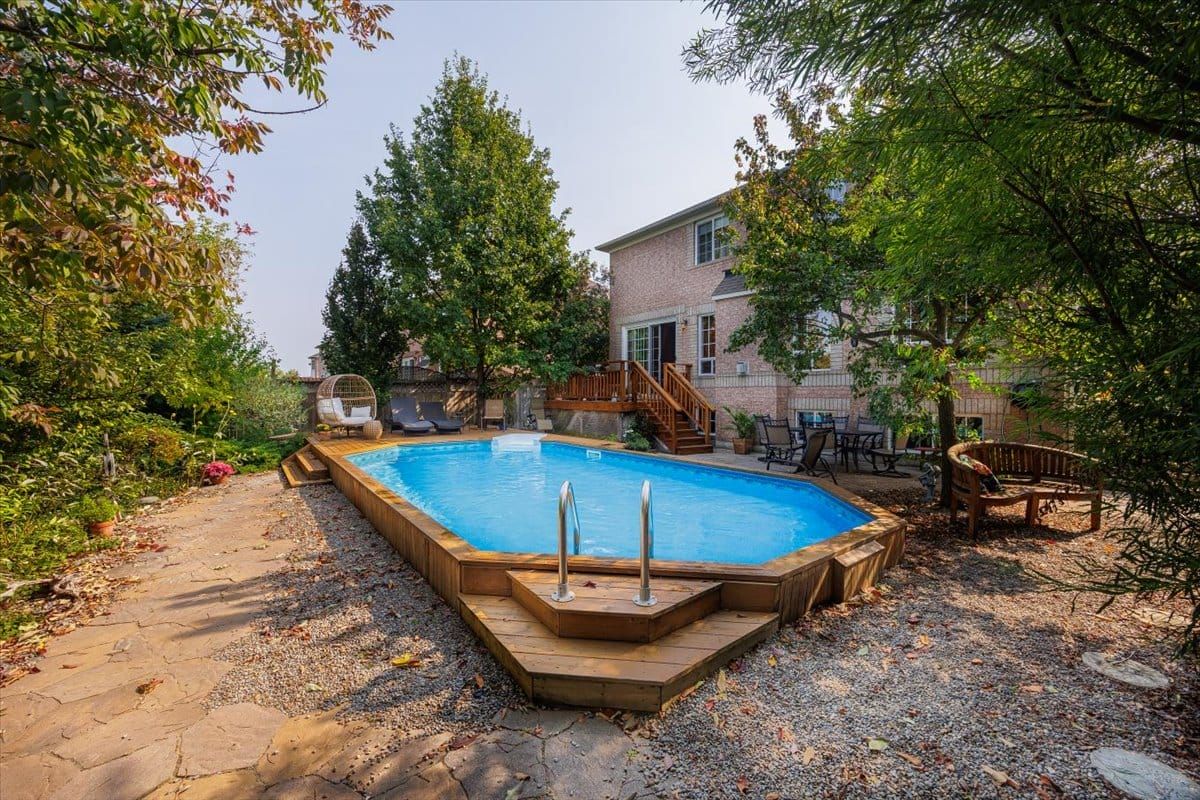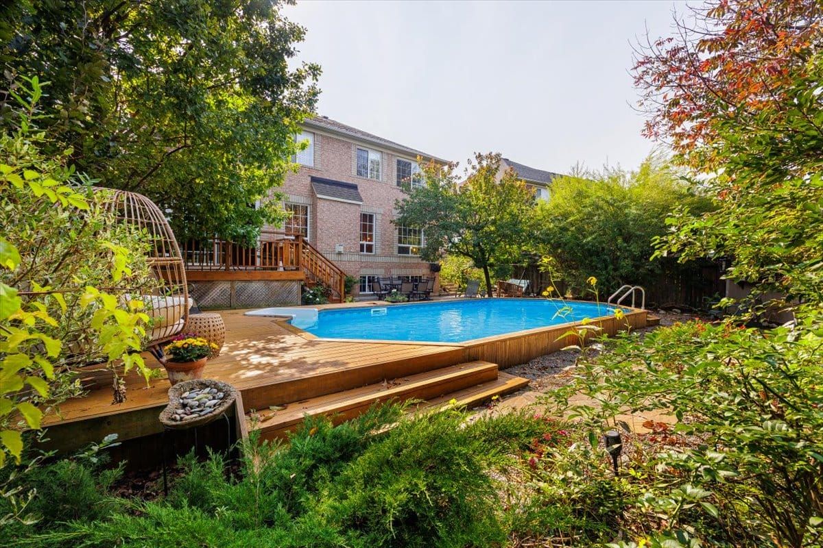 A tranquil country escape in the middle of the city, nestled on a premium south-facing lot that backs onto a ravine! Prime location: quiet street, park, schools, shopping, and transit in walking distance. Outdoor oasis: large saltwater pool, two decks, and three patio areas and pool cabana. The meticulously landscaped property features a variety of gardens with perennial flowers, shrubs and mature trees. Elegant interiors: high-quality wood flooring flows throughout the home, complemented by ceramic tiles. Beautiful backsplash throughout the kitchen. Marble fireplace mantle is a beautiful focal point in the grand room. Spa-like ensuite bathroom with soaker tub. Many builder upgrades, including 10-ft ceilings, walk-in closets and pantry, and upgraded windows throughout the home that really bring in the natural light. Lookout basement with large windows, includes a full bathroom and storage room. Convenient exterior: outdoor sprinkler system, and separate side door entrance with access to basement and garage. *for additional property details click the brochure icon below*
