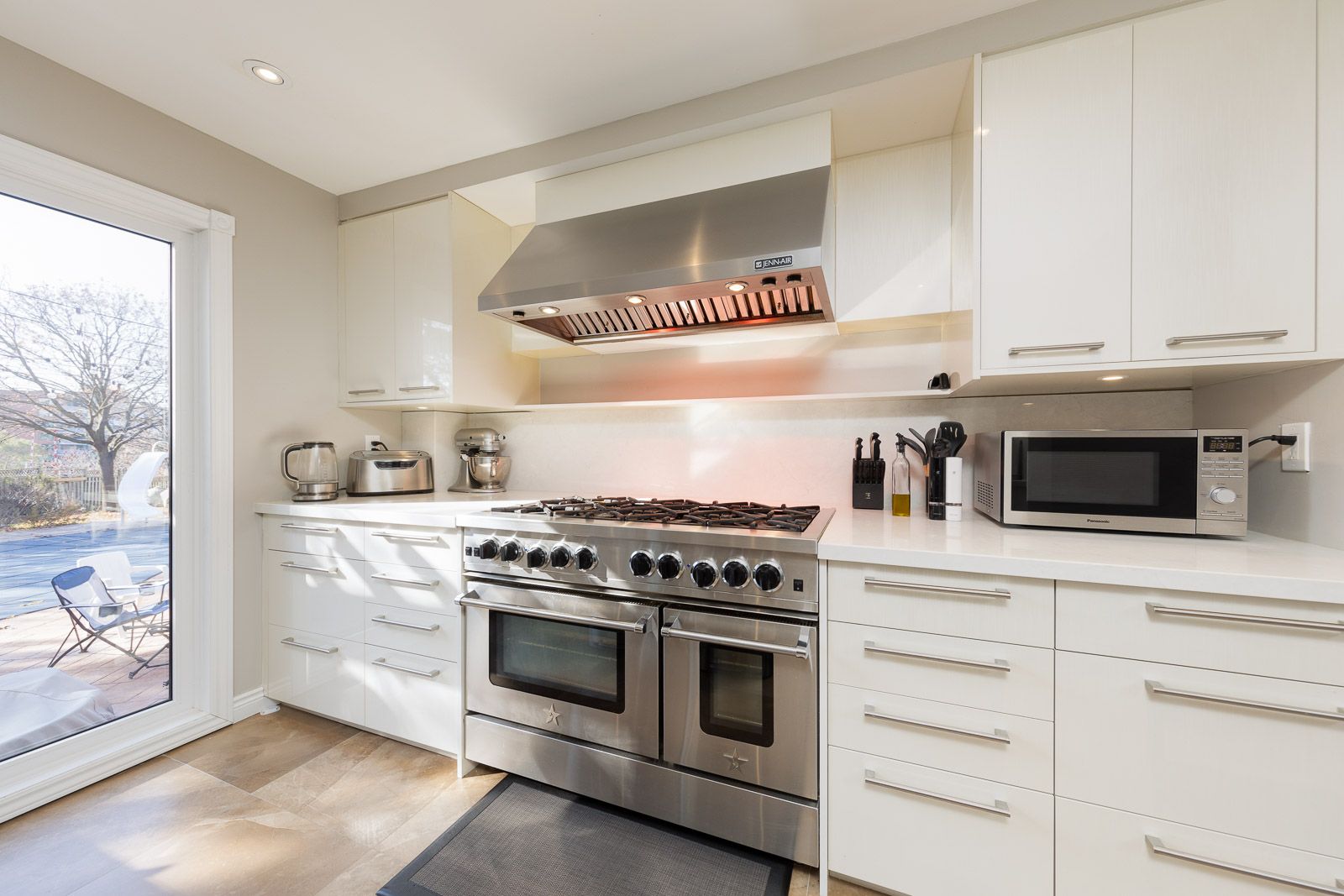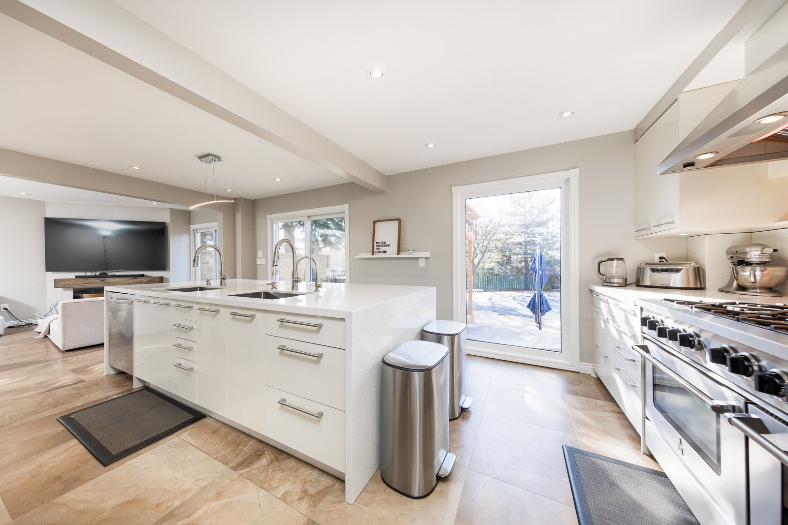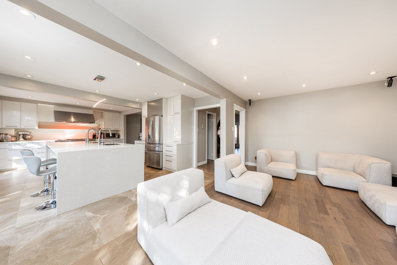 • Renovated kitchen with high-end appliances and heated floors for comfort.
