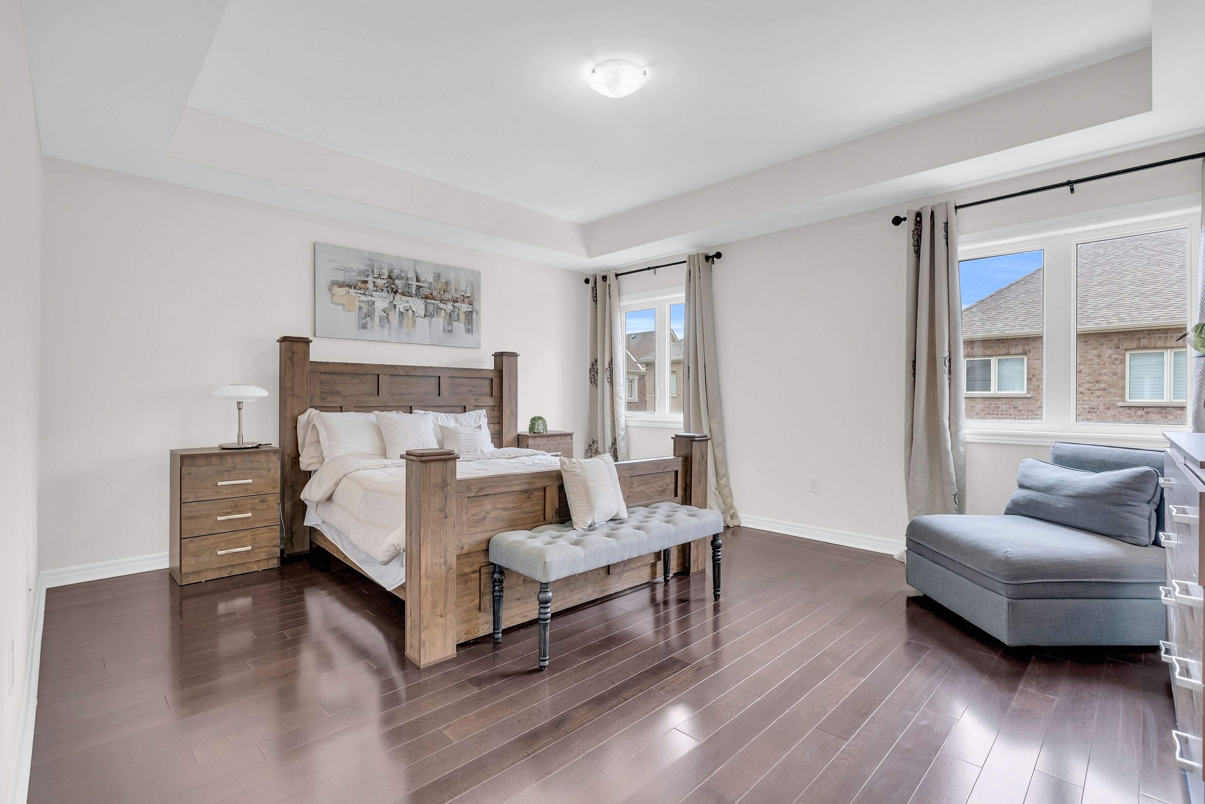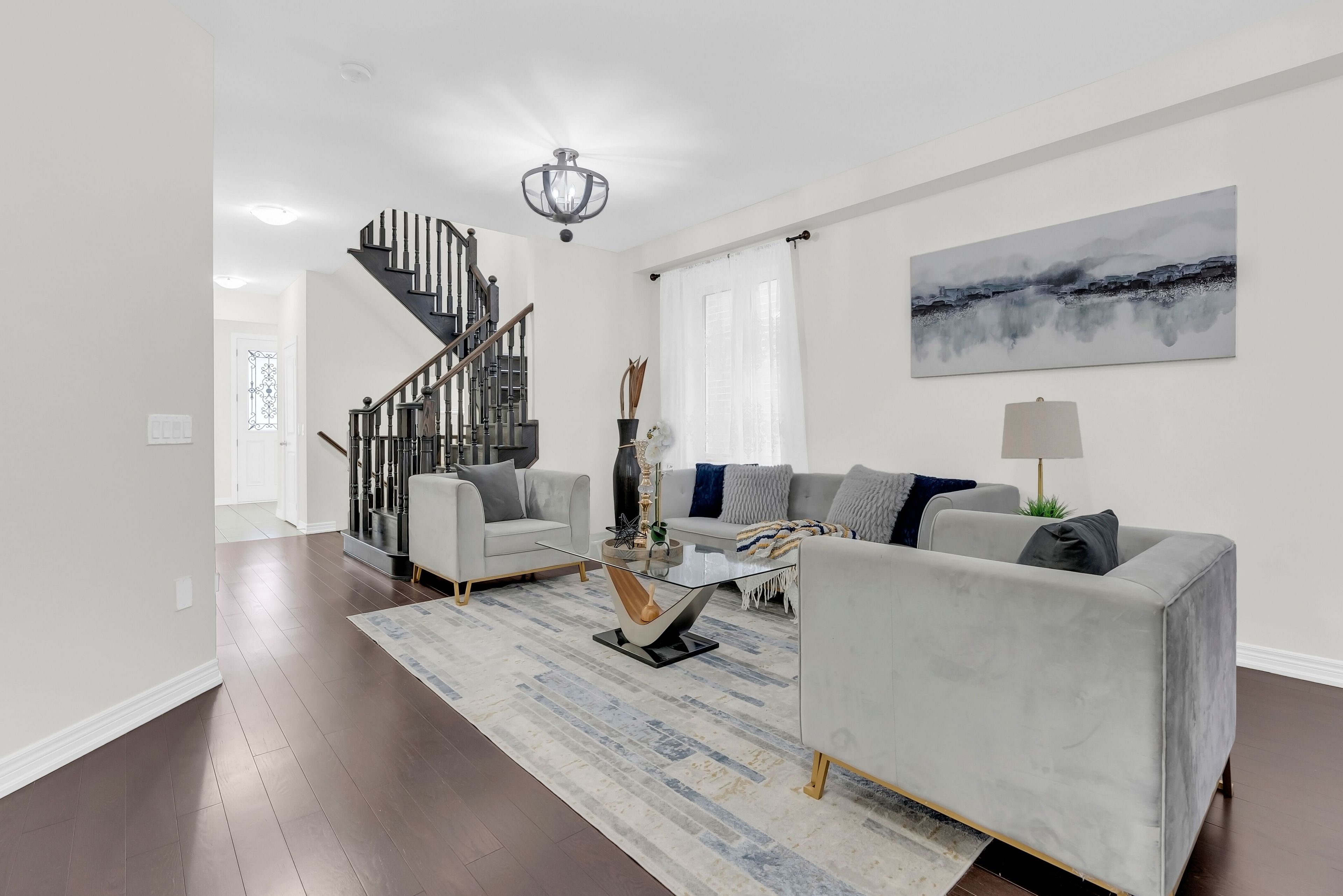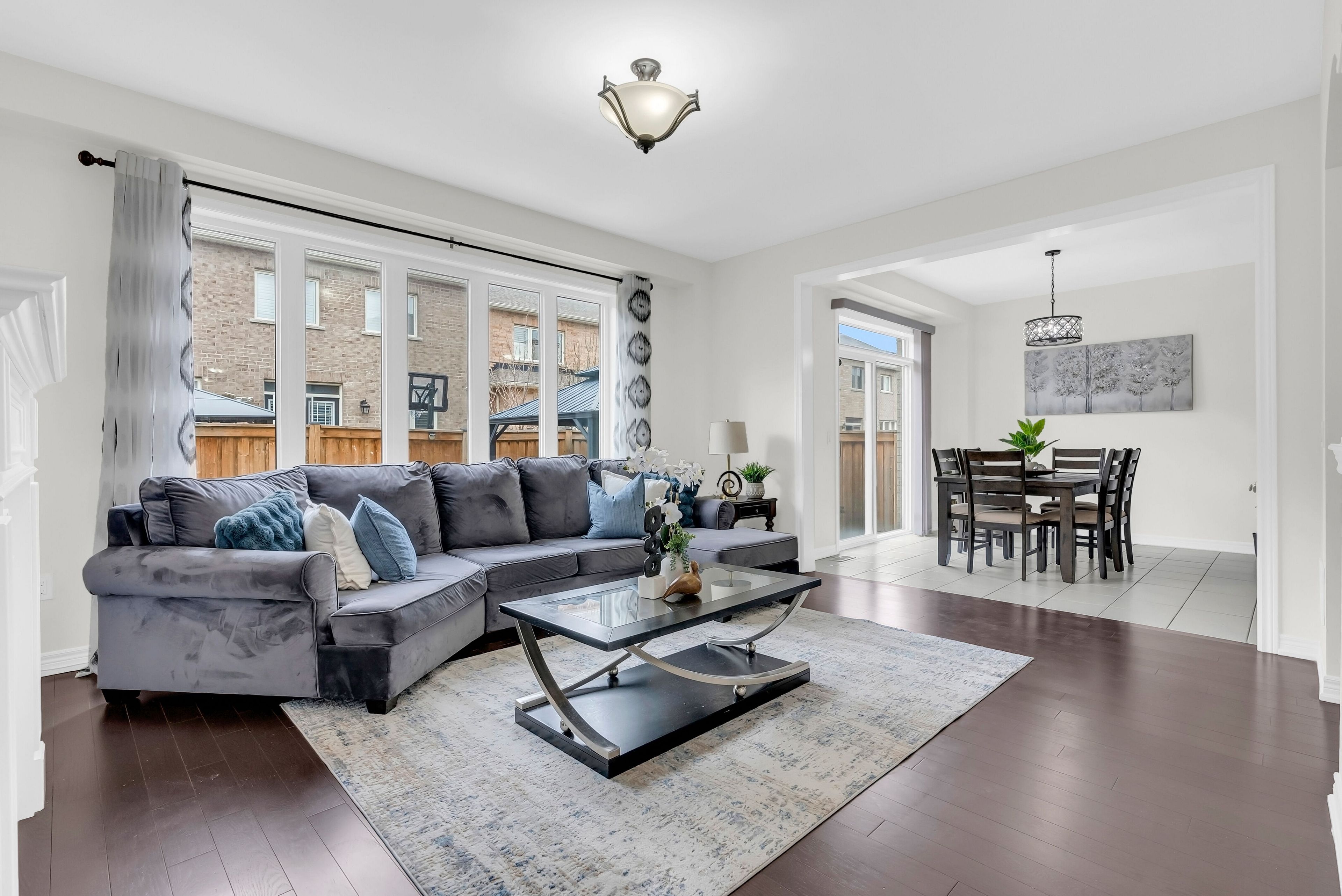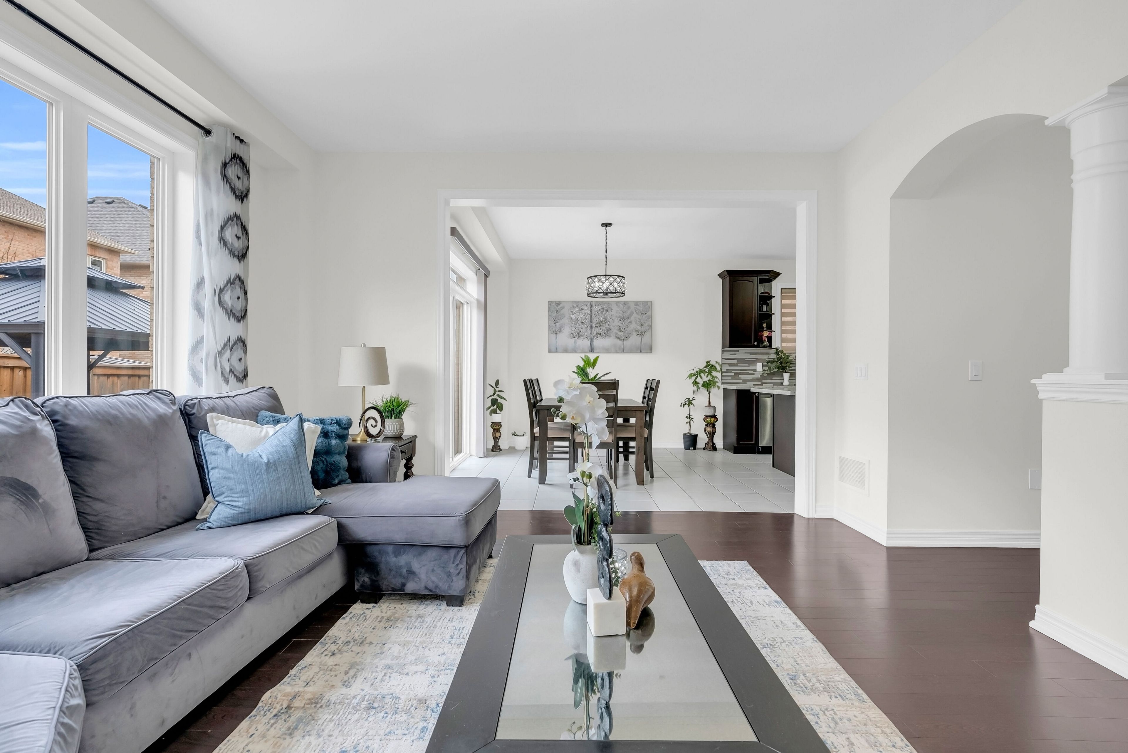 • Open-concept layout with 9-foot ceilings and hardwood flooring throughout.