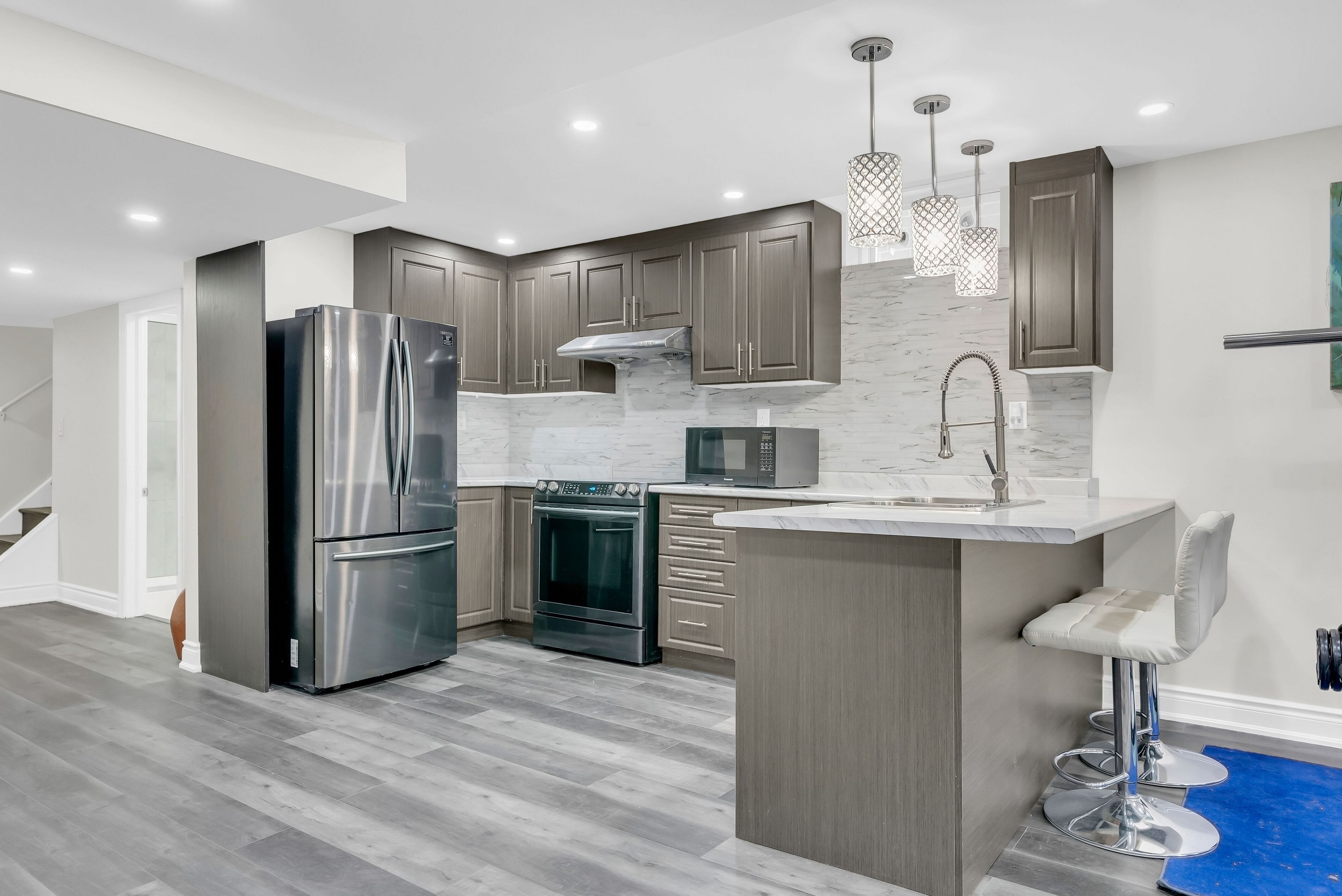 Welcome to this stunning rosehaven-built ravenscliffe model, offering the perfect blend of luxury, space, and functionality. Featuring five spacious bedrooms and three full bathrooms on the upper level. This freshly painted home is designed for comfort and convenience. The double-door entry opens to a well-designed layout with 9-foot smooth ceilings and hardwood flooring throughout. The main floor boasts combined living and dining areas, complemented by a bright, open-concept family room with a gas fireplace. The spacious kitchen features granite countertops, a breakfast bar, and a sunlit breakfast area with walk-out access to a fenced concrete backyard and patio-ideal for entertaining. The primary bedroom includes a 5-piece ensuite, walk-in closets with built-in designer-by-closet organizers throughout, and a raised coffered ceiling for added elegance. The finished basement offers a large one-bedroom suite; a full glass shower stand-up bathroom with clear tempered glass walls and sliding doors; full ready laundry; and a kitchen-adorned with pot lights and an electric fireplace-providing an additional living space for recreation or an extended in-law suite. This beautifully upgraded, move-in-ready home is conveniently located near mount pleasant go station, top-rated schools, parks, and all amenities, making it highly sought-after in the neighbourhood. Don't miss your chance to own this exceptional property!