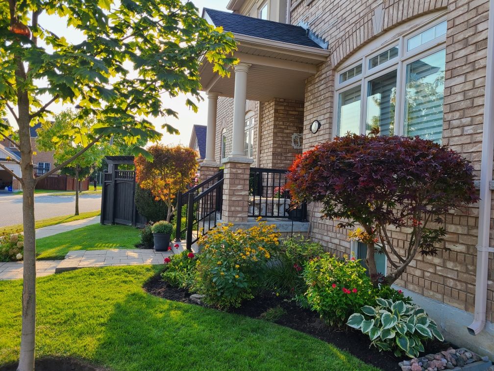• Private backyard oasis with landscaping, interlocking stone, and a gazebo.
