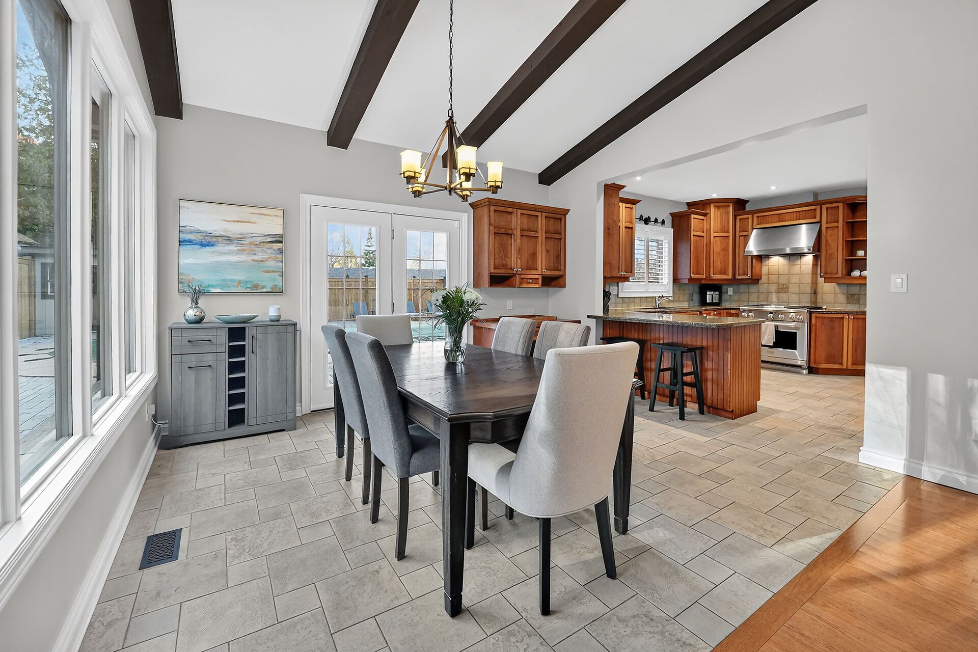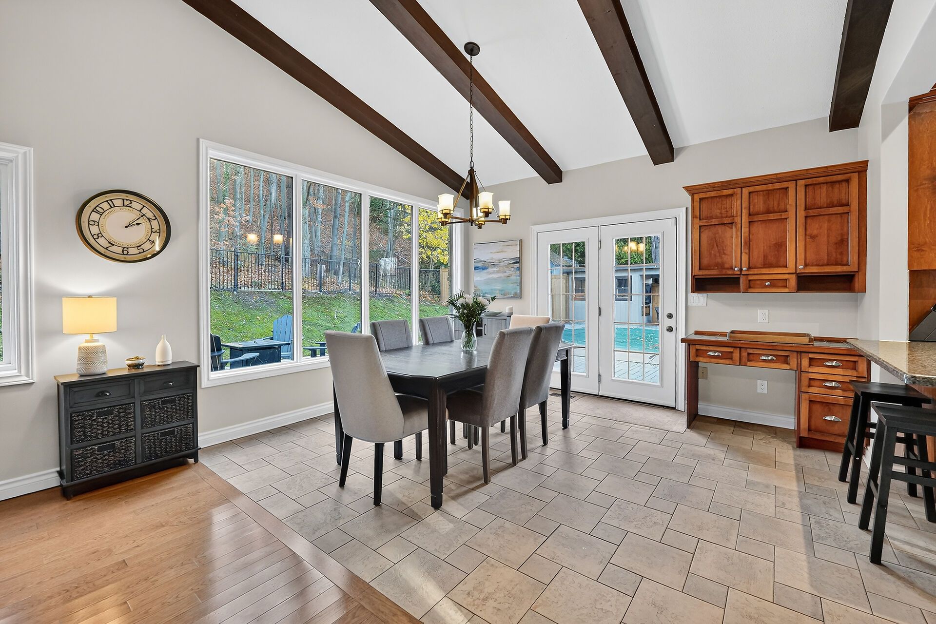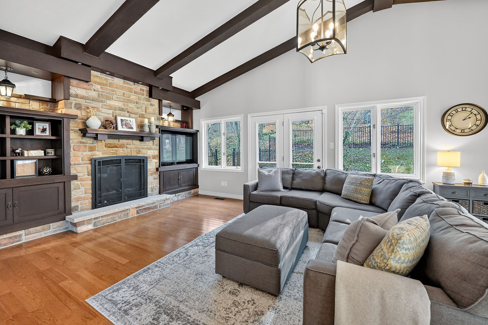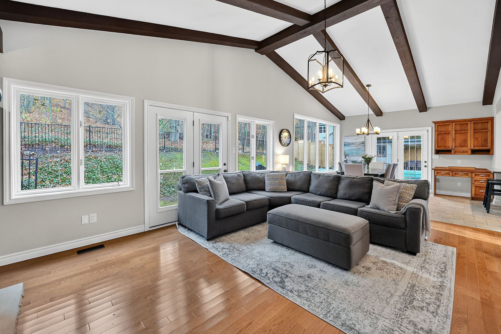 • Large family room features wall-to-wall windows and cathedral ceilings.