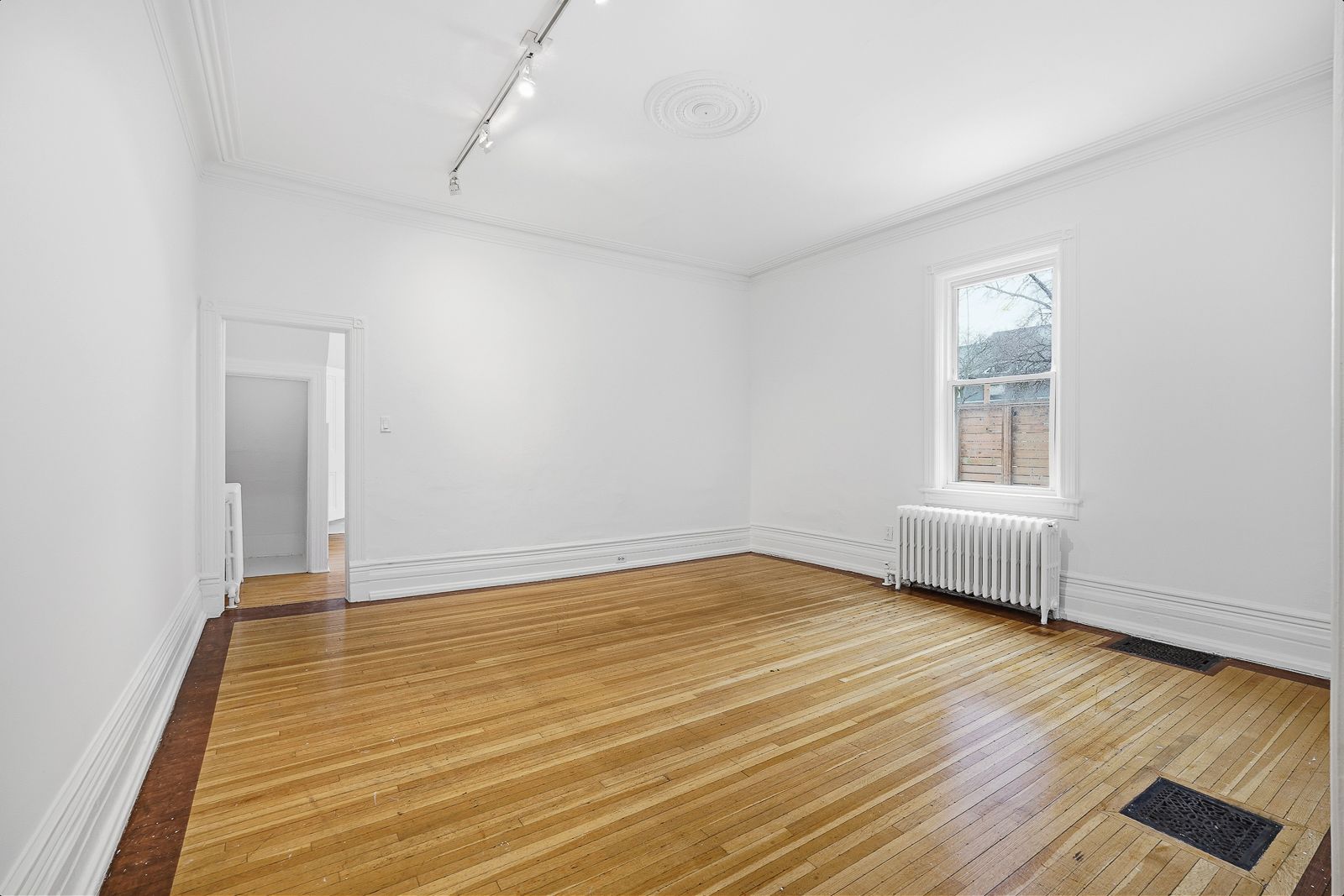 • Spacious rooms with high ceilings and hardwood flooring throughout.