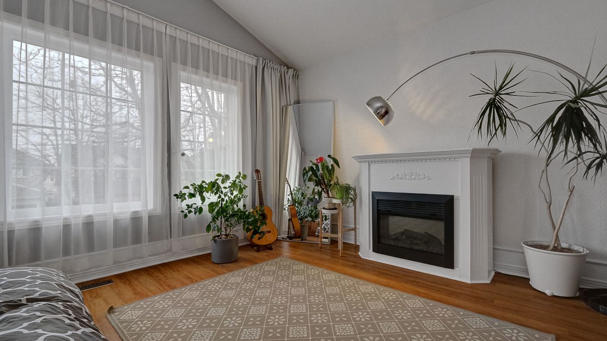• Spacious primary suite with electric fireplace and walk-in closet.