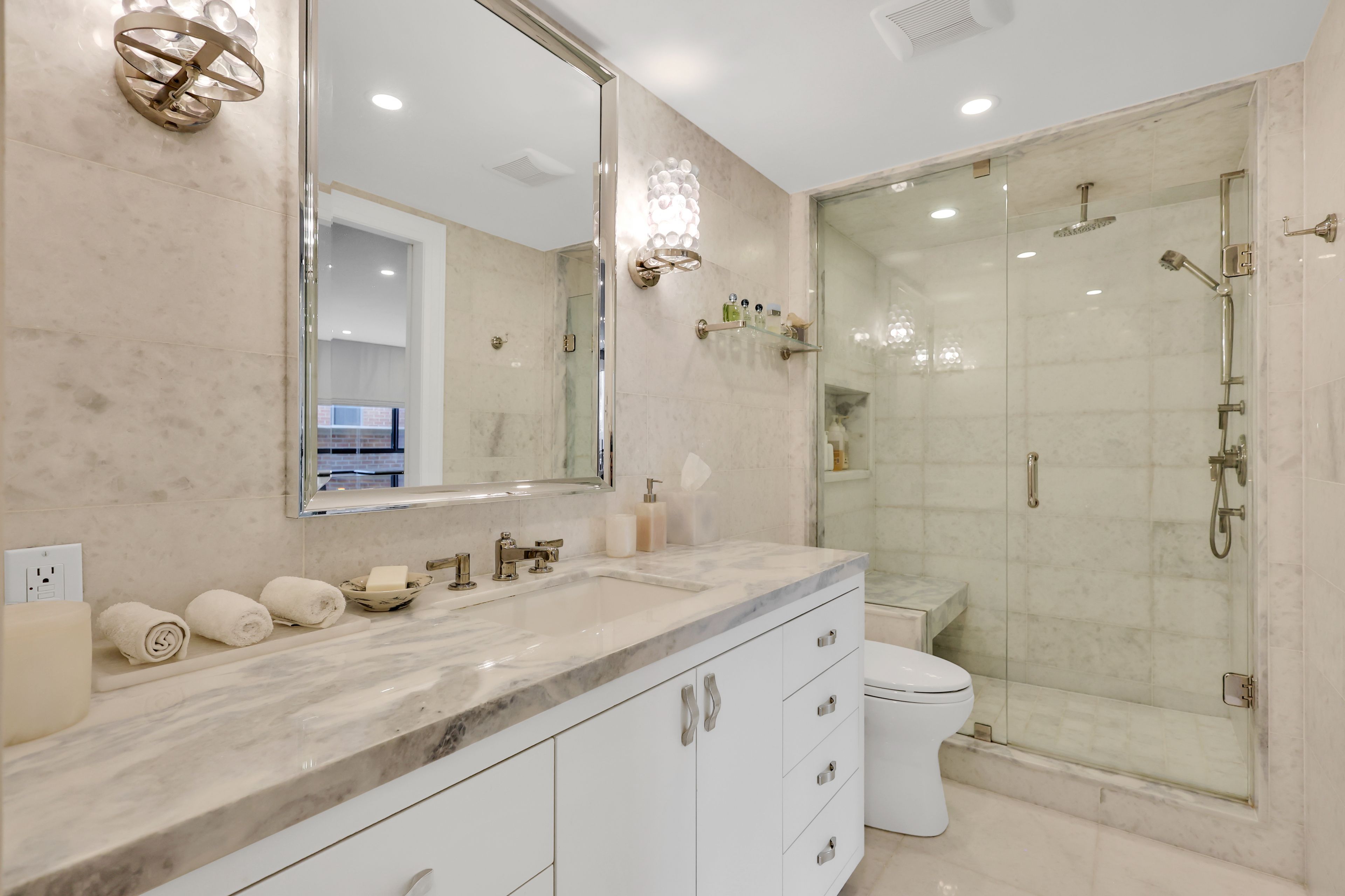 • Modern chef's kitchen with marble countertops, perfect for cooking and entertaining.