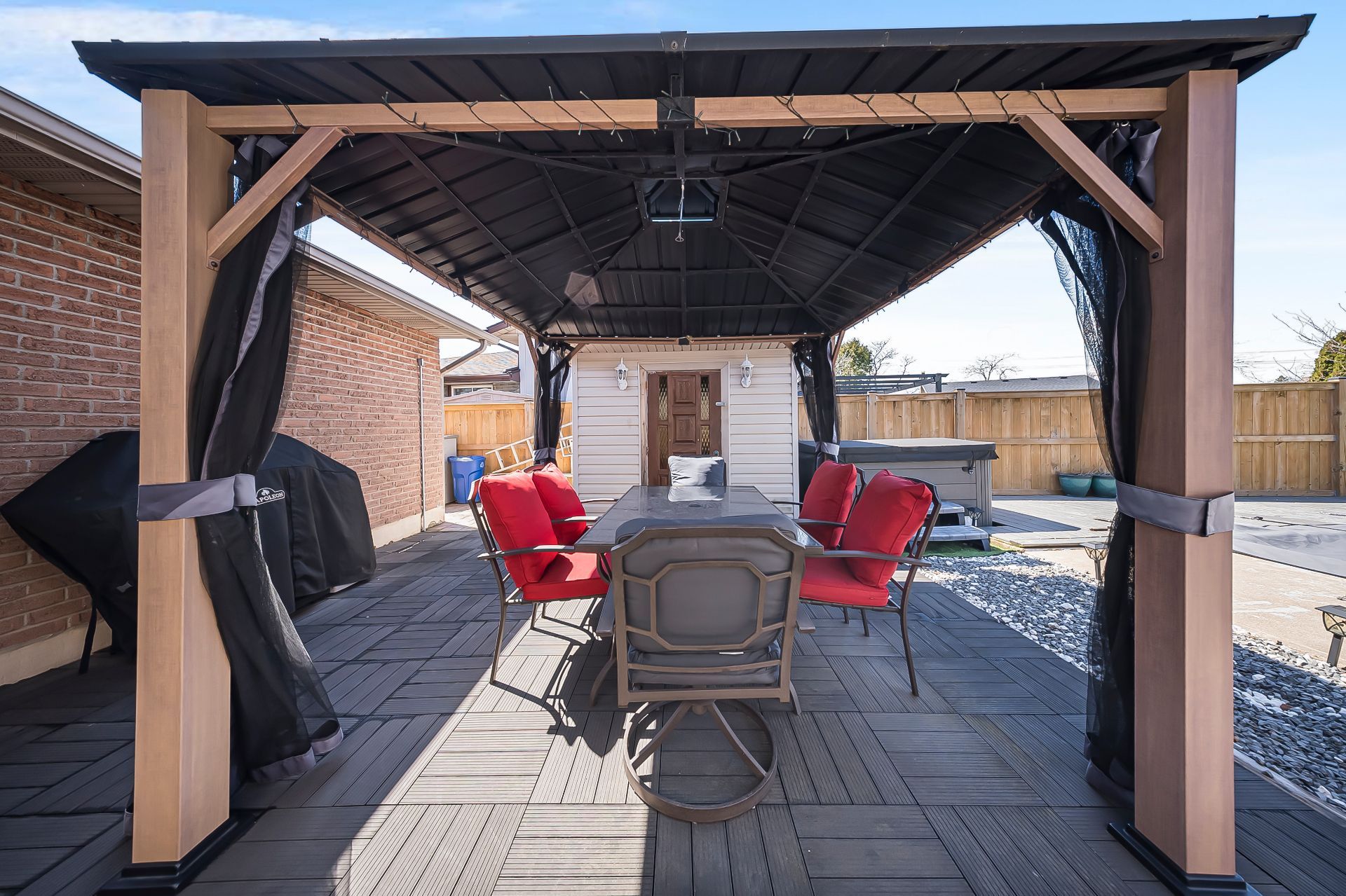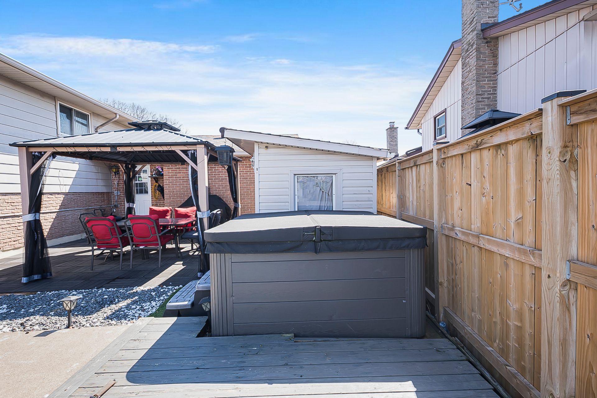 • Private backyard with in-ground pool, hot tub, and patio area.