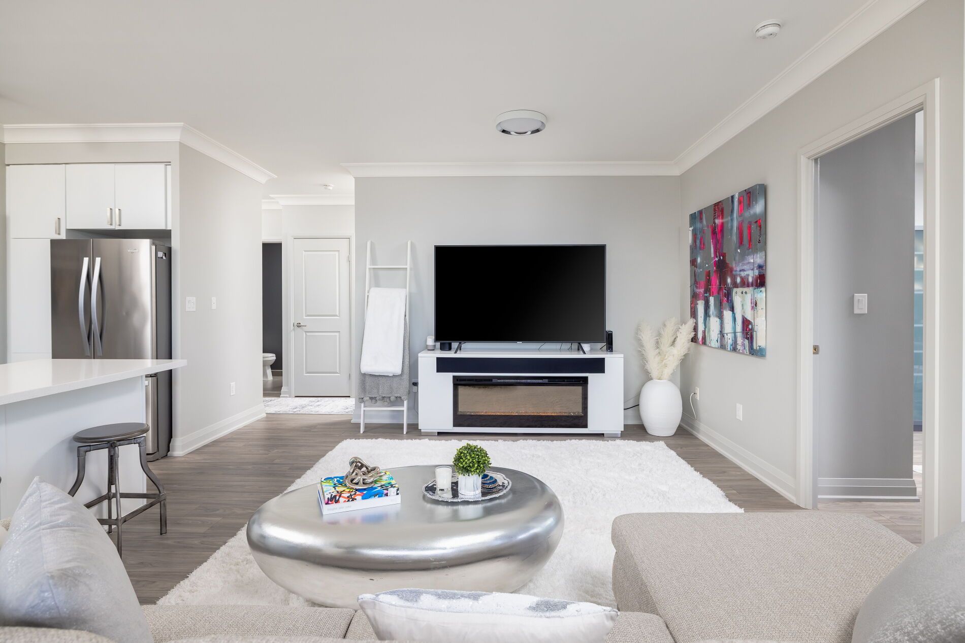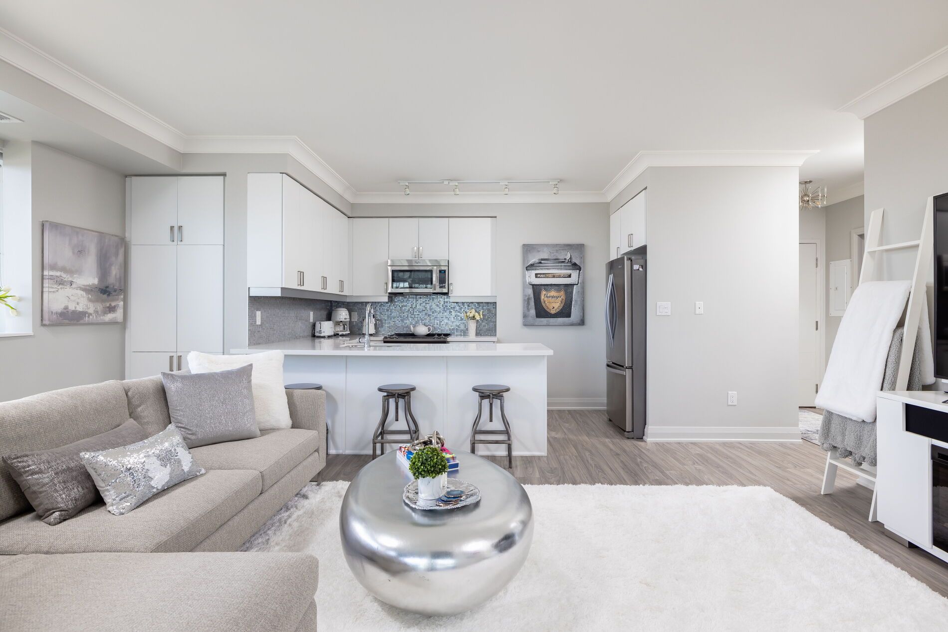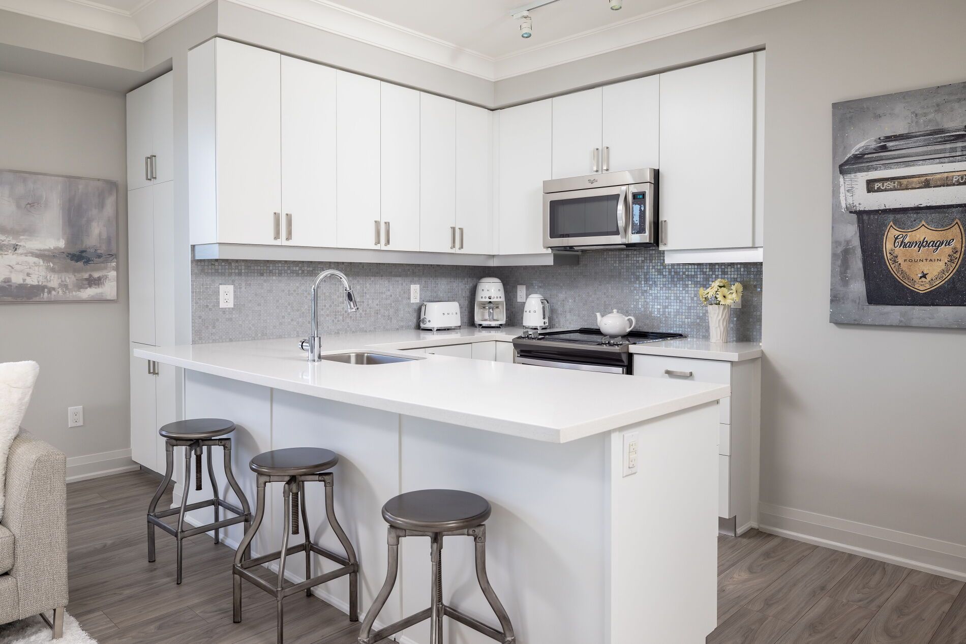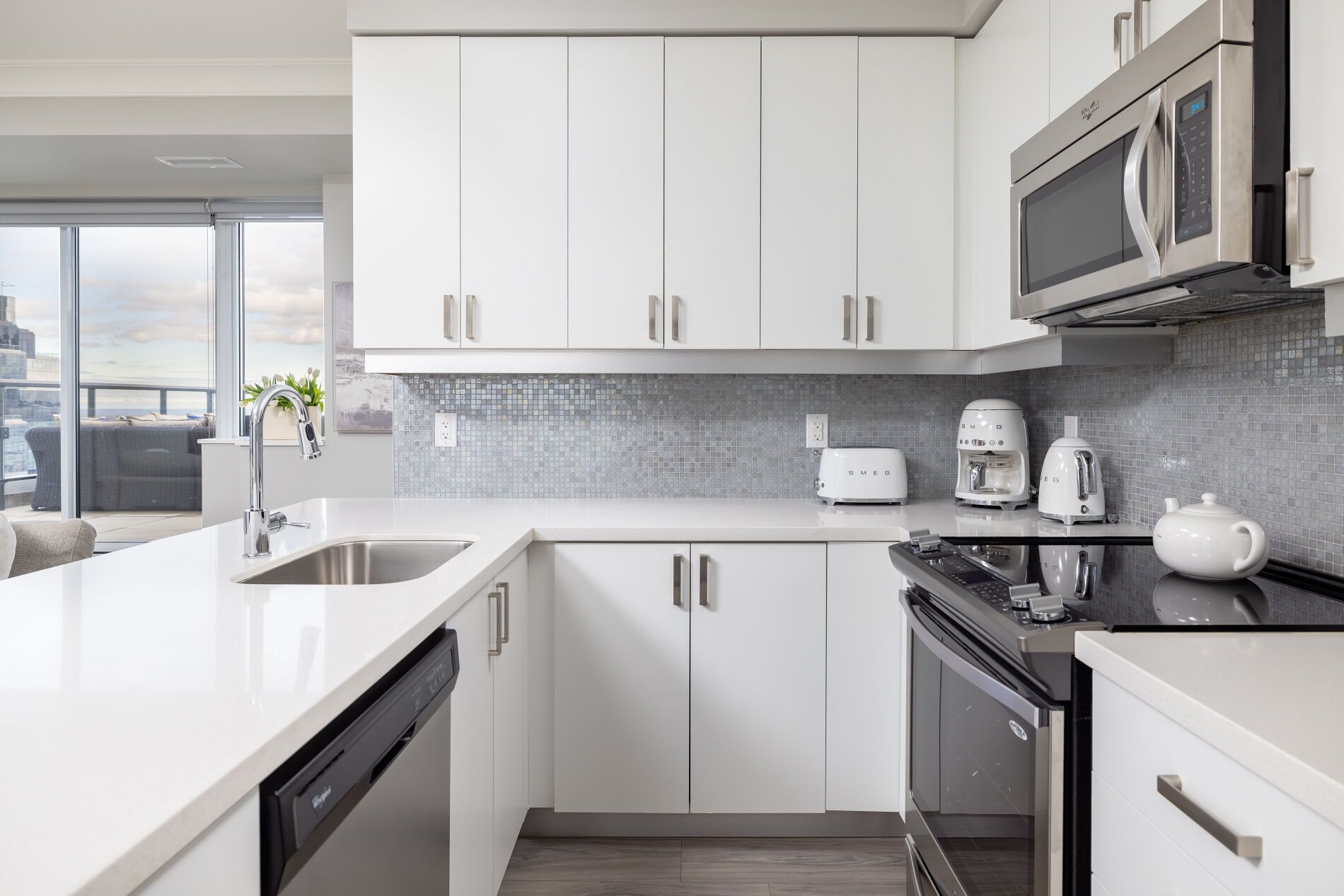 • Luxurious kitchen with quartz countertops and stainless steel appliances.