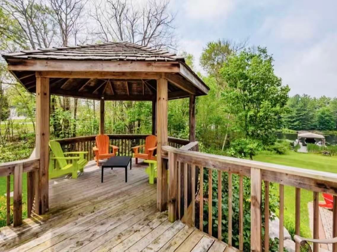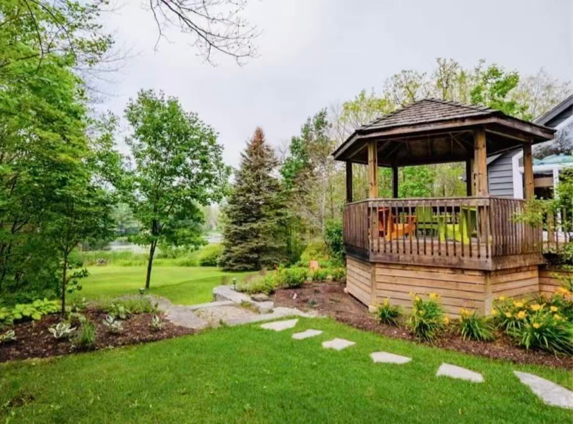 • Beautifully landscaped yard featuring a deck and gazebo with water views.