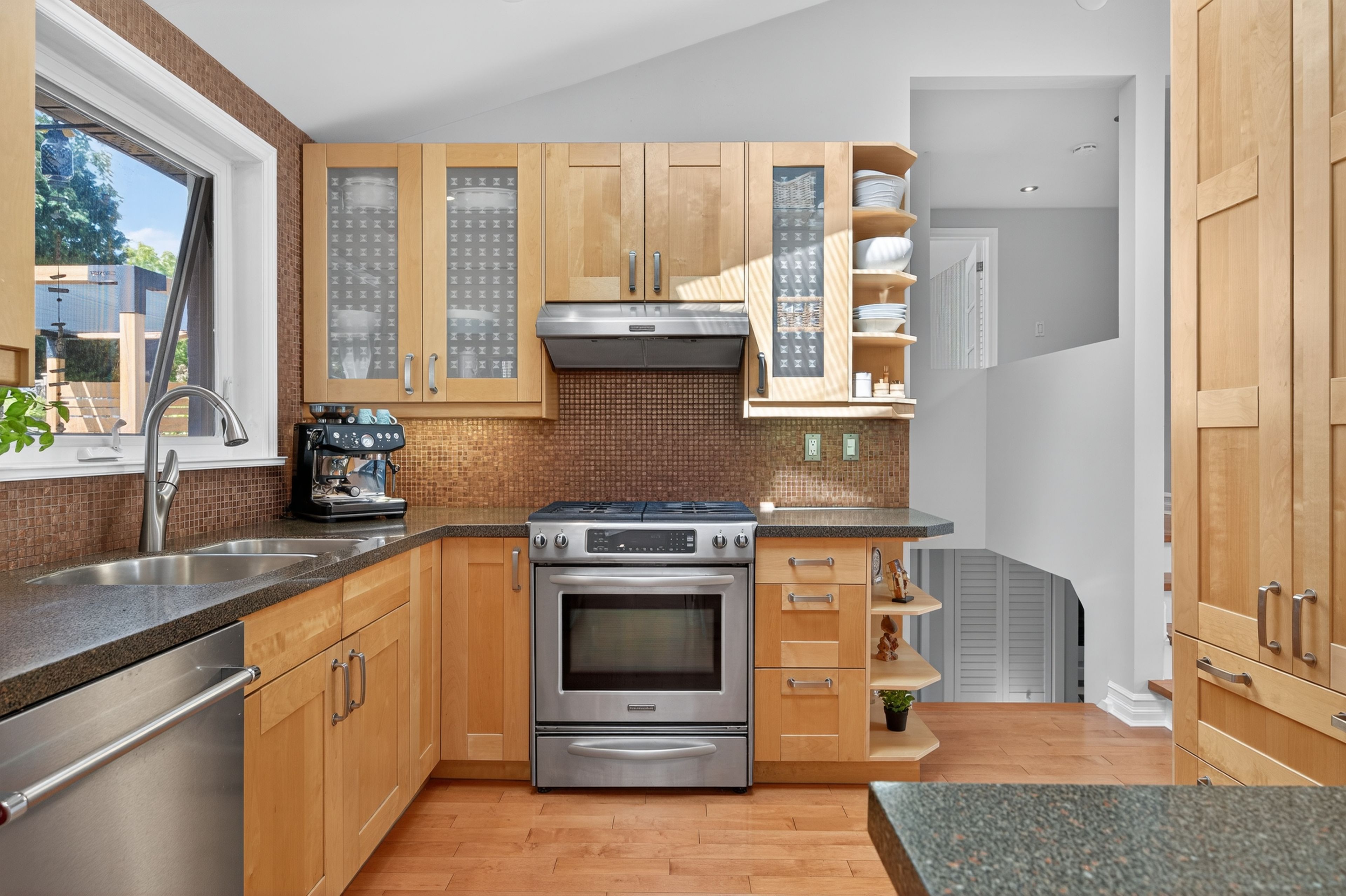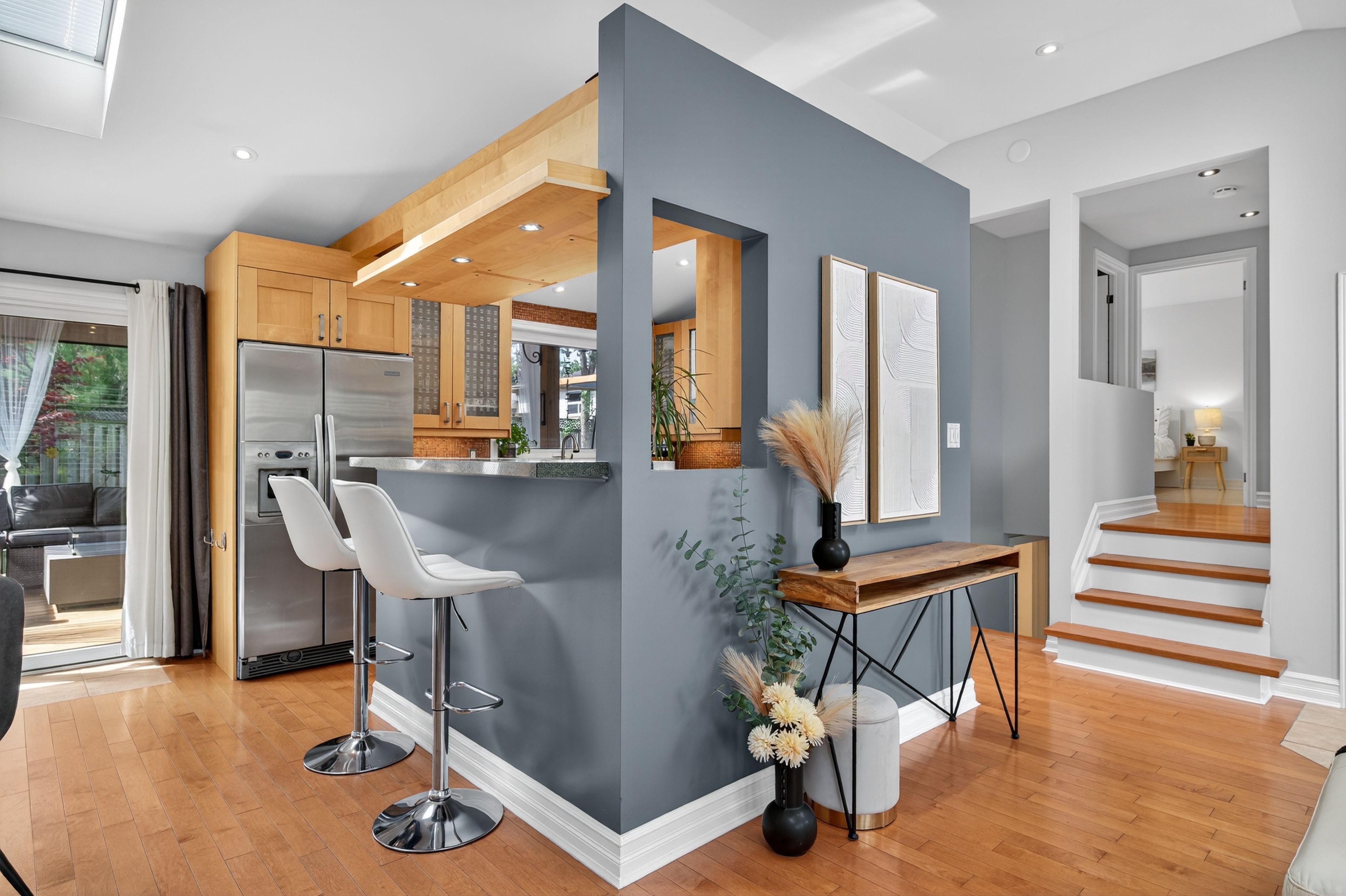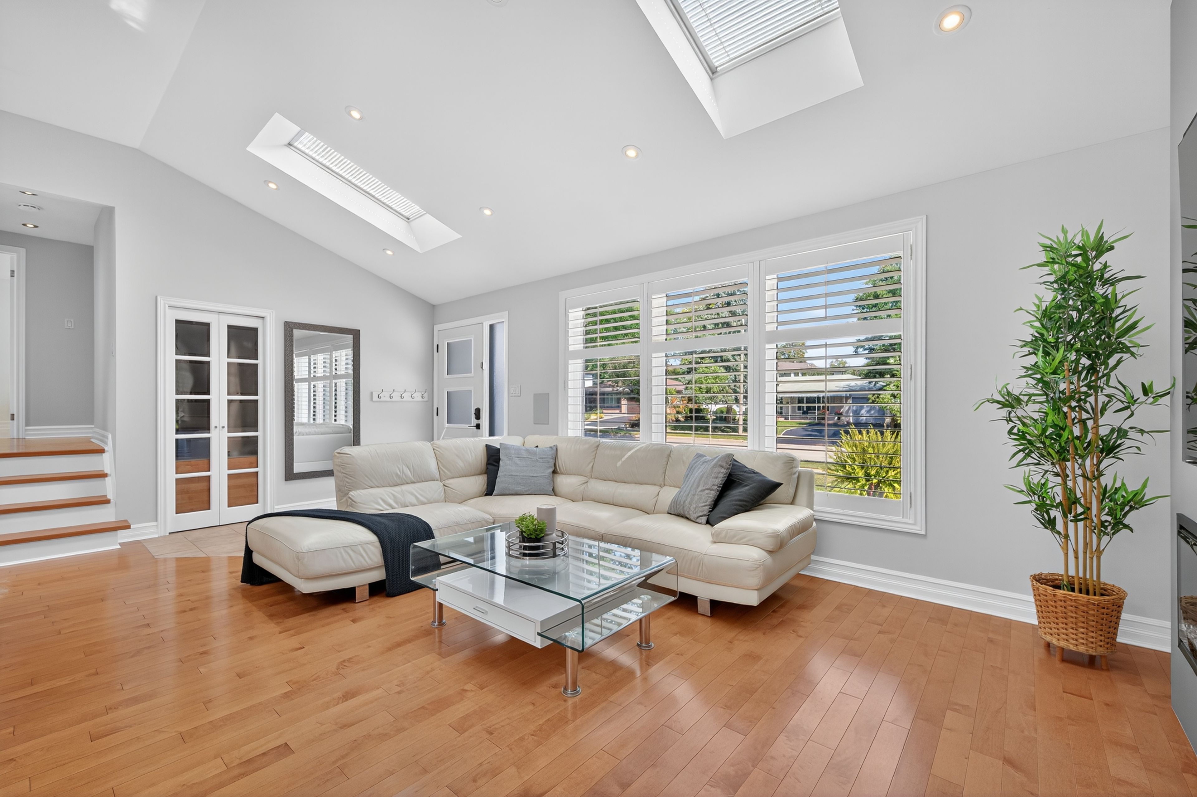 • Open-concept main floor with vaulted ceilings and skylights.