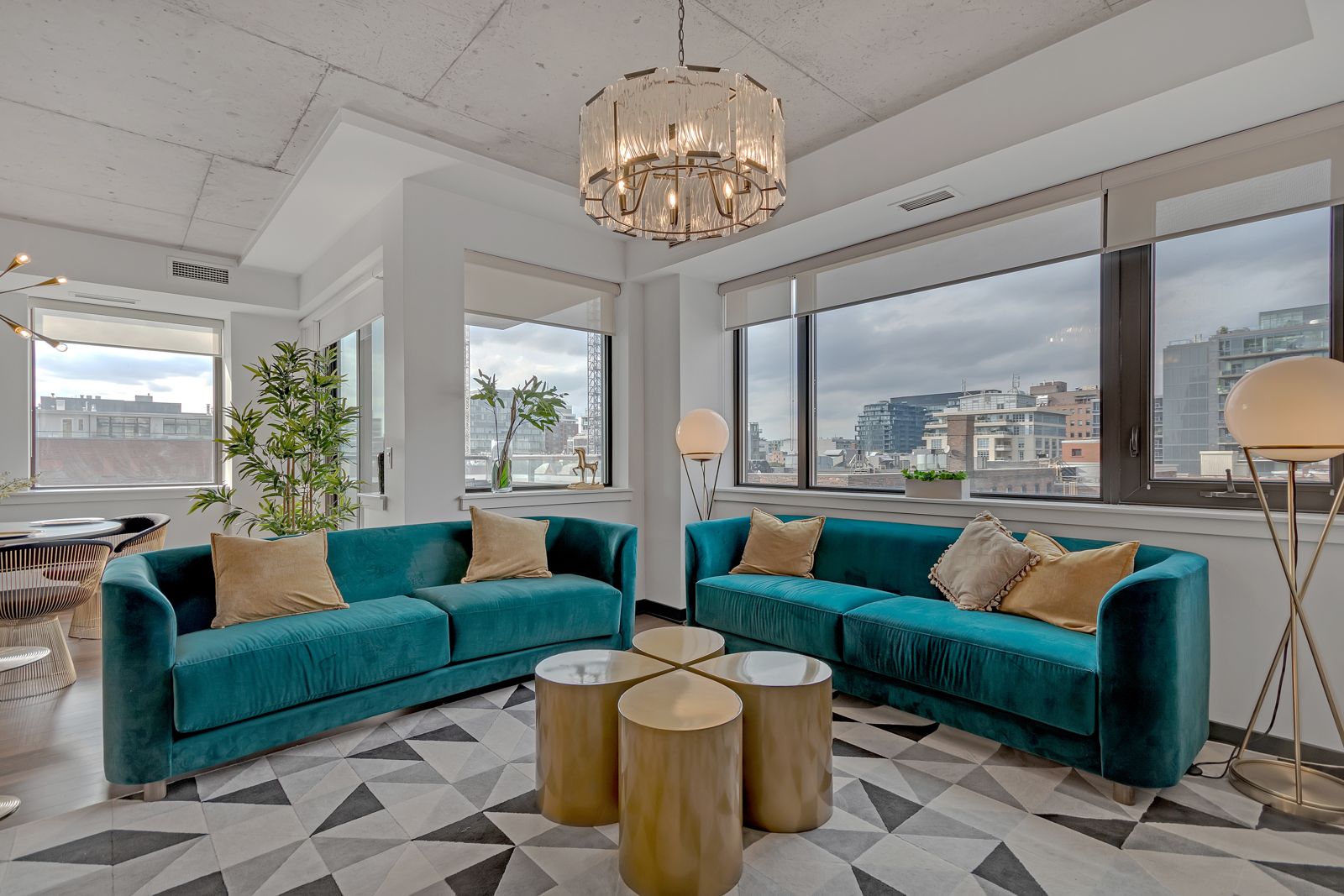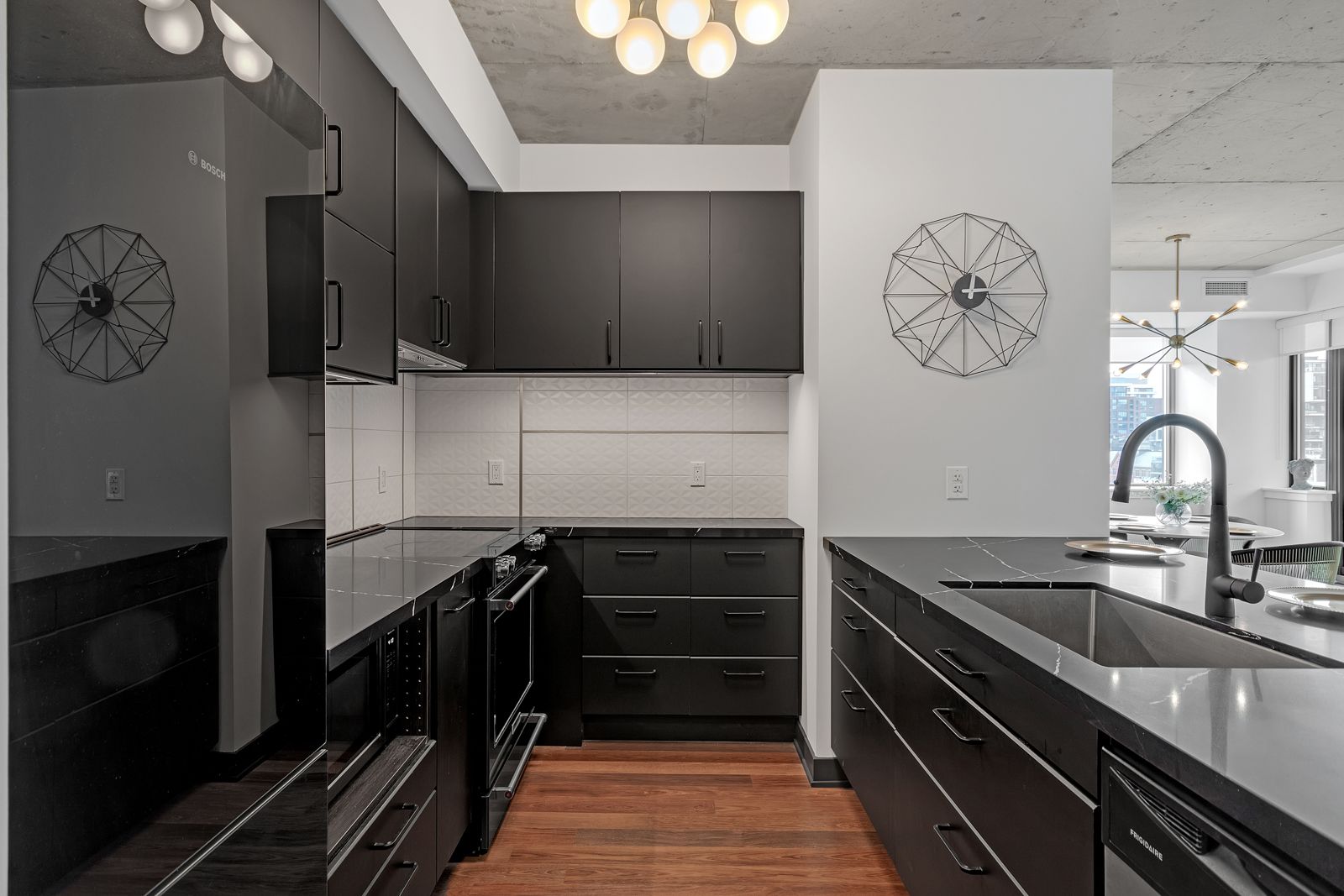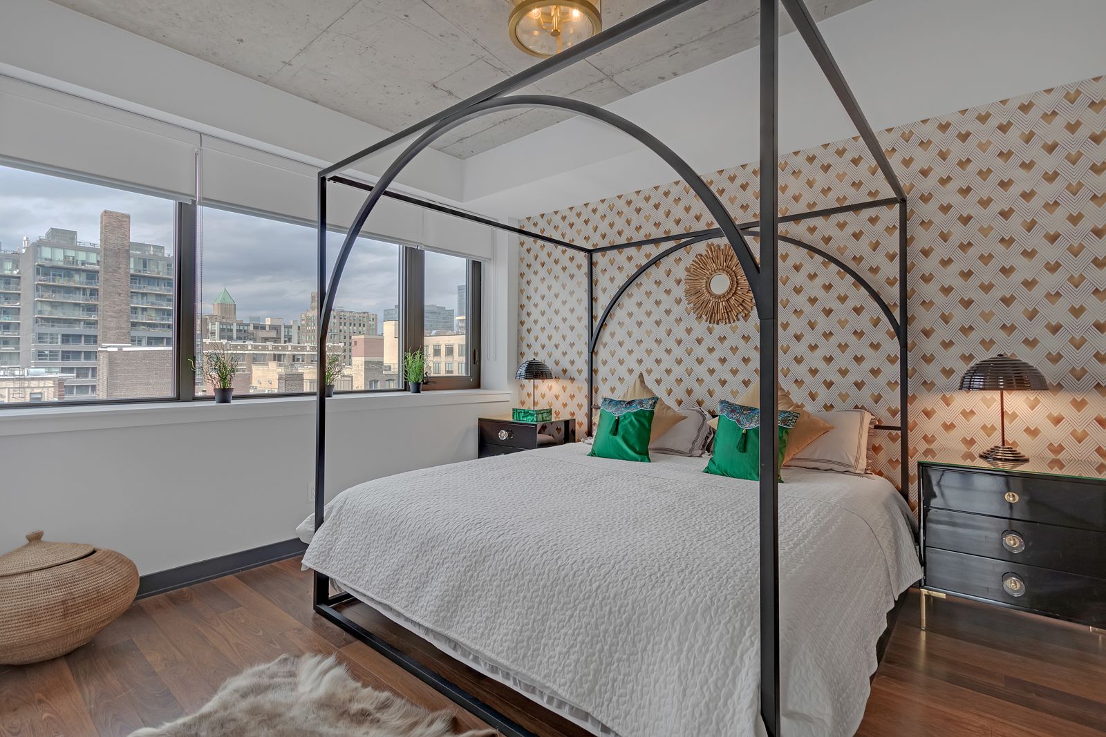 Highly sought after 1 of a kind mid-rise boutique building on a quiet st near king & spadina. Fully furnished sophisticated mid-century chic 2 bedroom luxe suite. This absolute gem encapsulates the finest of dt living. Designer kitchen, stylish lights, blackout blinds & beautiful hardwood t/o. Spacious open concept, 1085 sqft corner suite with soaring exposed concrete ceiling. Enjoy a coffee on your stylish breakfast bar or watch the sunset on priv. Balcony