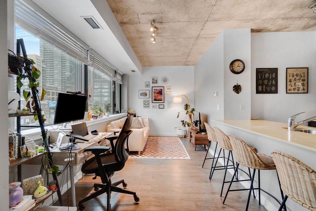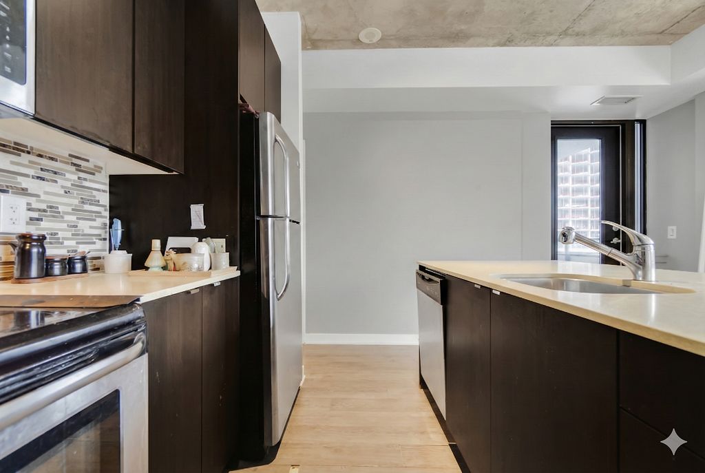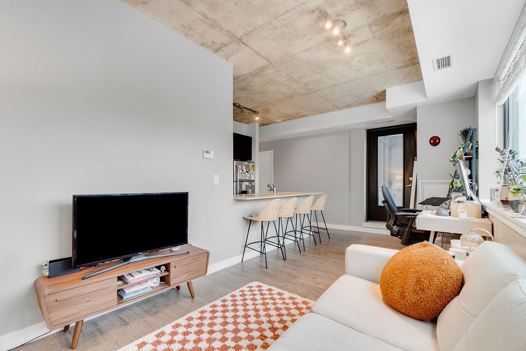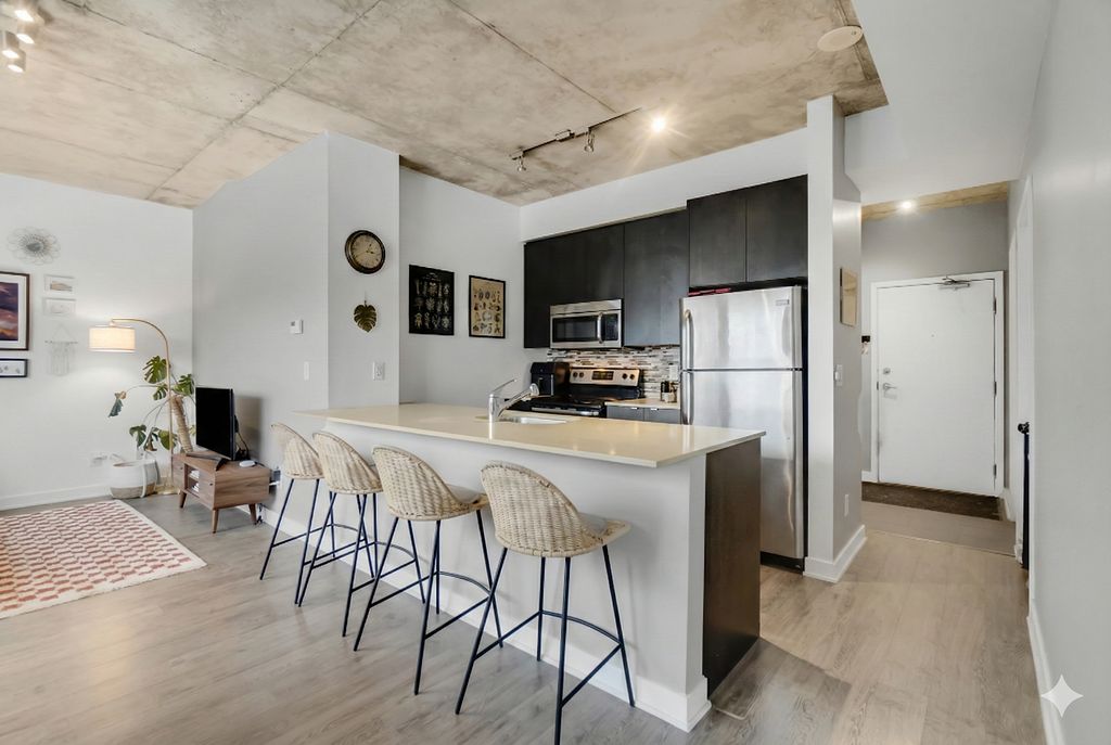 • Bright open layout with 9-foot ceilings and modern kitchen.