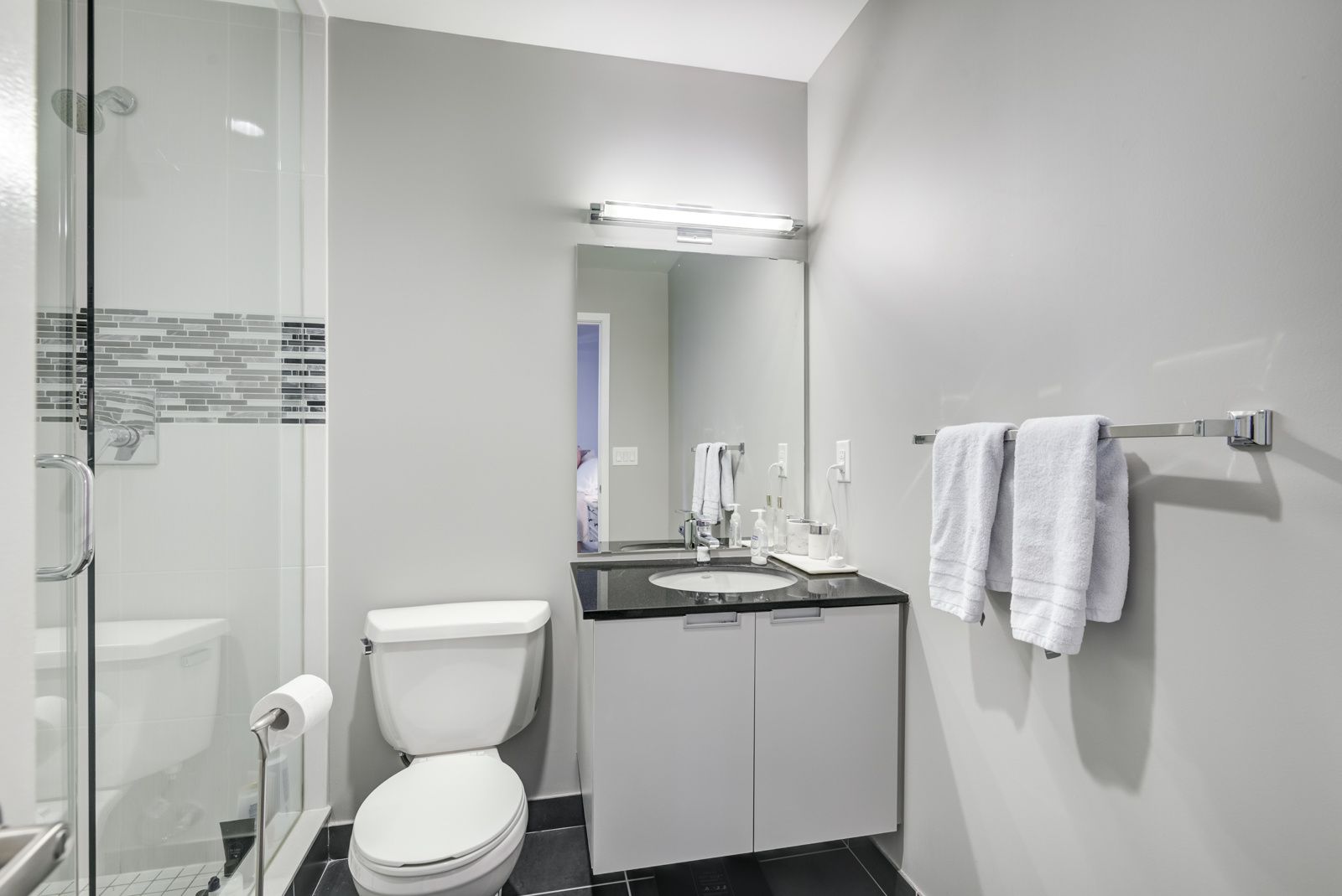 Minimalist boutique building on millionaire's row. Very functional layout with split bedroom floor plan for privacy, south-facing balcony. Kitchen equipped with stainless steel appliance, pantry, granite counter-top, plenty of storage space. Second bedroom equipped with murphy bed. Master bedroom w/ ensuite washroom. Steps to king west, financial district and easy access to downtown/ttc/gardiner.