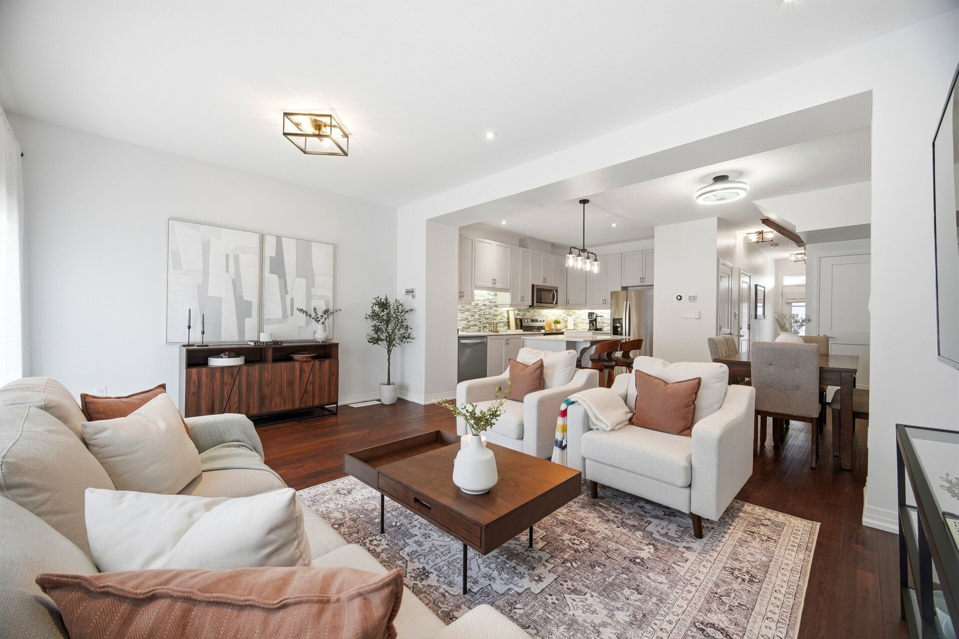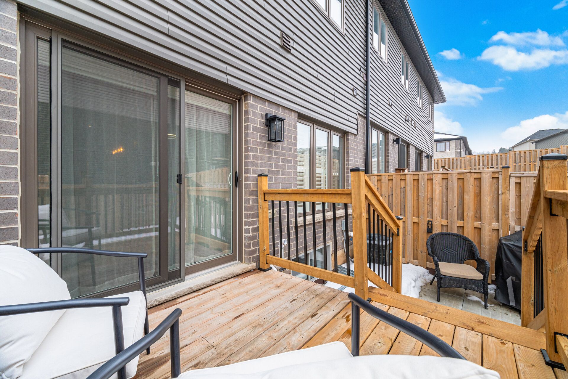 Thoughtfully laid out freehold townhouse with no road fees or potl fees. This bright open concept home was built in 2019 by losani homes. The engineered hardwood floors are a beautiful walnut shade and flows seamlessly throughout the main and second floor. The open concept kitchen is tastefully finished and gives ample storage and counter space with a centre island that doubles as a breakfast bar. The dining space allows for a full dining table that can comfortably seat between 8-10 people. The living room overlooks the fully fenced backyard with a walk out to the upgraded deck, large enough to accommodate a seating area. The second floor has 3 good size bedrooms, the primary bedroom has space for a king sized bedroom set and features a walk in closet and 3 pc ensuite. The second bedroom is also large enough to accommodate a king sized bed and has semi-ensuite privilege. The laundry room is conveniently located on the second floor and has built in shelves and hanging rods for extra storage and convenience. The basement has been finished with luxury vinyl flooring, a 2 pc bathroom and 3 storage rooms. This home is completely move in ready and meticulously maintained that shows true pride of ownership.