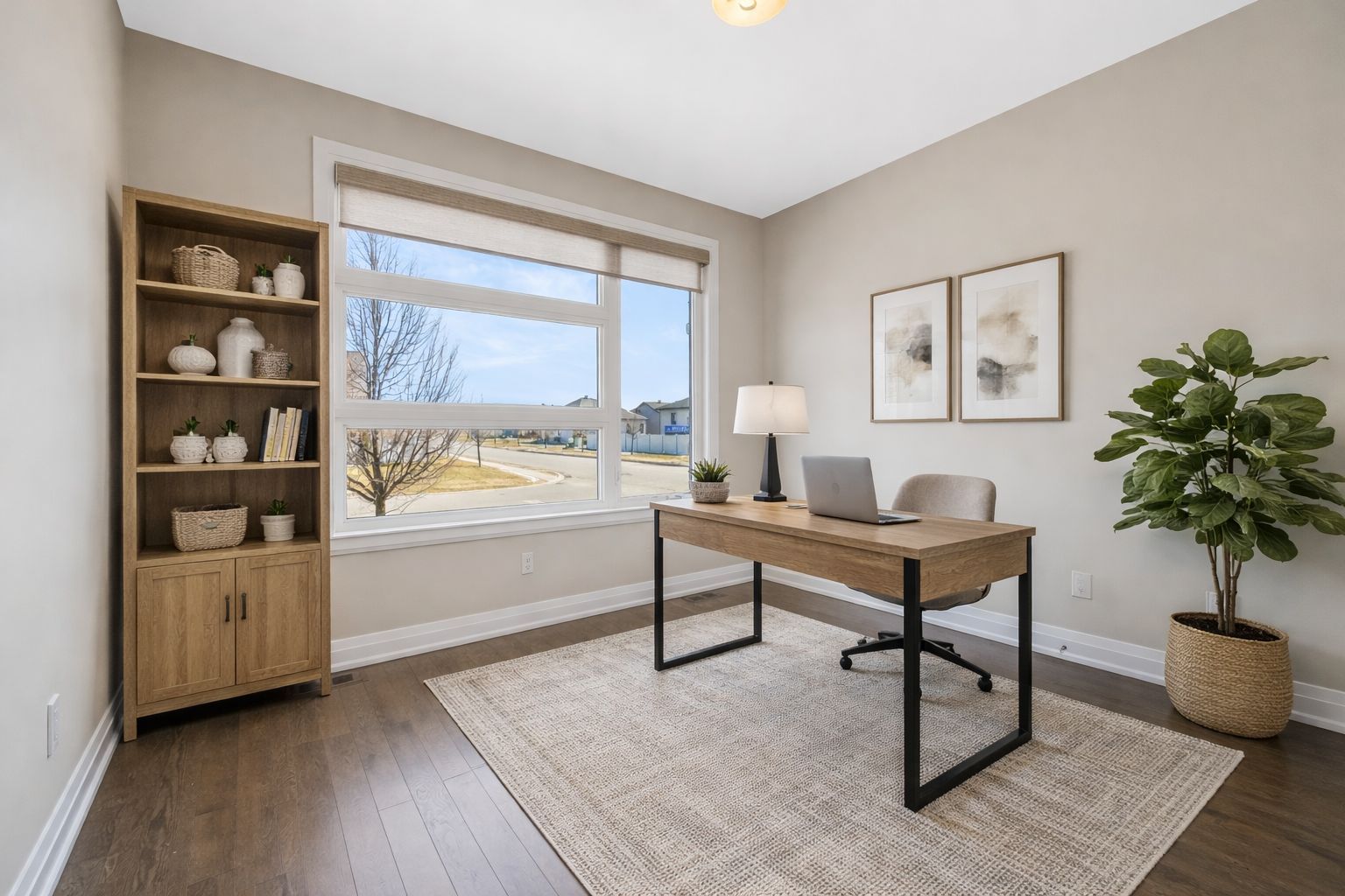 • Versatile main-floor primary bedroom with ensuite and office space.