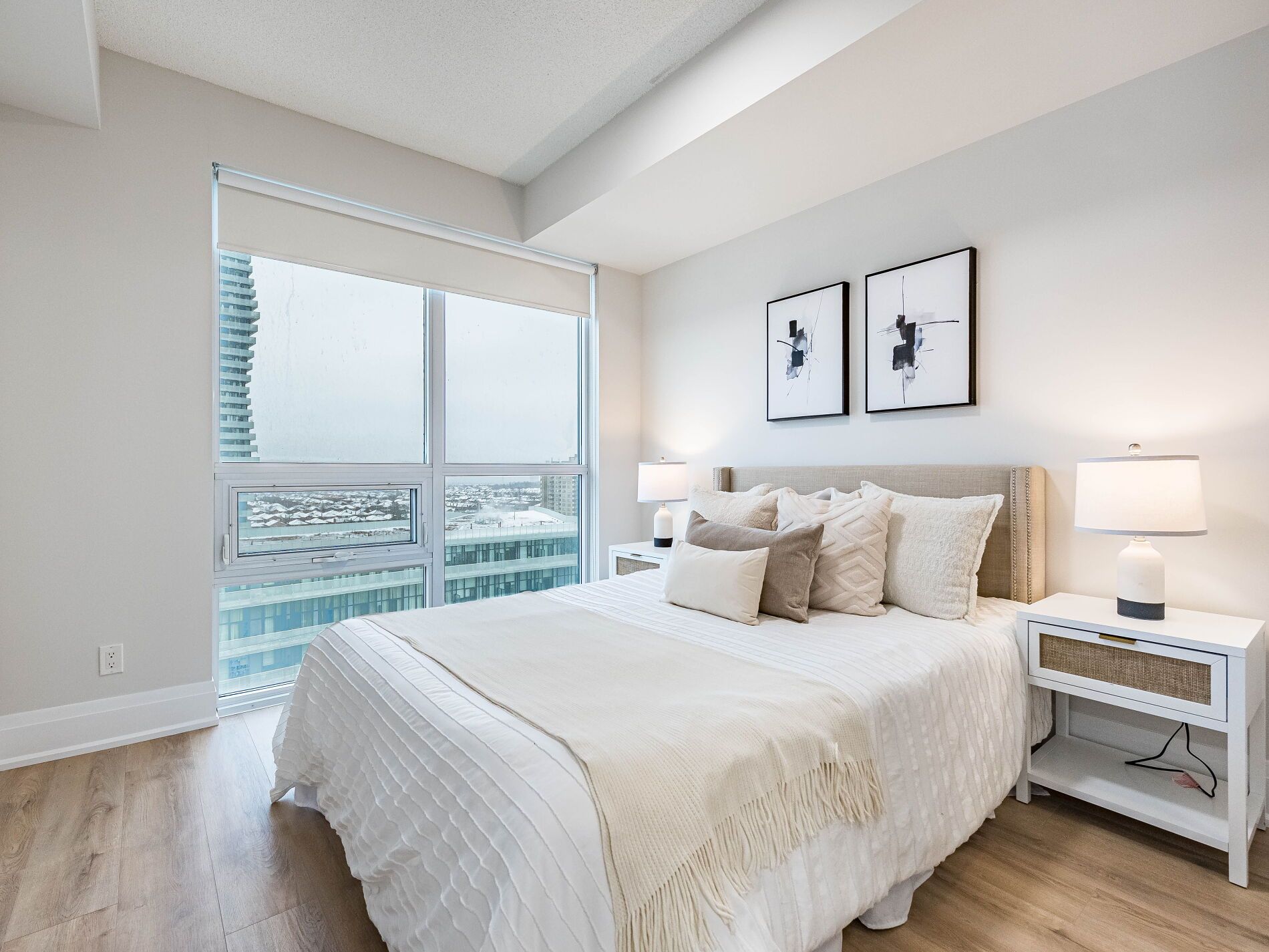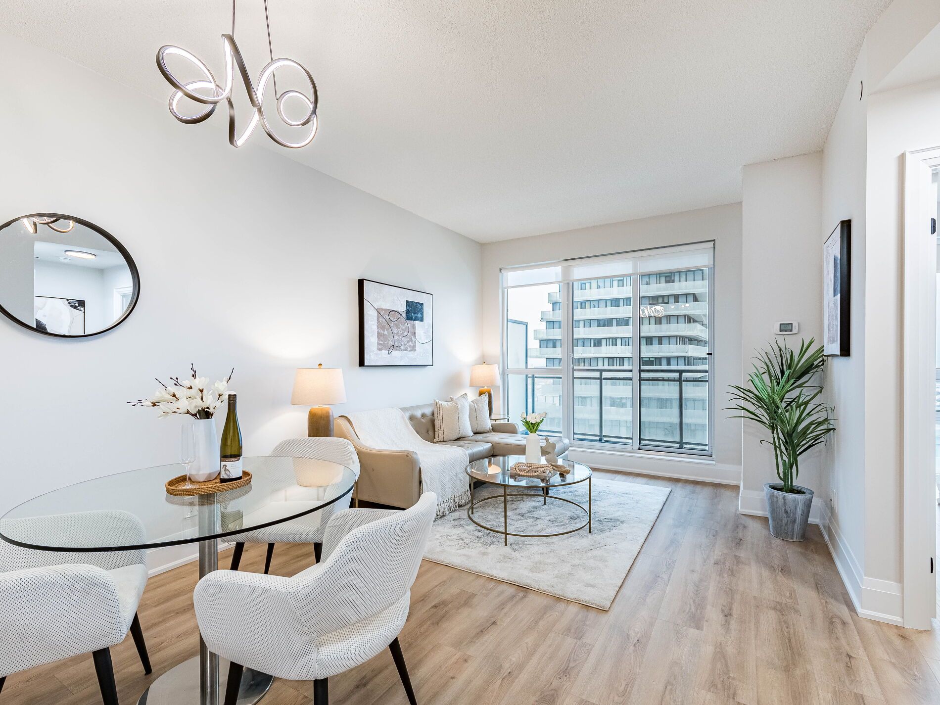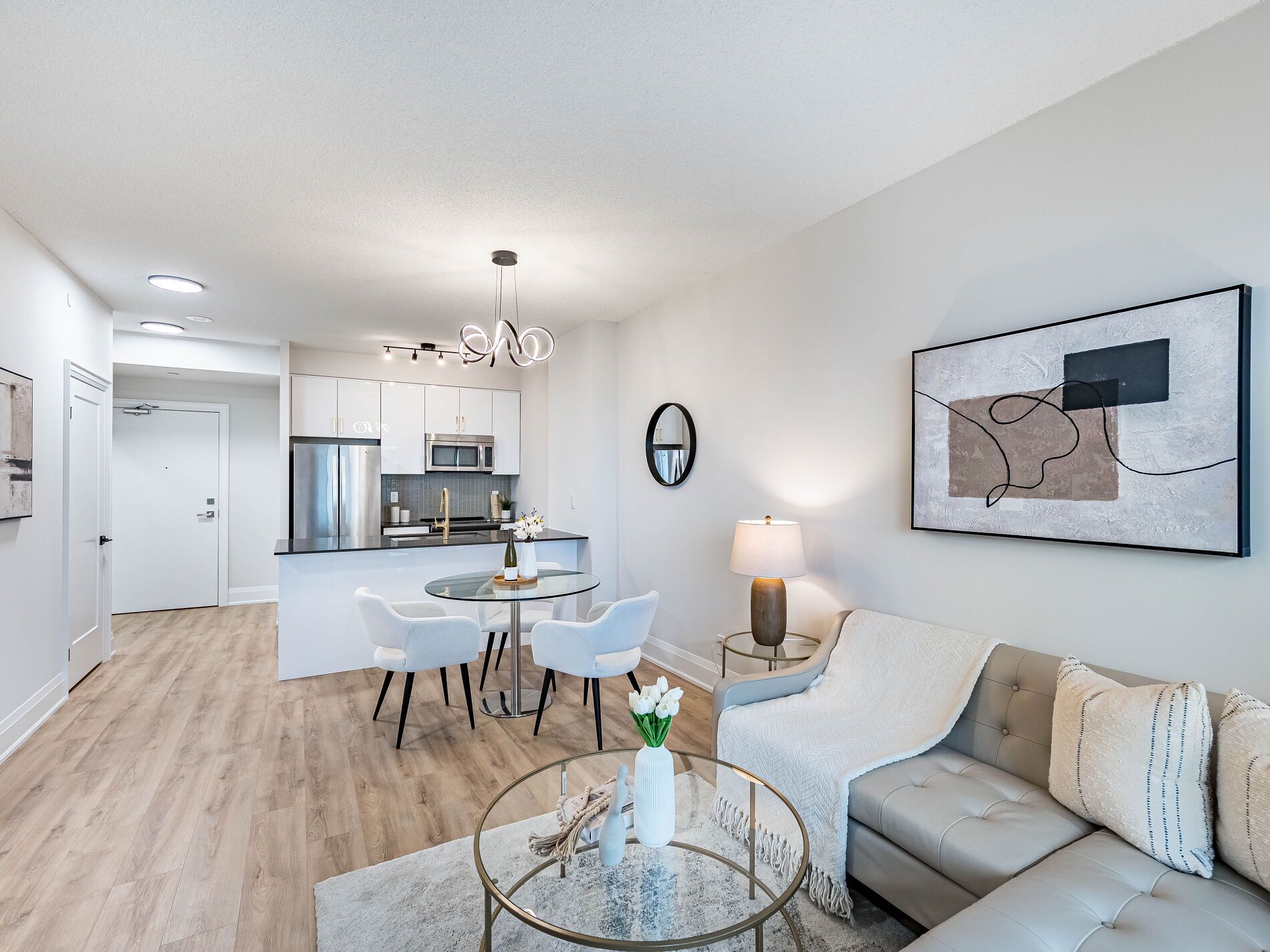 Elevated design! Prime location! Exceptional lifestyle! Experience refined city living in this exquisitely renovated 1-bedroom residence located in the prestigious brickstone community in the heart of mississauga's vibrant city centre. Thoughtfully redesigned with contemporary elegance, this suite offers a seamless blend of style, comfort, and functionality. The open-concept living and dining area is bathed in natural light, creating an inviting yet sophisticated ambiance ideal for both intimate evenings and stylish entertaining. The designer kitchen showcases sleek cabinetry, premium stainless steel appliances, modern countertops, and refined finishes that elevate everyday living. Retreat to the spacious primary bedroom, a serene sanctuary featuring generous closet space and large windows that enhance the bright, airy atmosphere. The beautifully updated bathroom reflects clean architectural lines and upscale detailing. This exceptional offering includes one premium parking space and one private locker, adding both convenience and value. Perfectly positioned just steps from square one, celebration square, fine dining, boutique shopping, sheridan college, and major transit routes, this address provides effortless access to highways 403, 401, and qew - ideal for professionals and discerning buyers seeking connectivity without compromise. Whether you are a first-time buyer, executive professional, or investor, this turnkey residence presents a rare opportunity to own a refined home in one of mississauga's most dynamic and sought-after locations. A true turnkey opportunity in the heart of it all - don't miss your chance to call this beautiful unit home!
