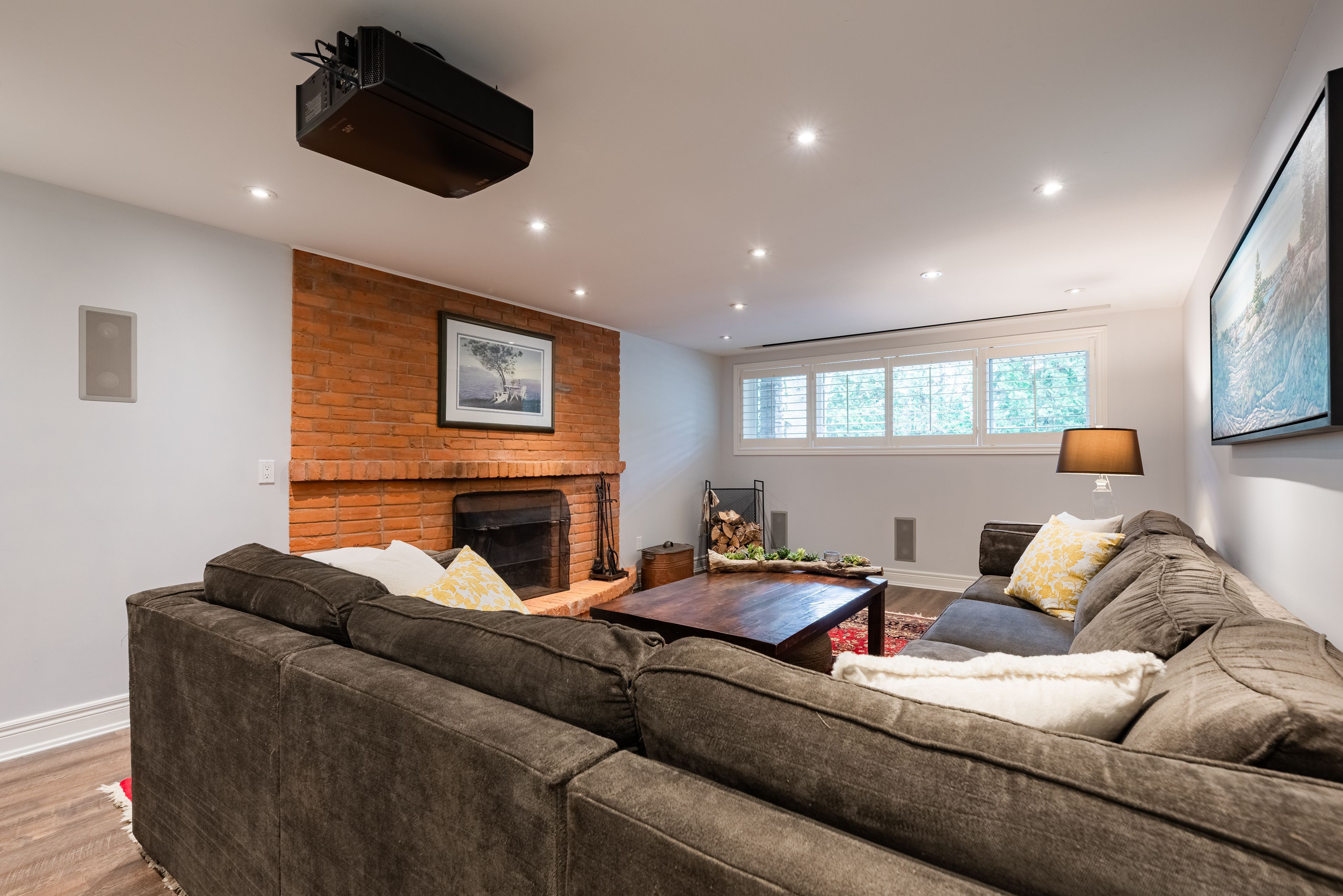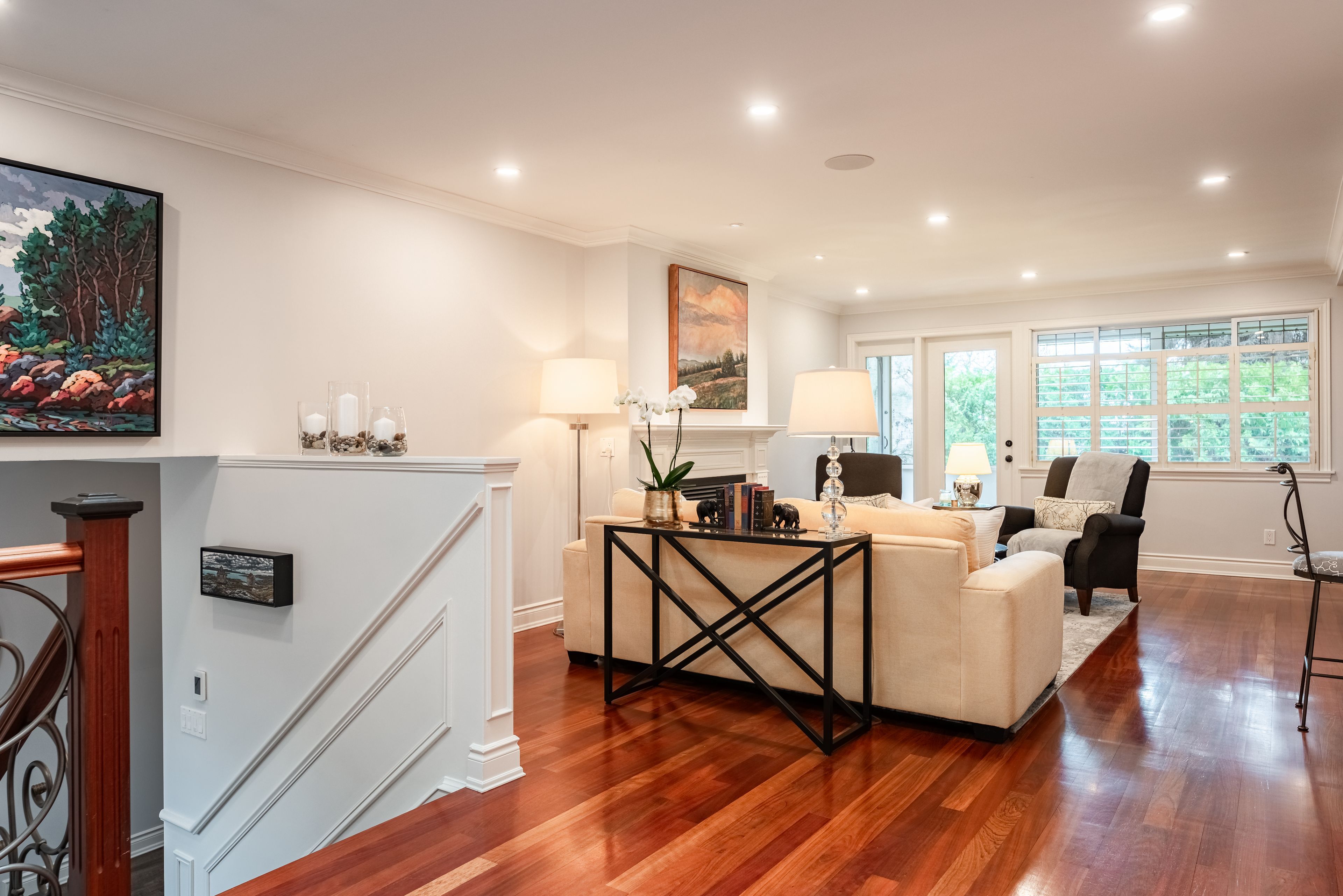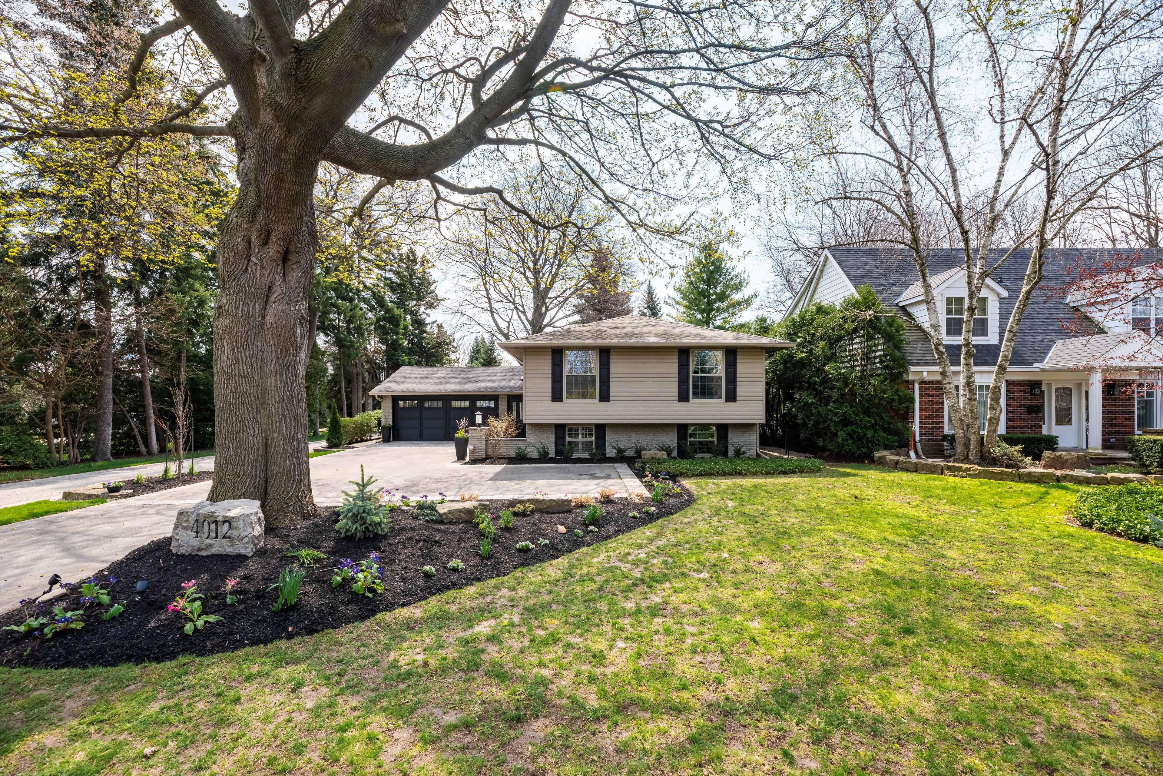 Welcome to 4012 lakeshore road, ideally situated in burlington's shoreacres neighbourhood. Moments from the shores of lake ontario, this updated raised bungalow is set among elegant homes, tree-lined streets, and the area's top-rated schools. Lovingly maintained and thoughtfully renovated, the home offers the convenience of main-floor living, complemented by a lower level that is equally refined and inviting. Expansive windows on both levels draw in natural light, highlighting rich hardwood floors and carefully selected finishes. The foyer makes an immediate impression, with a skylight above and striking custom iron banister. The living room is both comfortable and stylish, centred around a gas fireplace. The kitchen serves as the heart of the home, designed to balance function and style with breakfast bar, dining area, custom cabinetry, built-in wine storage, smart organizational features, and dual wall ovens. Four well-appointed bedrooms provide flexibility for families and guests. The primary suite is a true retreat, complete with private sitting area, built-in bookshelves, custom bureau, and generous storage. Its spa-inspired ensuite features a custom vanity, heated towel rack, and walk-in closet. The lower level is enhanced by radiant in-floor heating, creating a cozy atmosphere throughout. A spacious family room with wood-burning fireplace offers the perfect place to unwind, while a fully integrated theatre system-with projector, surround sound, and ceiling-mounted screen-delivers an immersive viewing experience. A sleek wet bar with custom cabinetry and bar fridge completes the space. Outdoors, a screened porch overlooks the landscaped backyard, where a custom bench provides a quiet place to relax. Lush gardens, irrigation, landscape lighting, and newly finished driveway and walkway further enhance the property's appeal. With craftsmanship and thoughtful design, this shoreacres home presents a refined lifestyle in one of burlington's lakeside communities.