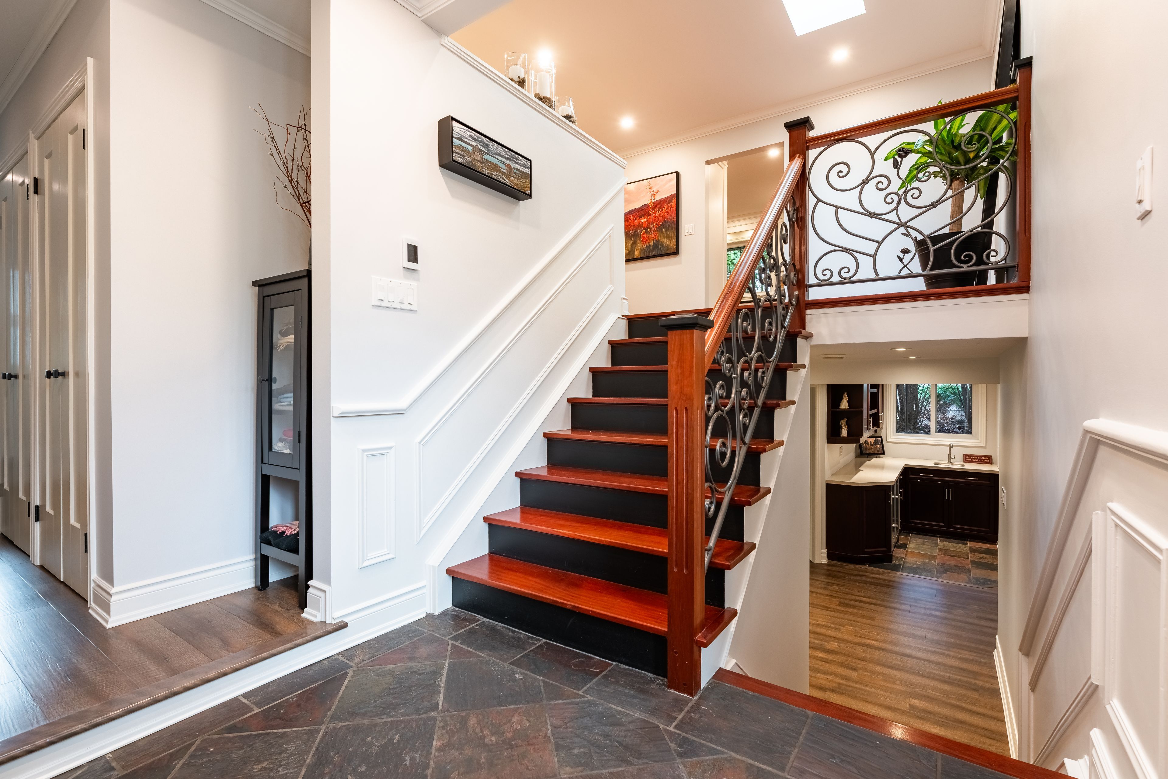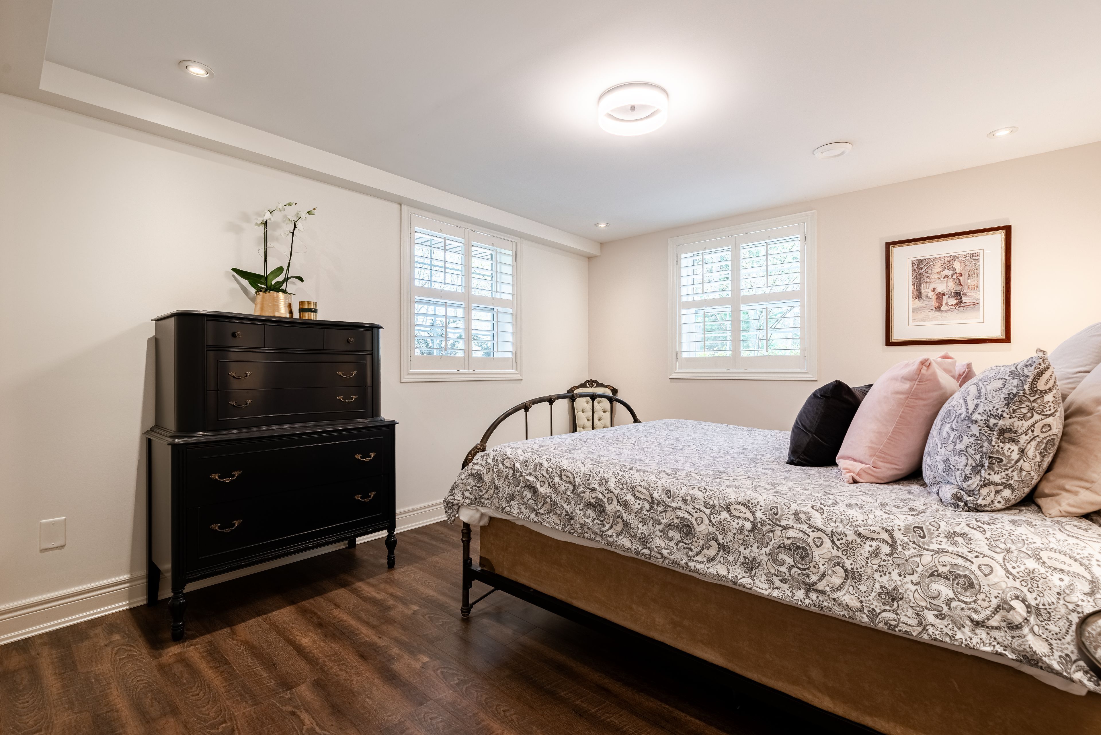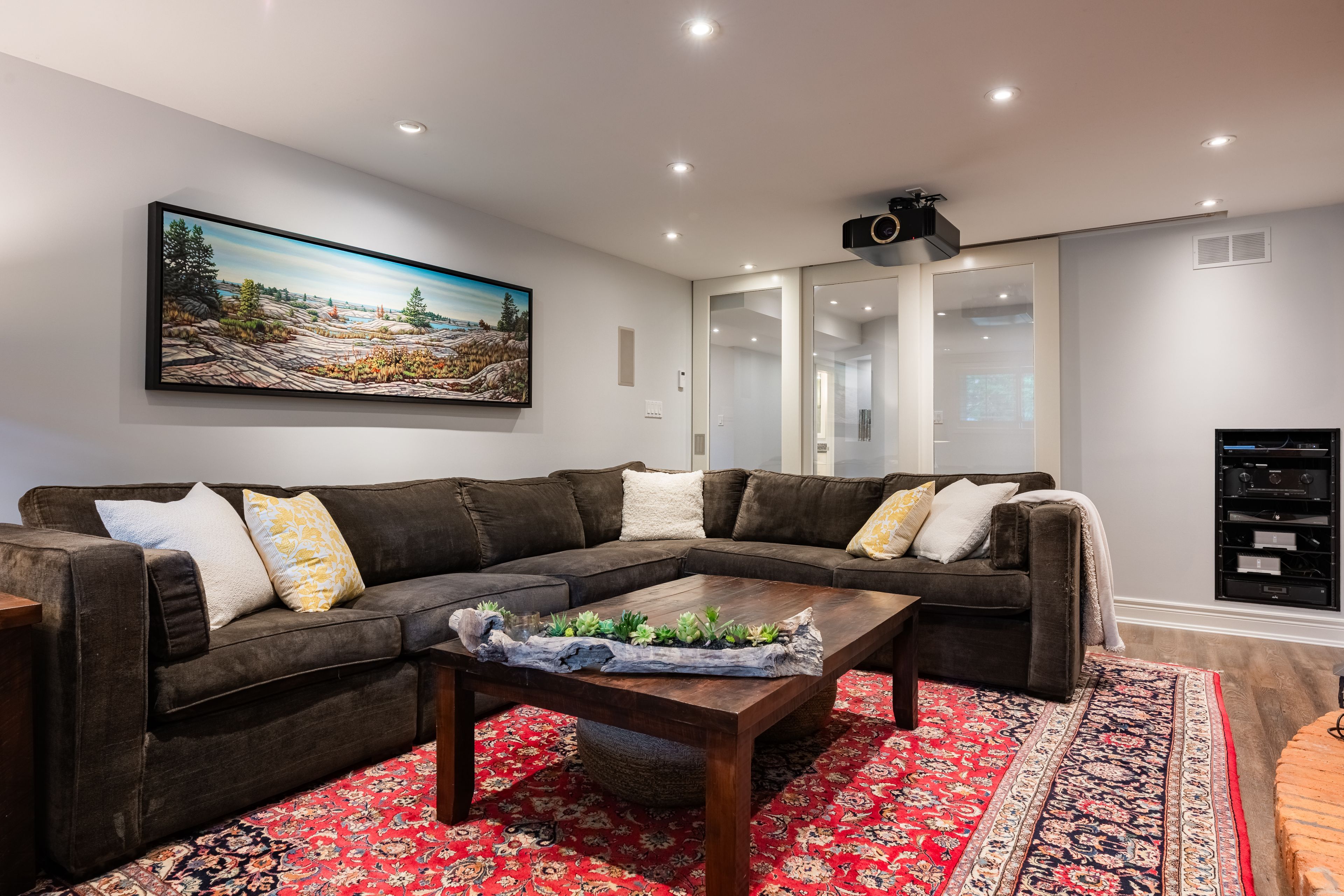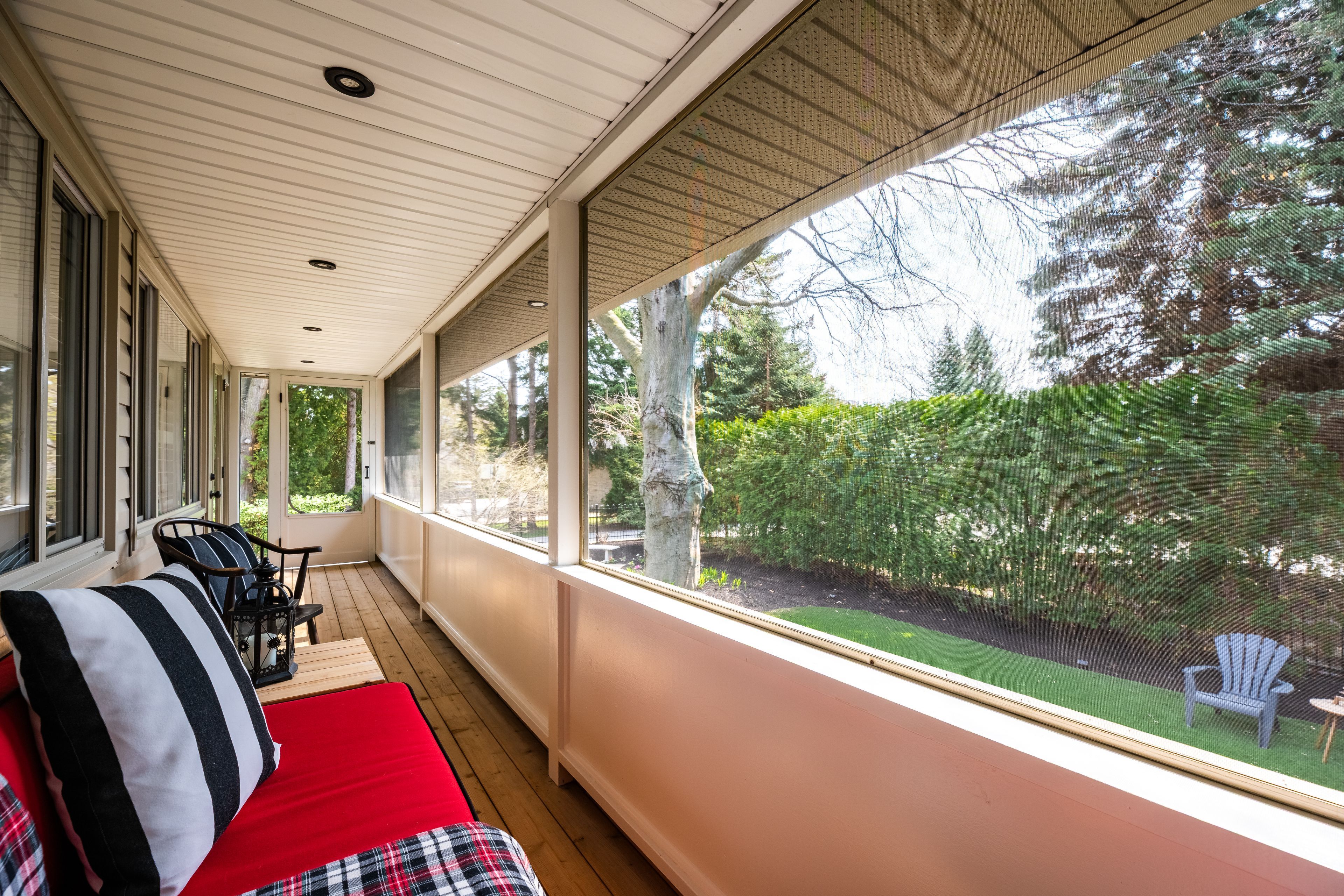 Welcome to 4012 lakeshore road, ideally situated in burlington's shoreacres neighbourhood. Moments from the shores of lake ontario, this updated raised bungalow is set among elegant homes, tree-lined streets, and the area's top-rated schools. Lovingly maintained and thoughtfully renovated, the home offers the convenience of main-floor living, complemented by a lower level that is equally refined and inviting. Expansive windows on both levels draw in natural light, highlighting rich hardwood floors and carefully selected finishes. The foyer makes an immediate impression, with a skylight above and striking custom iron banister. The living room is both comfortable and stylish, centred around a gas fireplace. The kitchen serves as the heart of the home, designed to balance function and style with breakfast bar, dining area, custom cabinetry, built-in wine storage, smart organizational features, and dual wall ovens. Four well-appointed bedrooms provide flexibility for families and guests. The primary suite is a true retreat, complete with private sitting area, built-in bookshelves, custom bureau, and generous storage. Its spa-inspired ensuite features a custom vanity, heated towel rack, and walk-in closet. The lower level is enhanced by radiant in-floor heating, creating a cozy atmosphere throughout. A spacious family room with wood-burning fireplace offers the perfect place to unwind, while a fully integrated theatre system-with projector, surround sound, and ceiling-mounted screen-delivers an immersive viewing experience. A sleek wet bar with custom cabinetry and bar fridge completes the space. Outdoors, a screened porch overlooks the landscaped backyard, where a custom bench provides a quiet place to relax. Lush gardens, irrigation, landscape lighting, and newly finished driveway and walkway further enhance the property's appeal. With craftsmanship and thoughtful design, this shoreacres home presents a refined lifestyle in one of burlington's lakeside communities.
