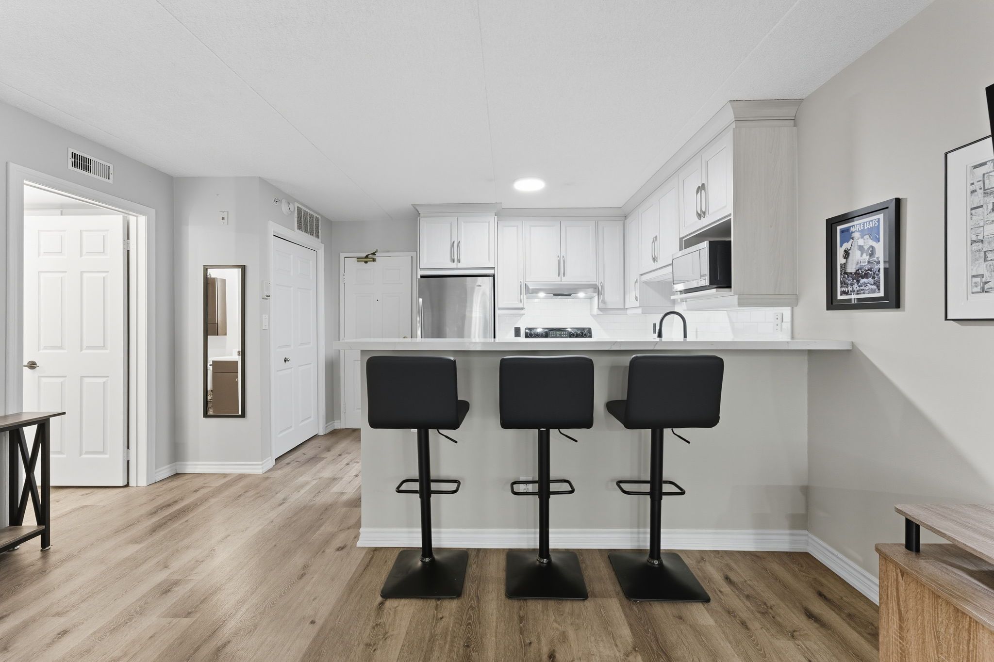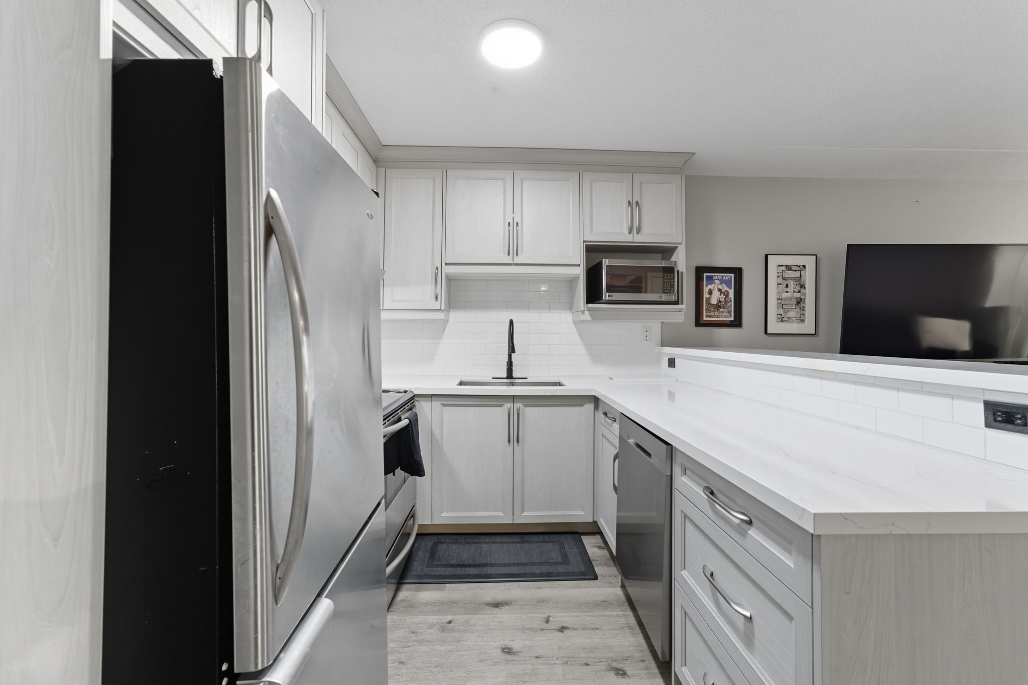 Welcome to your new home! This bright and spacious 1 bedroom + den condo is perfect for first-time buyers, downsizers, or savvy investors. The updated kitchen boasts quartz countertops, a timeless backsplash, and beautiful cabinetry, creating the perfect space to cook and entertain. Enjoy open-concept design, carpet-free flooring, and the convenience of in-suite laundry. Ample guest parking makes it easy to welcome family and friends. A stylish condo ready for you to move in and enjoy!