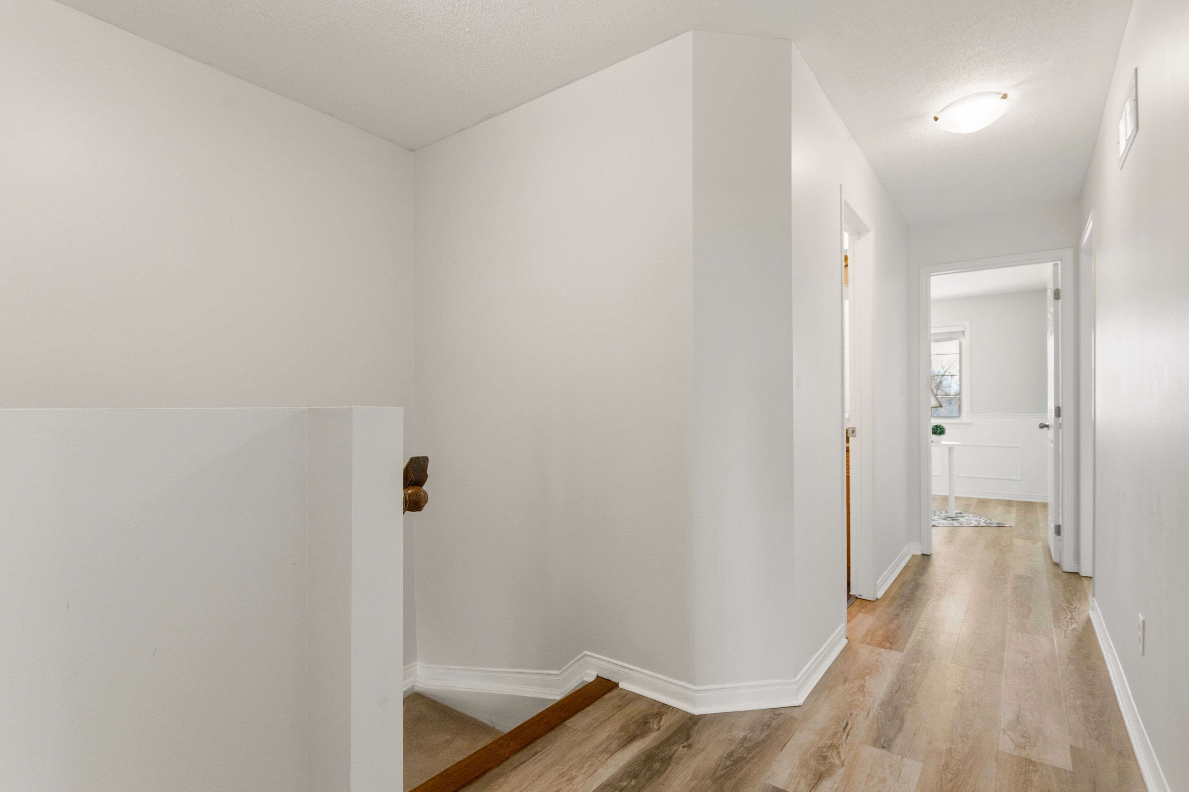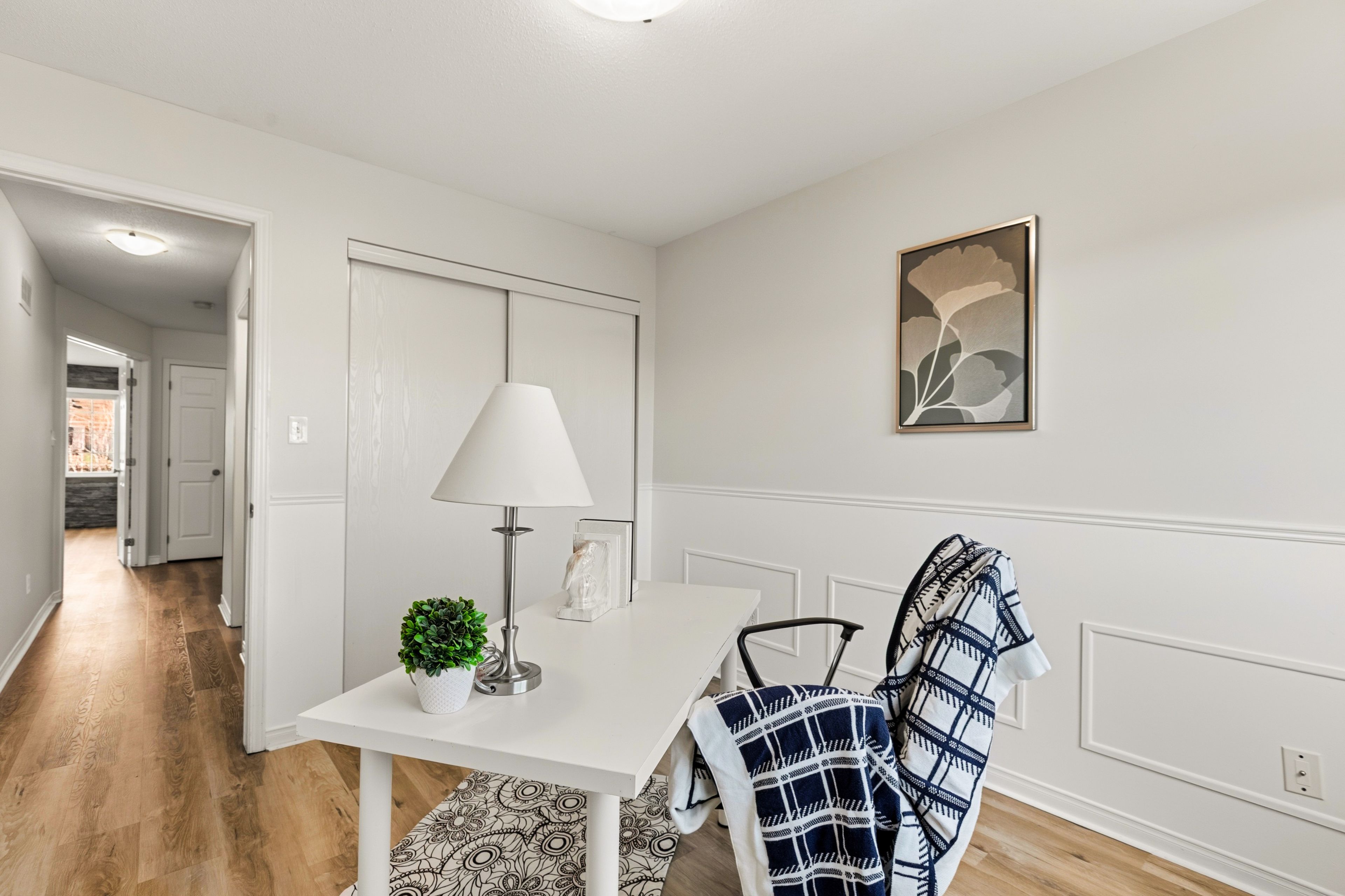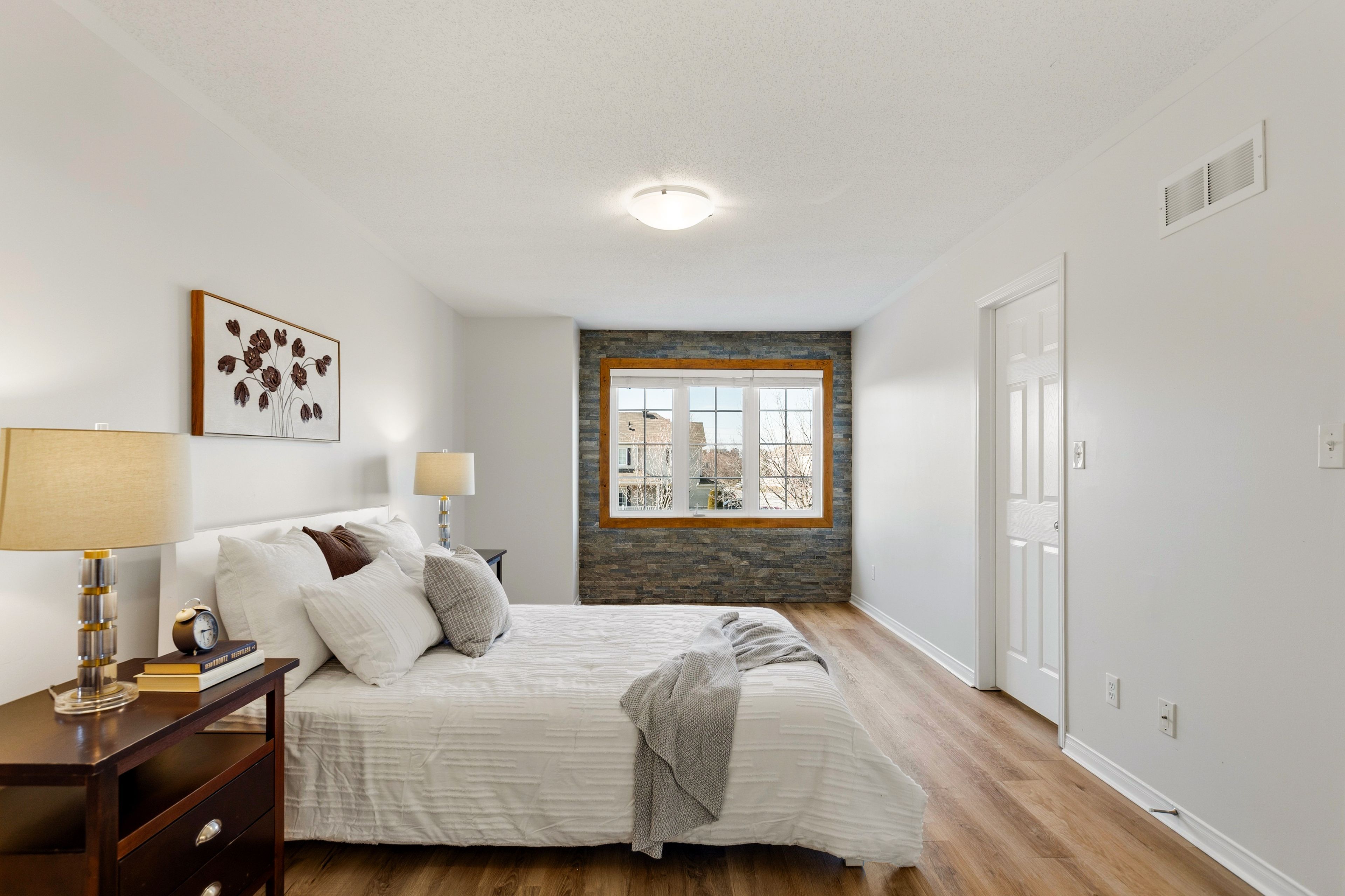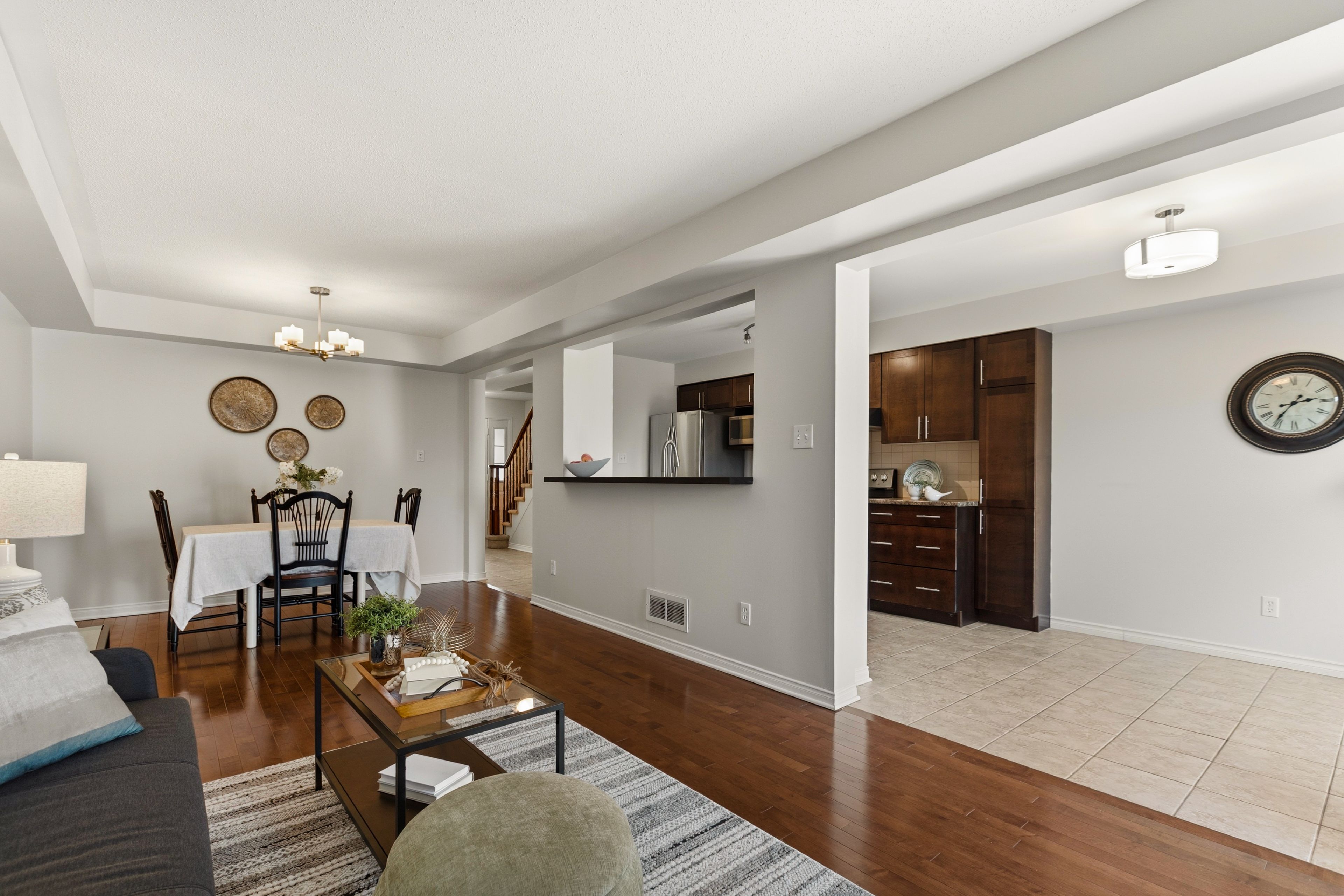 Well-maintained 3-bed + den, four-bath, townhome with three parking spaces in the desirable stonebridge community. Spacious foyer leads to open-concept living/dining area with hardwood floors, gas fireplace, and large windows. Kitchen features stainless steel appliances, a pass-through, and an eating area with access to a fully fenced backyard with a deck. Second level offers primary bedroom with walk-in closet and 4-pc ensuite with double shower and shelving, plus two additional bedrooms and full bath. Vinyl flooring throughout the second level and the basement. Finished basement (2024) includes rec room, full bath, and laundry. Furnace and a/c (2022). Great location: short walk to minto recreation centre and st. Cecilia school. Close to trails, golf course, and shopping.