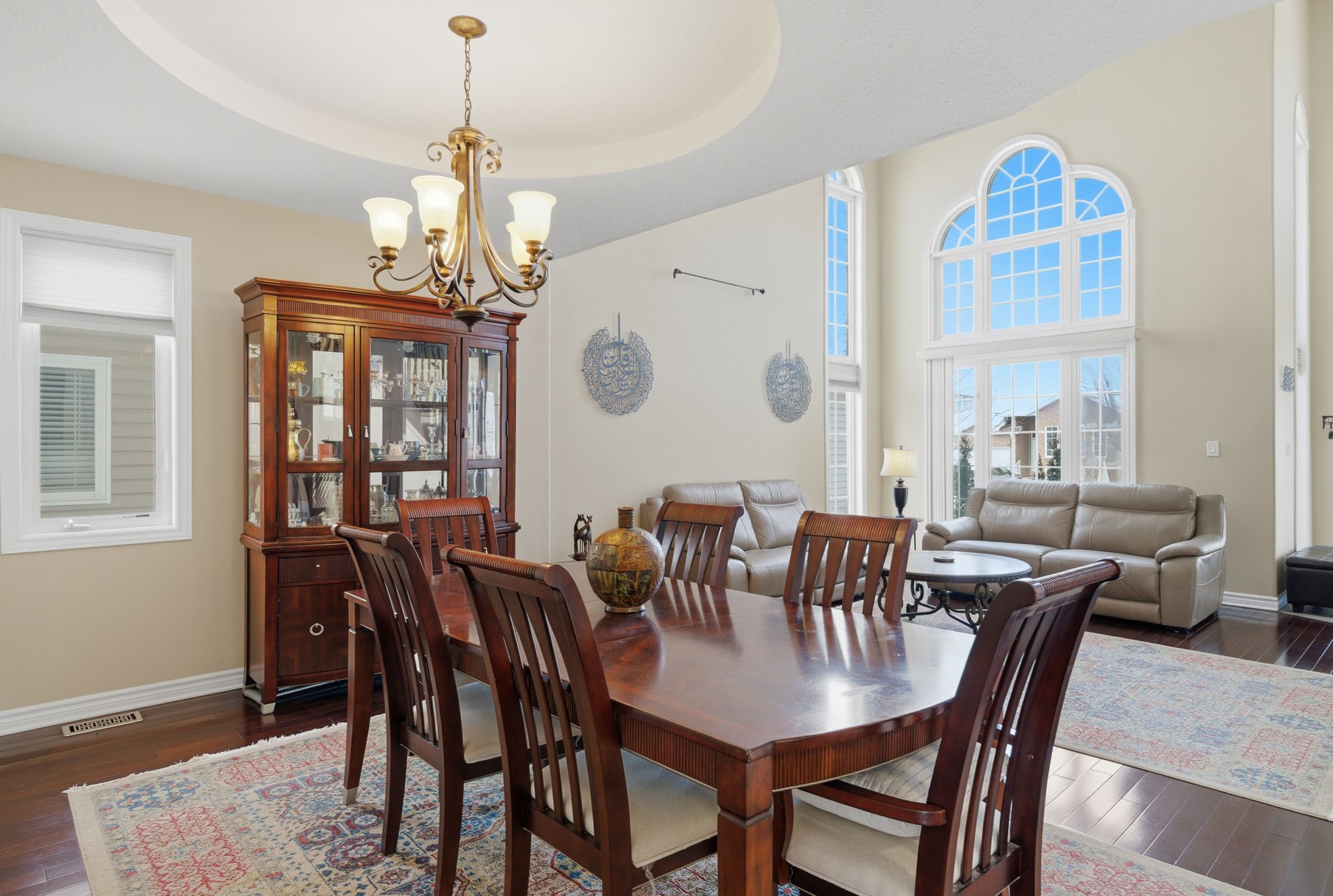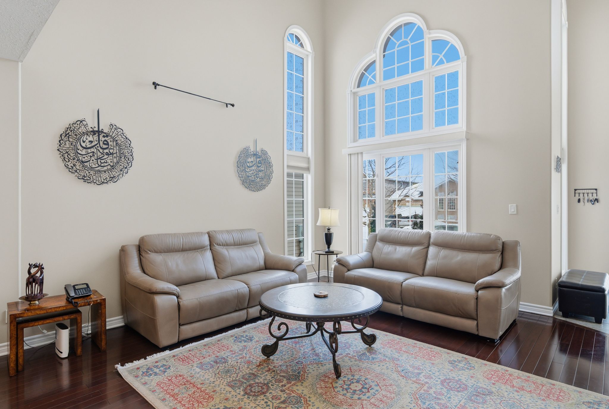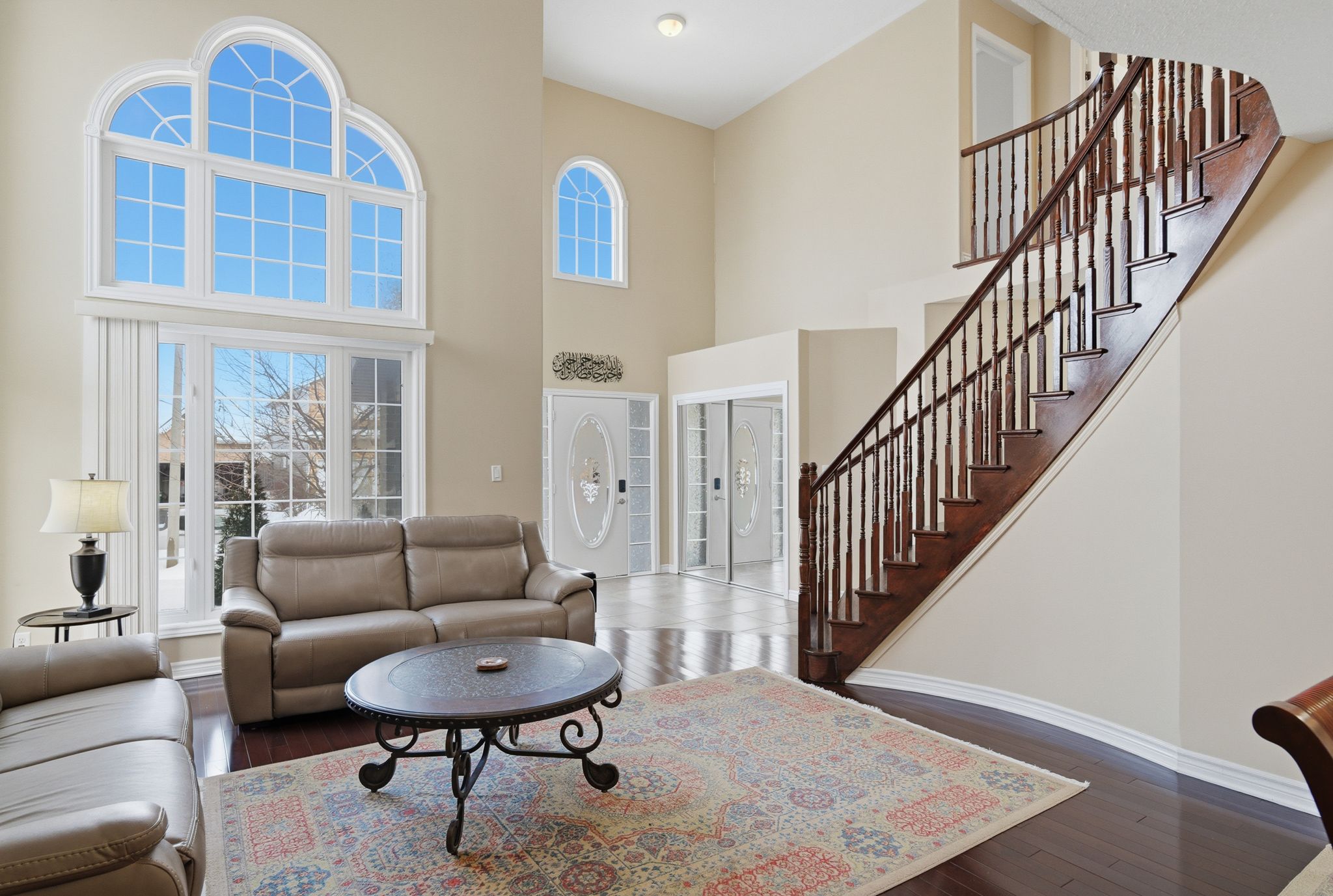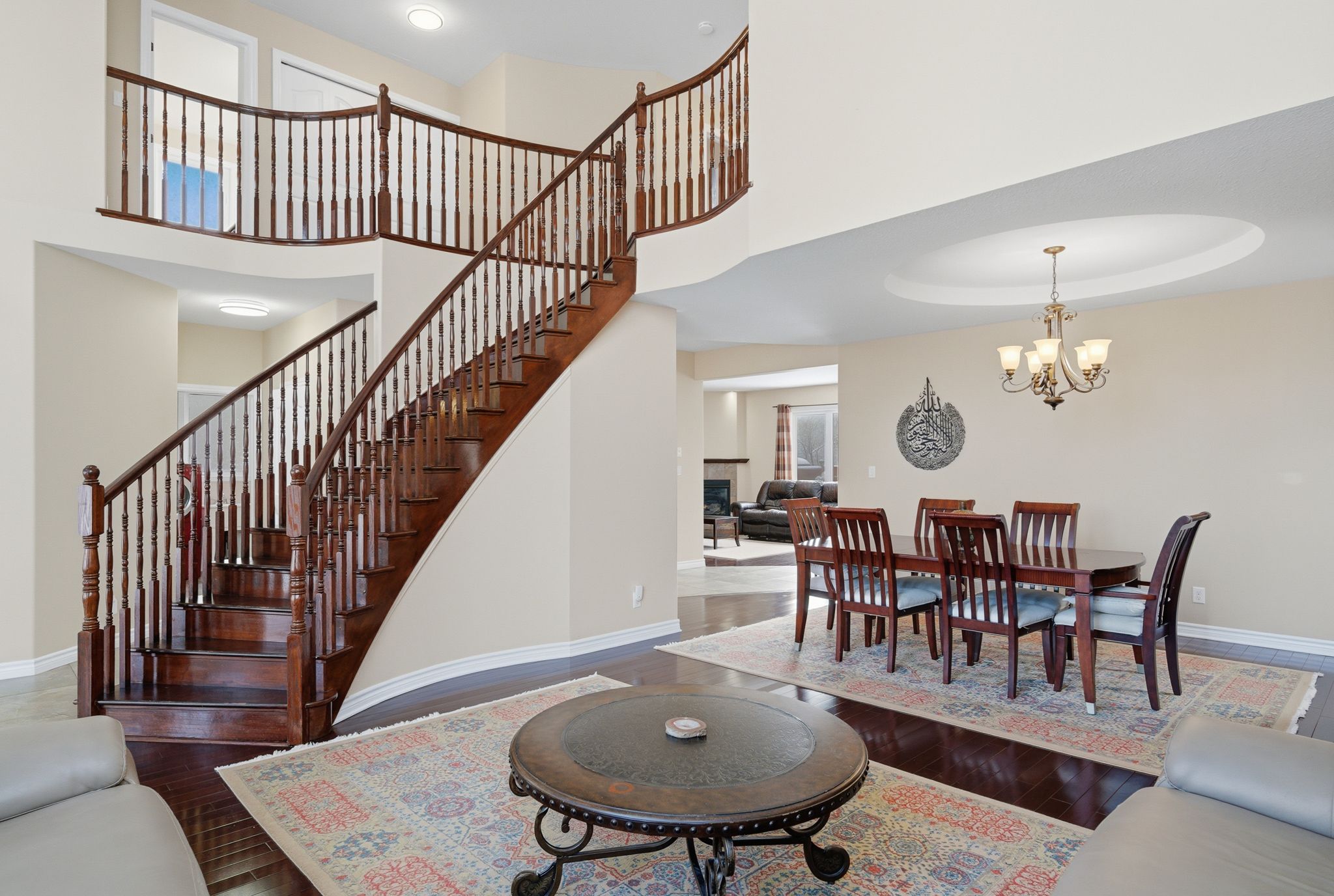 • Stunning two-storey foyer with a dramatic curved staircase and natural light.
