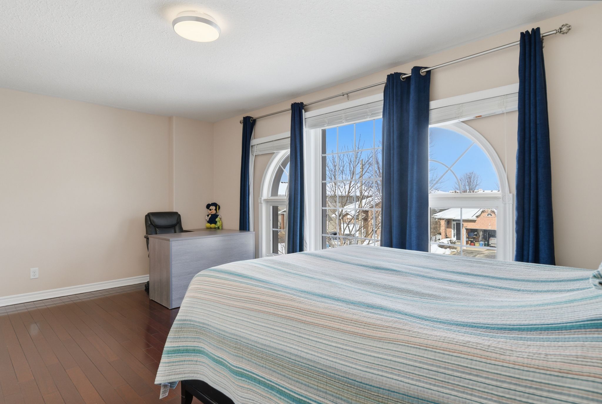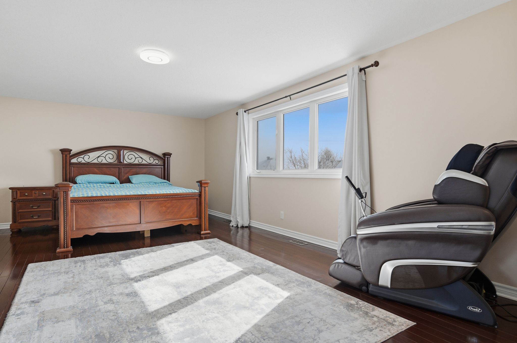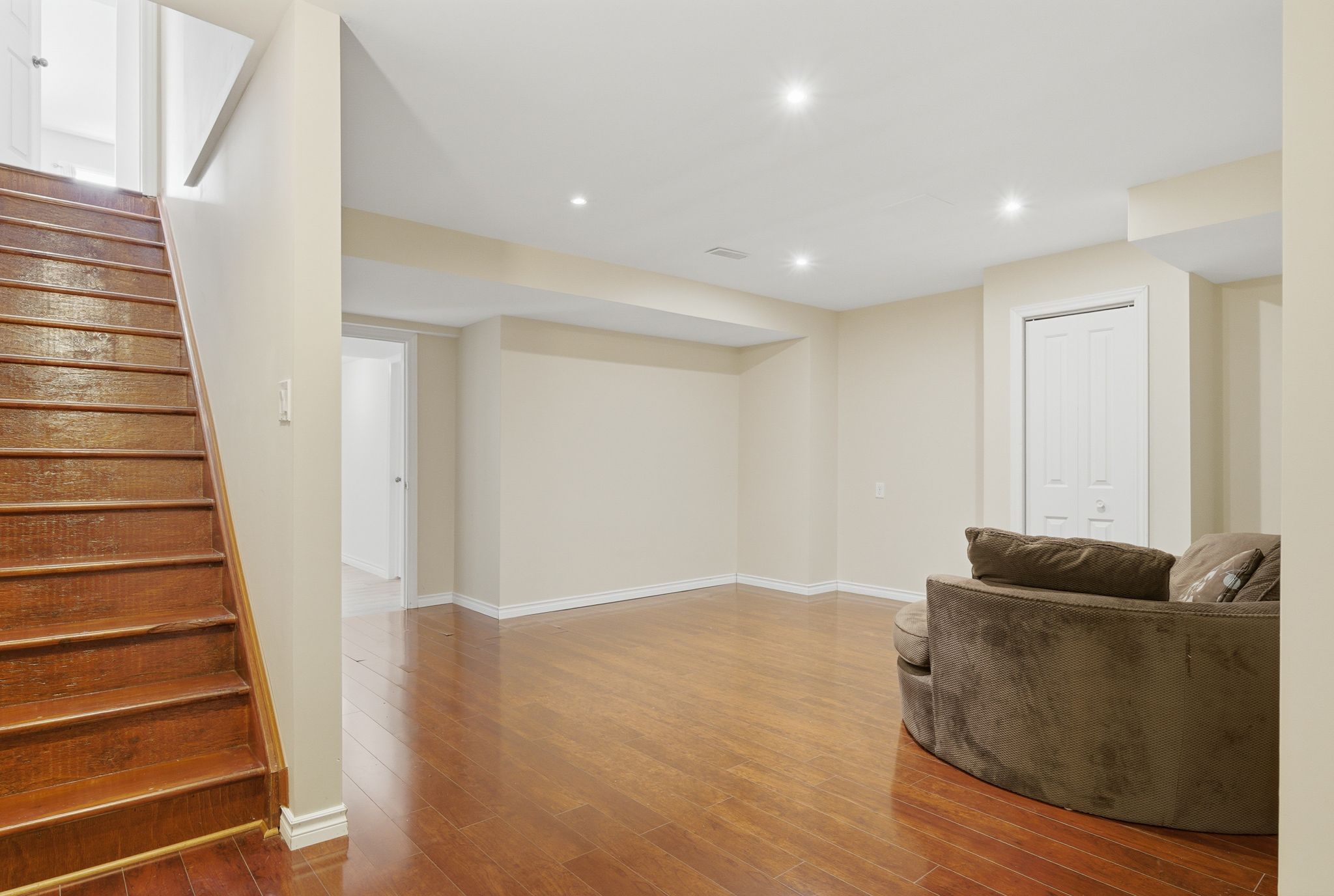 • Stunning two-storey foyer with a dramatic curved staircase and natural light.