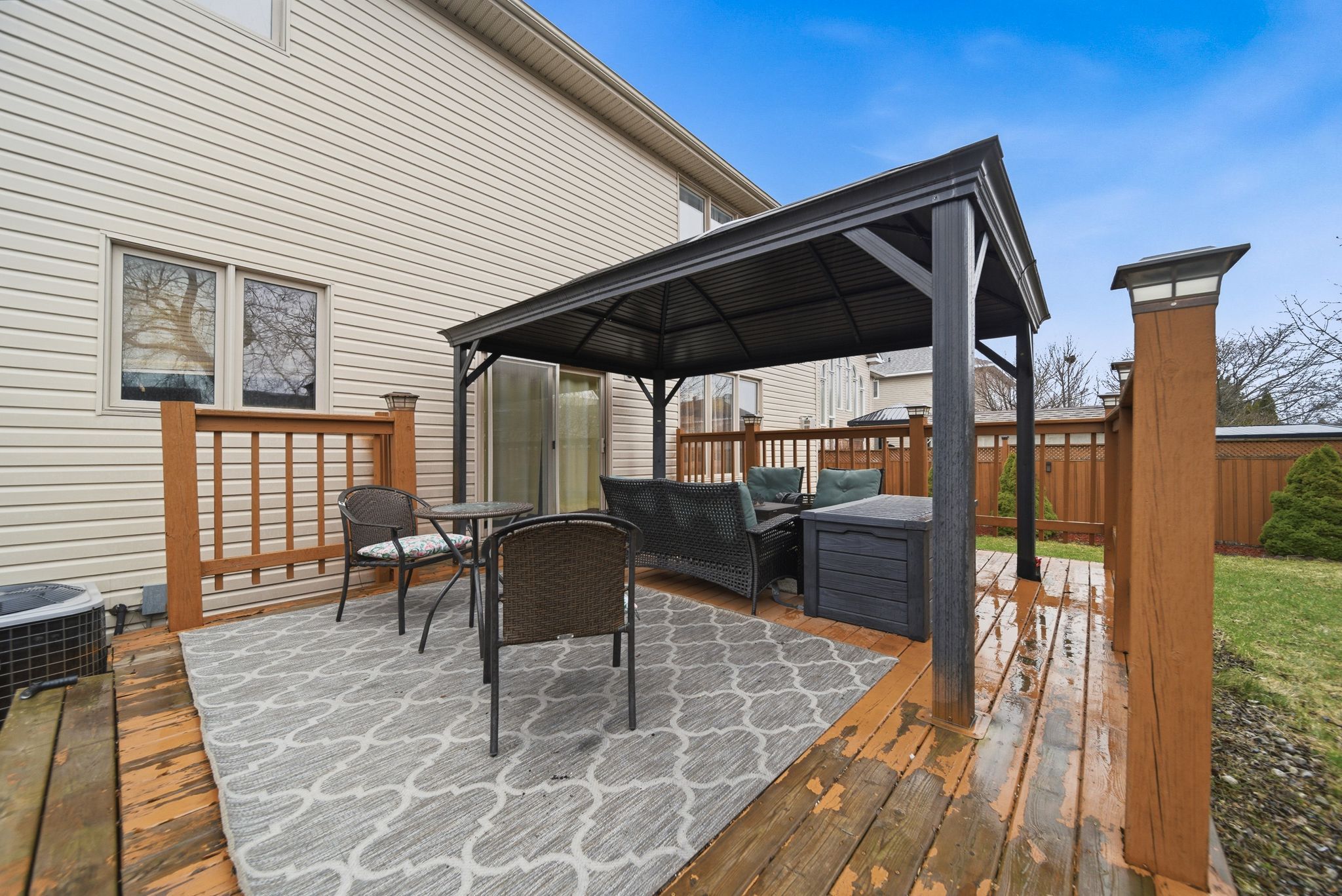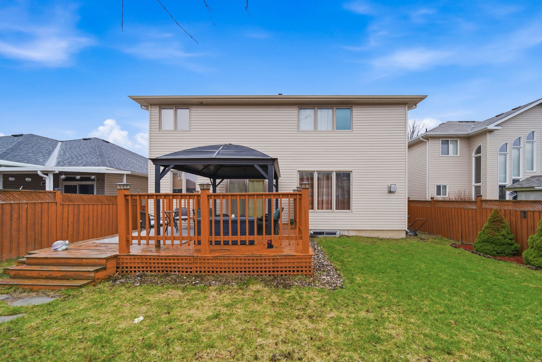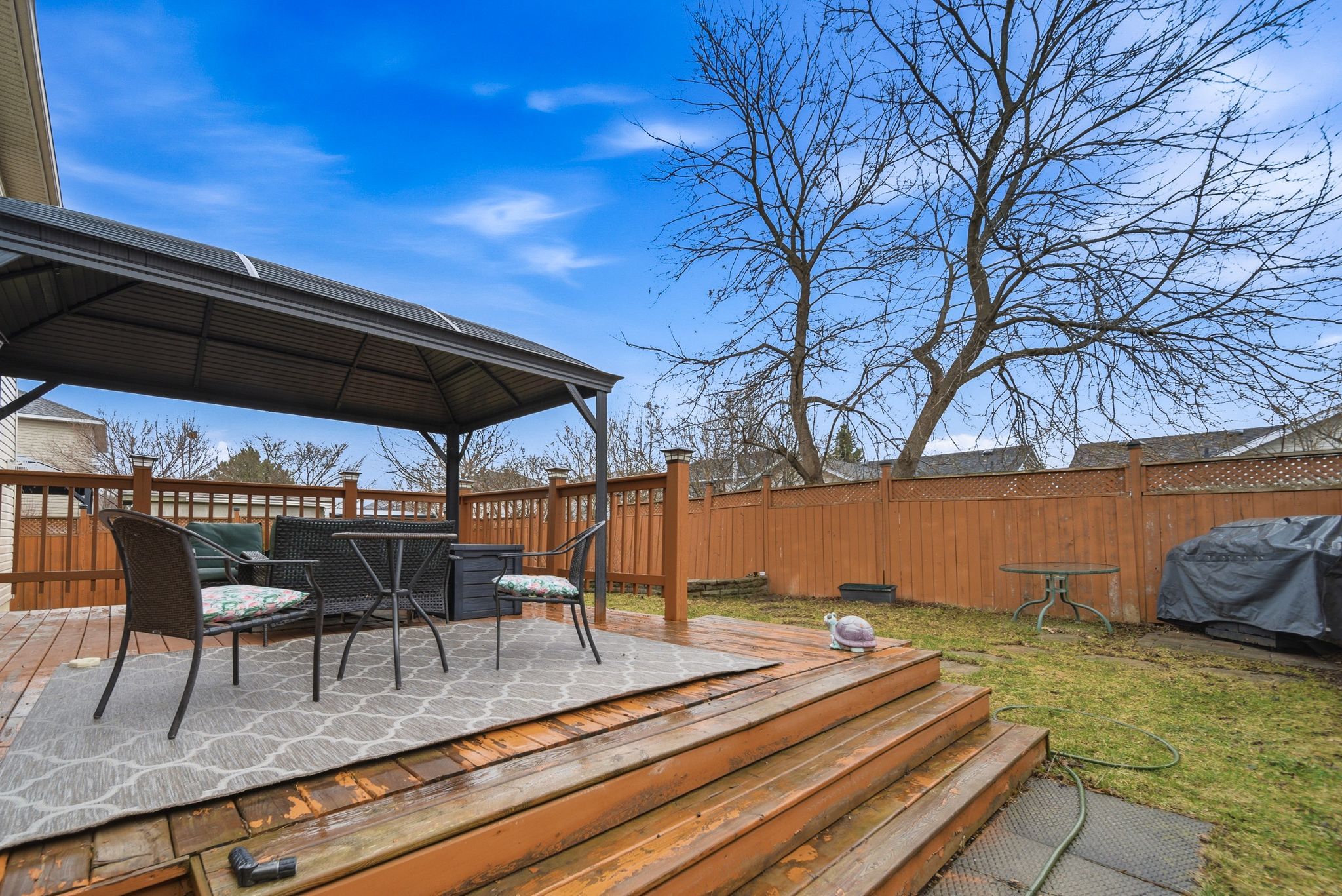 • Fully fenced backyard with a deck and gazebo for relaxation and entertainment.