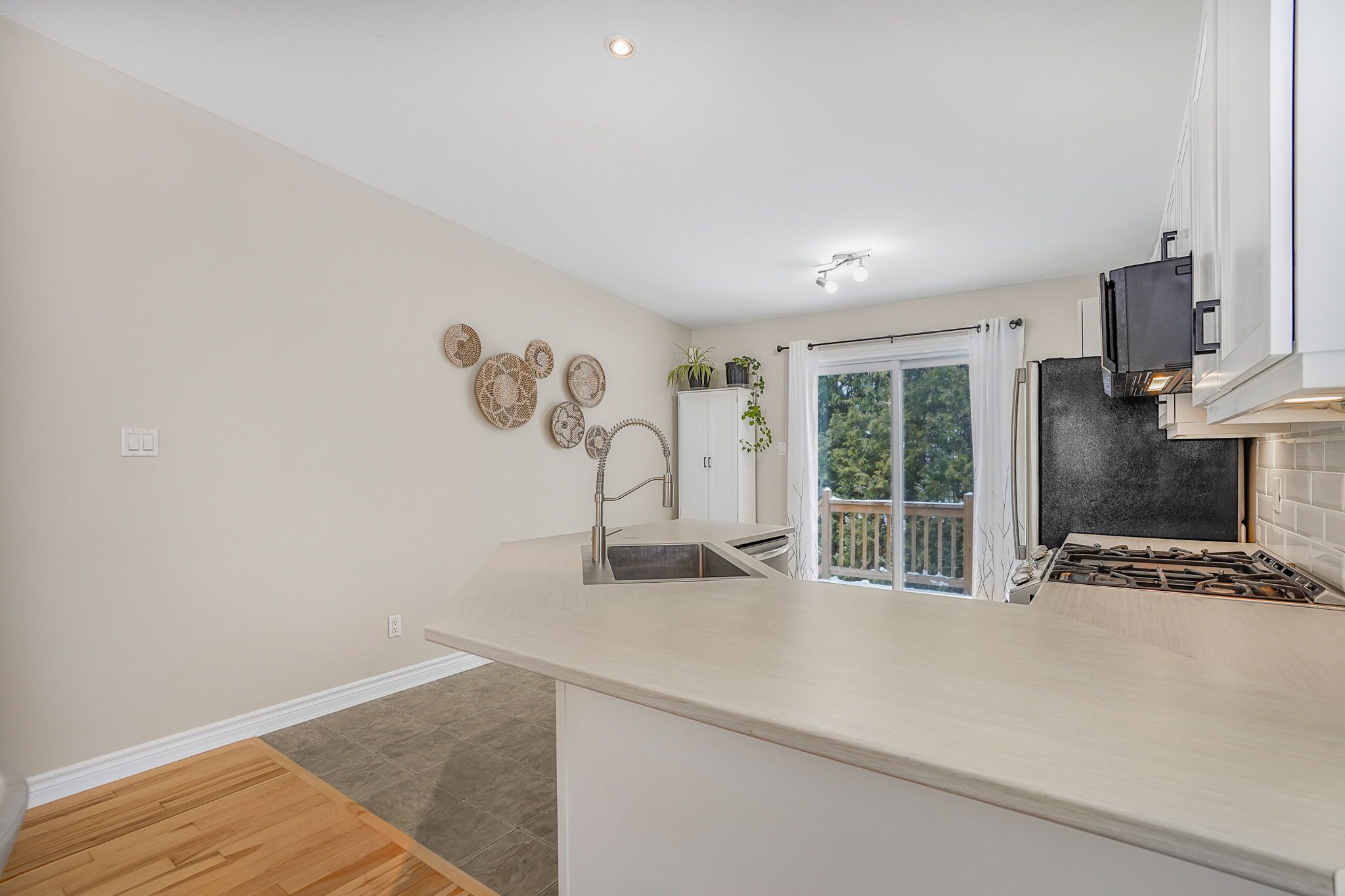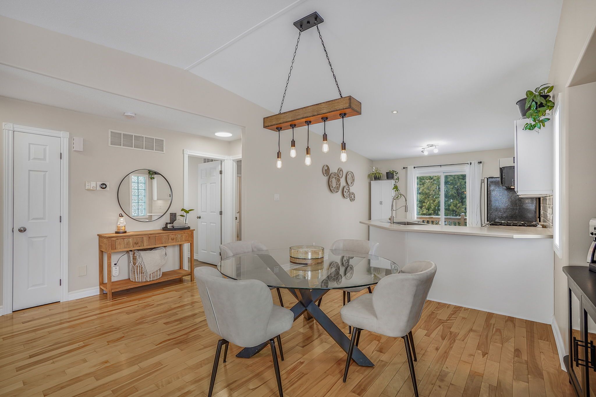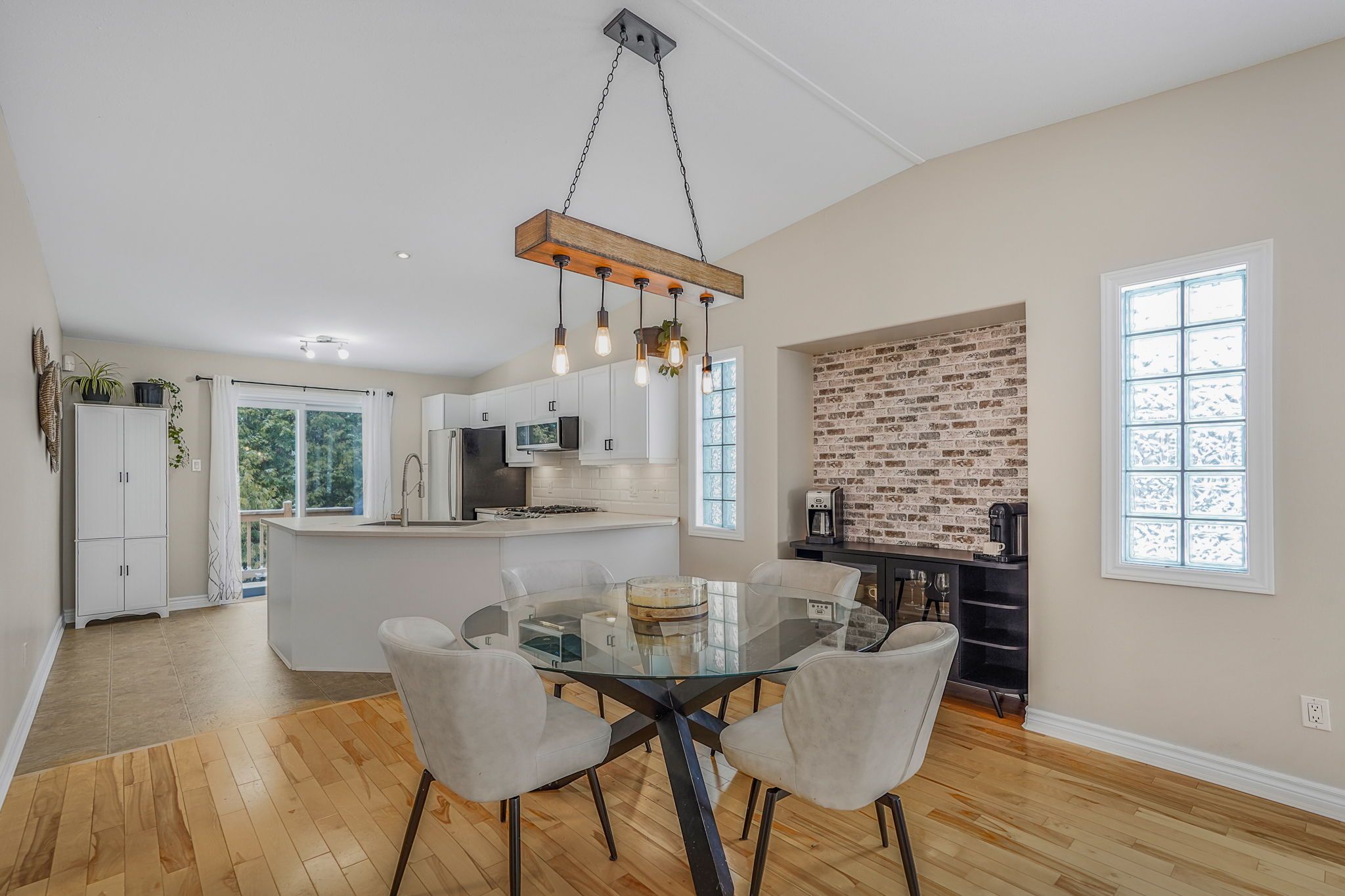 • Sunny dining area and kitchen with ample storage and counter space.