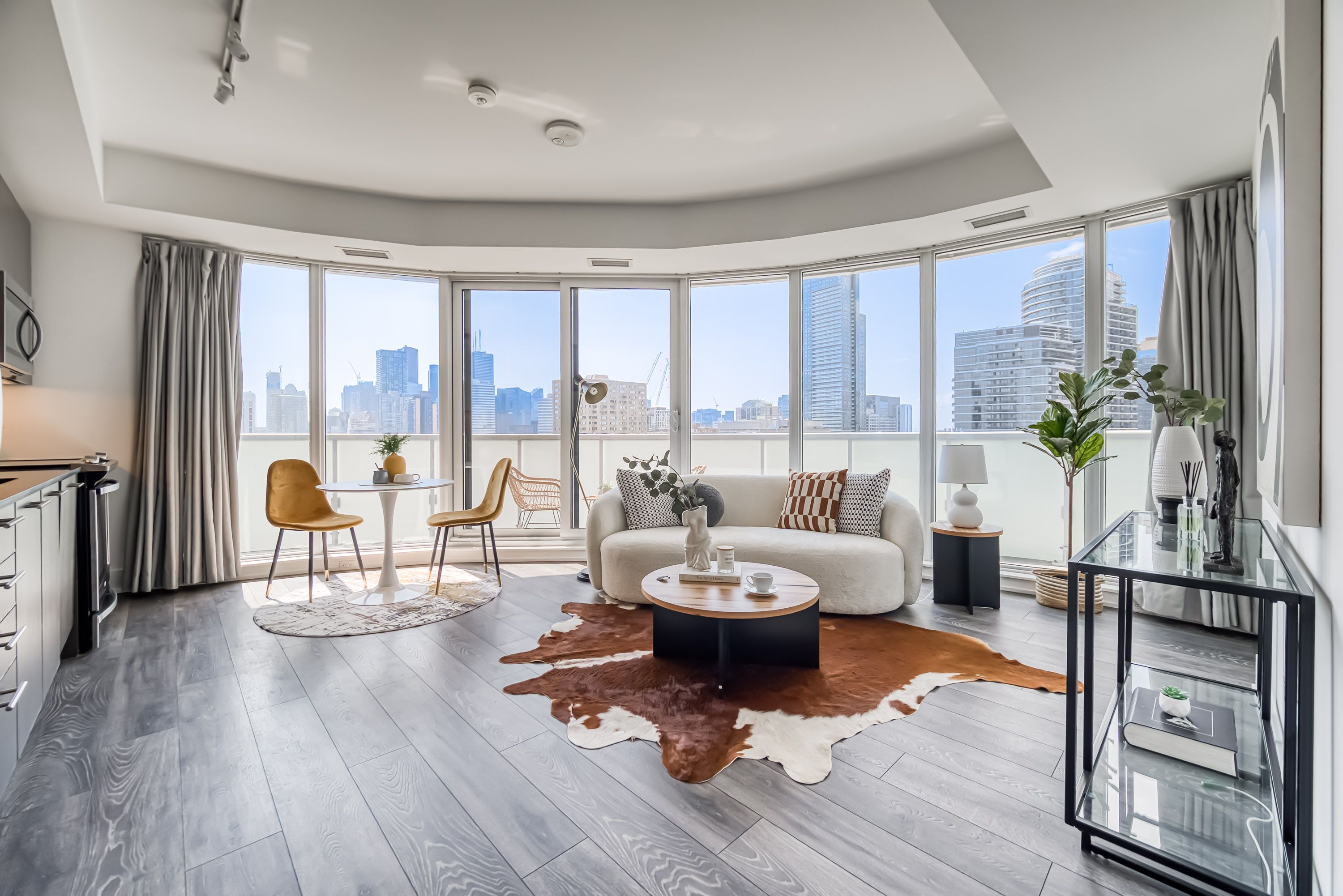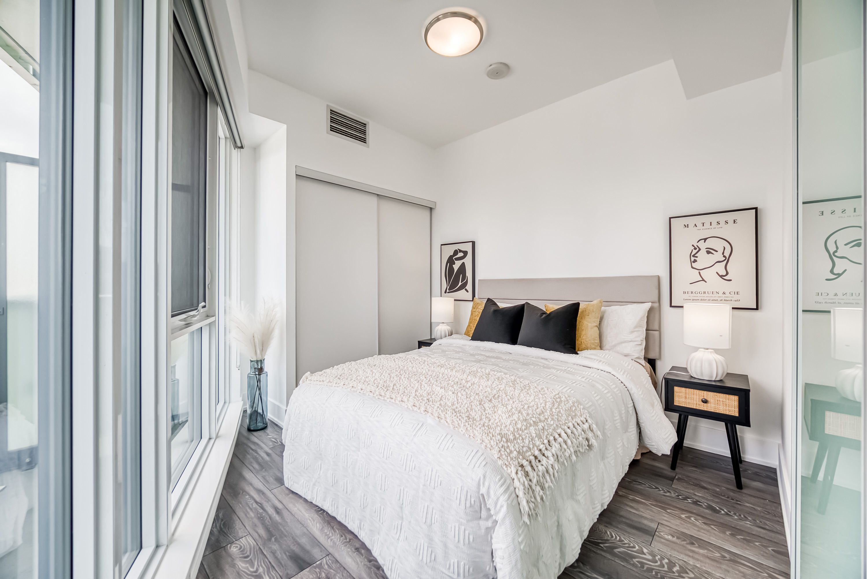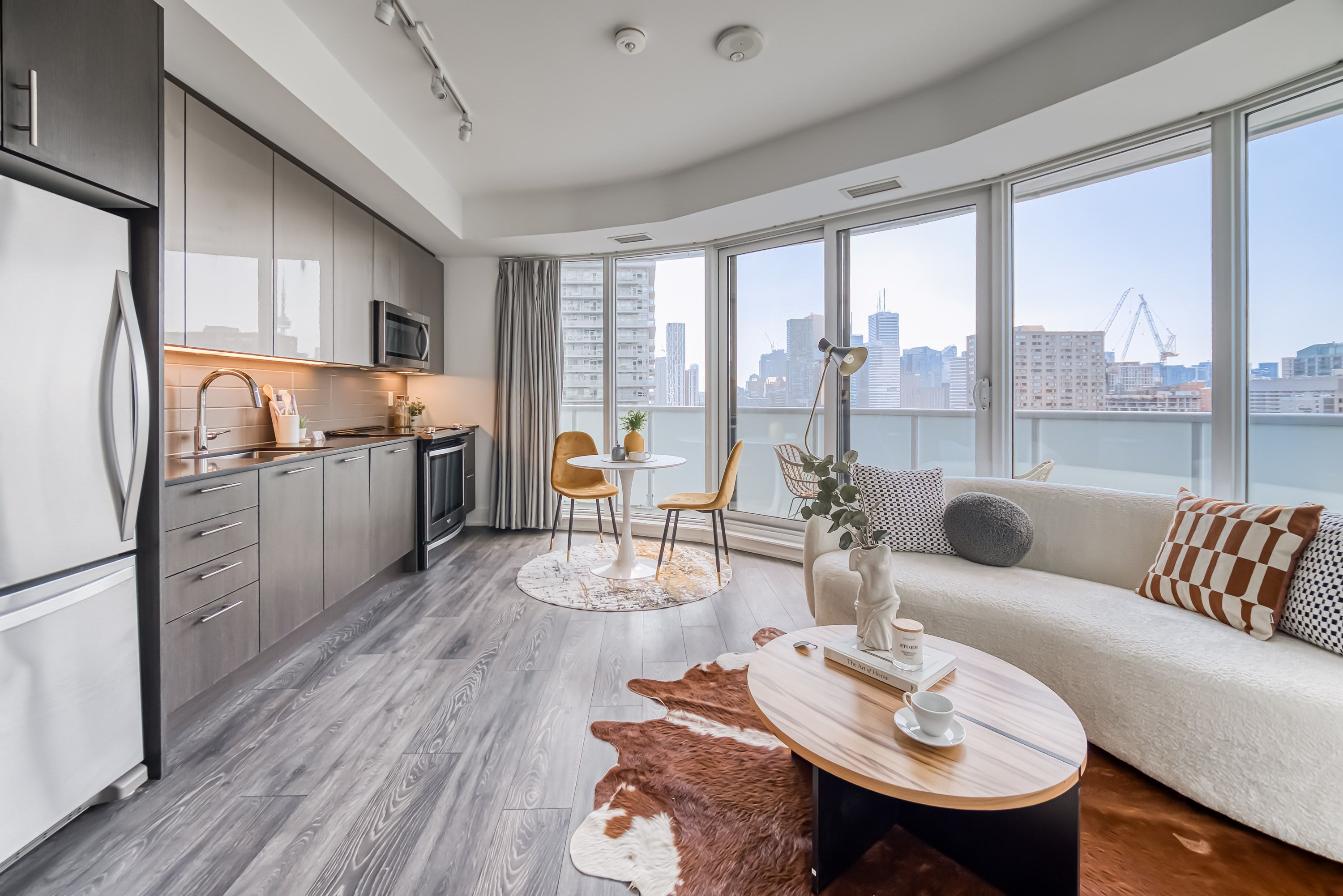 Welcome to stanley condo! This freshly painted 2-bed, 2-bath corner suite offers 867 sq ft of bright, functional living space plus a wraparound balcony with stunning sw views of the cn tower & lake ontario. Floor-to-ceiling windows fill the home with natural light all day. The open-concept layout features split bedrooms for added privacy. The primary bedroom includes an ensuite and direct balcony access. The modern kitchen comes with stainless steel appliances. 1 parking + 1 locker included. Located in the heart of downtown toronto, just steps to loblaws, university of toronto, toronto metropolitan university, cf toronto eaton centre, yonge-dundas square, the financial district, & subway transit - a wonderful opportunity to own a piece of this vibrant community!