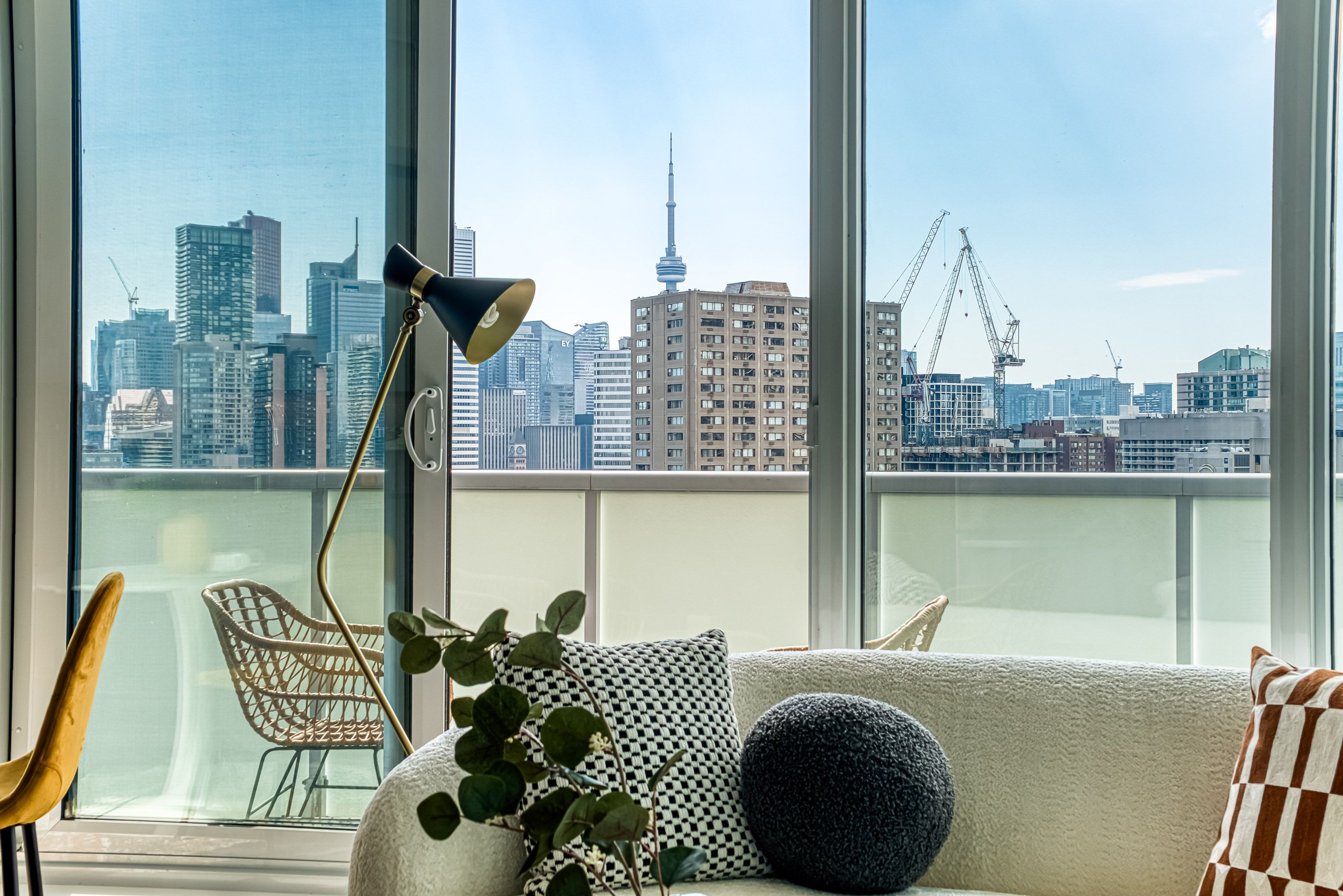 • Wraparound balcony with great views of the CN Tower and Lake Ontario.