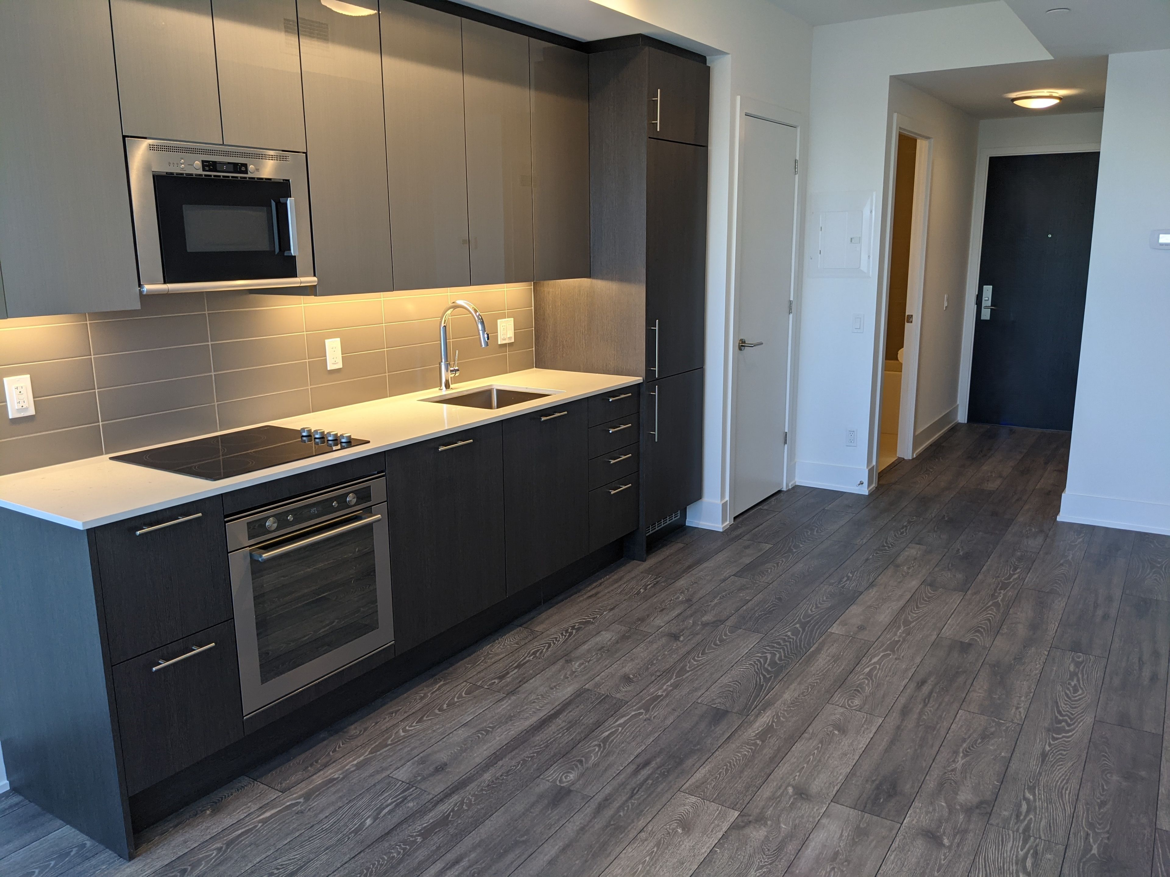 • Modern galley kitchen equipped with stainless steel appliances and washer/dryer.