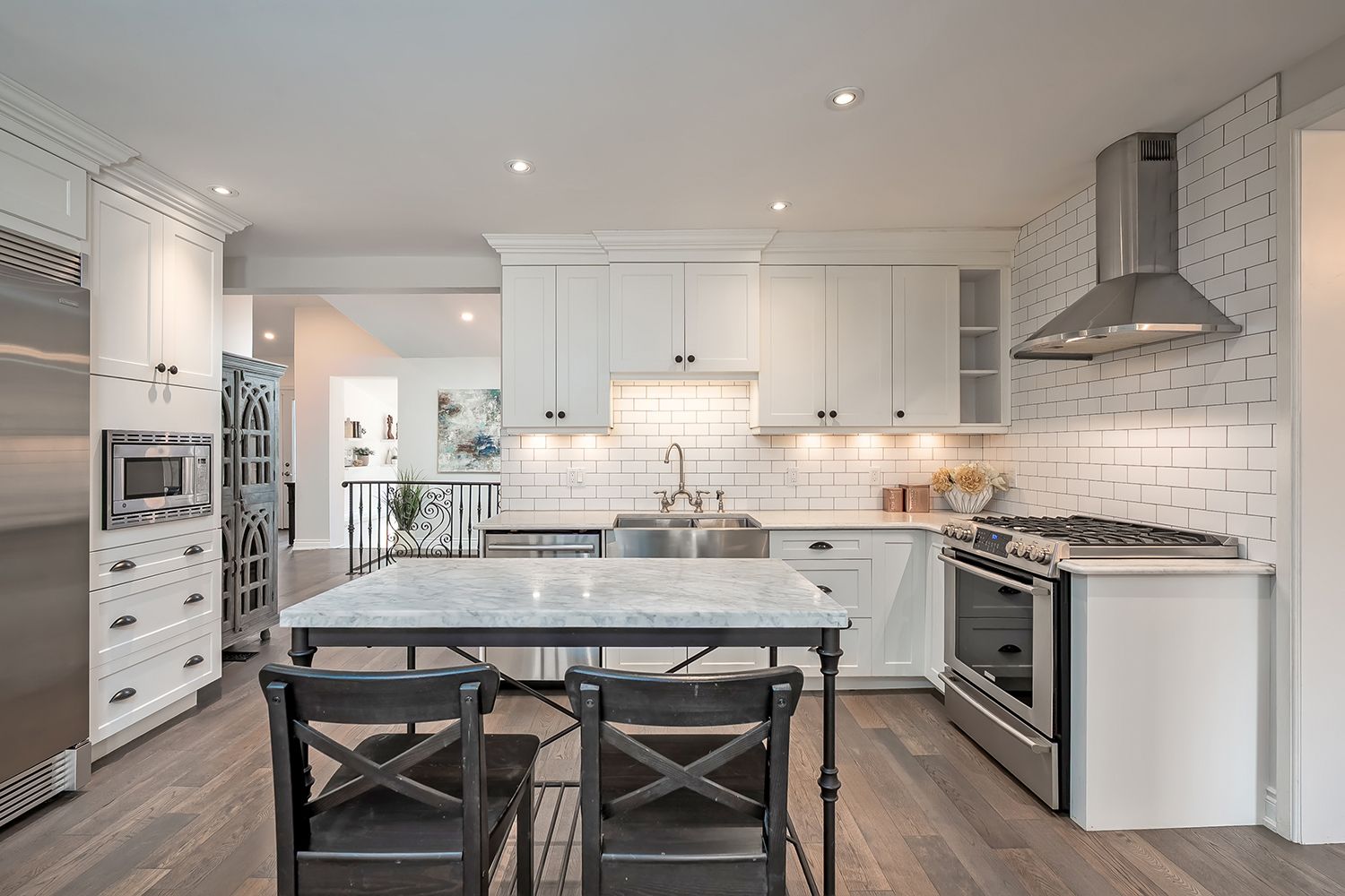 • Open concept kitchen features stainless steel appliances and marble counters.