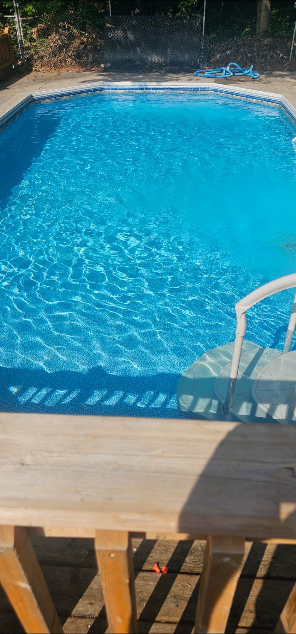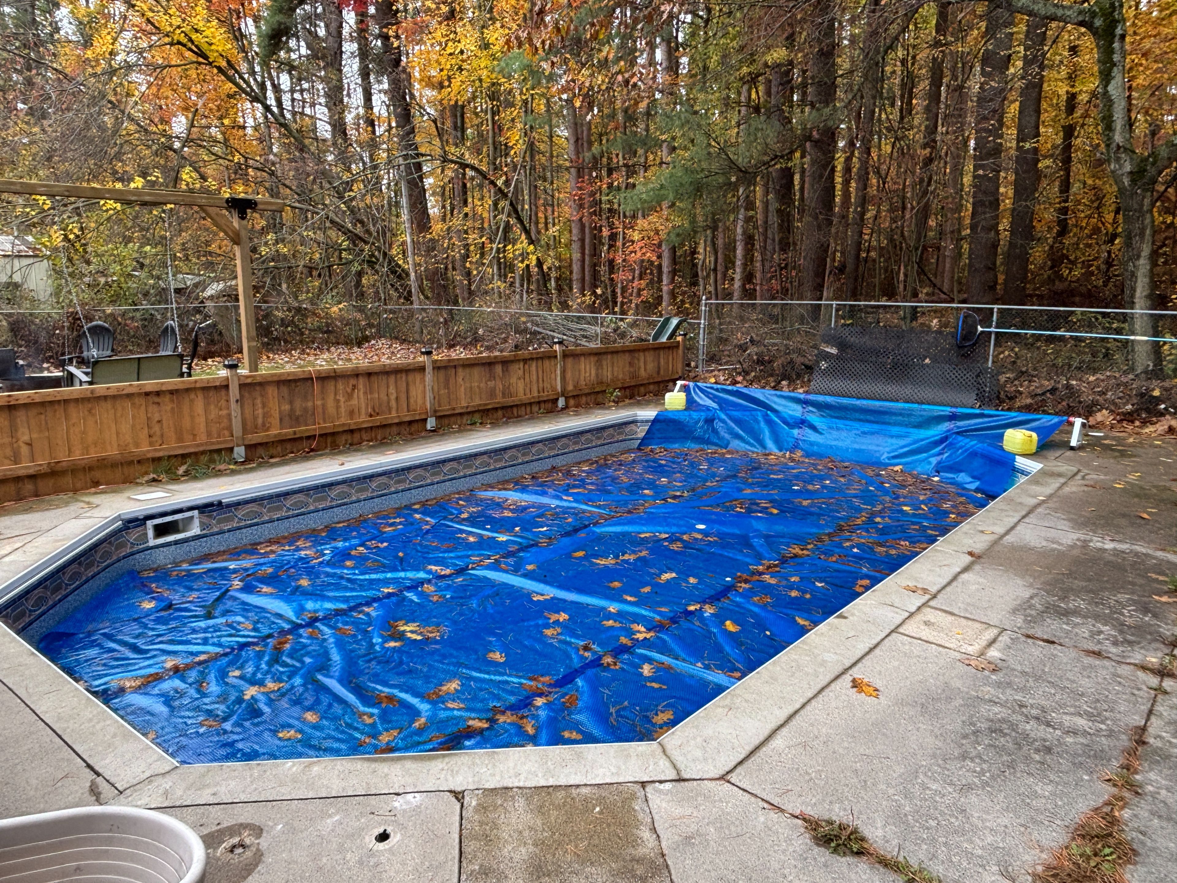 • Backyard oasis with a fire pit, pool, and relaxing deck area.